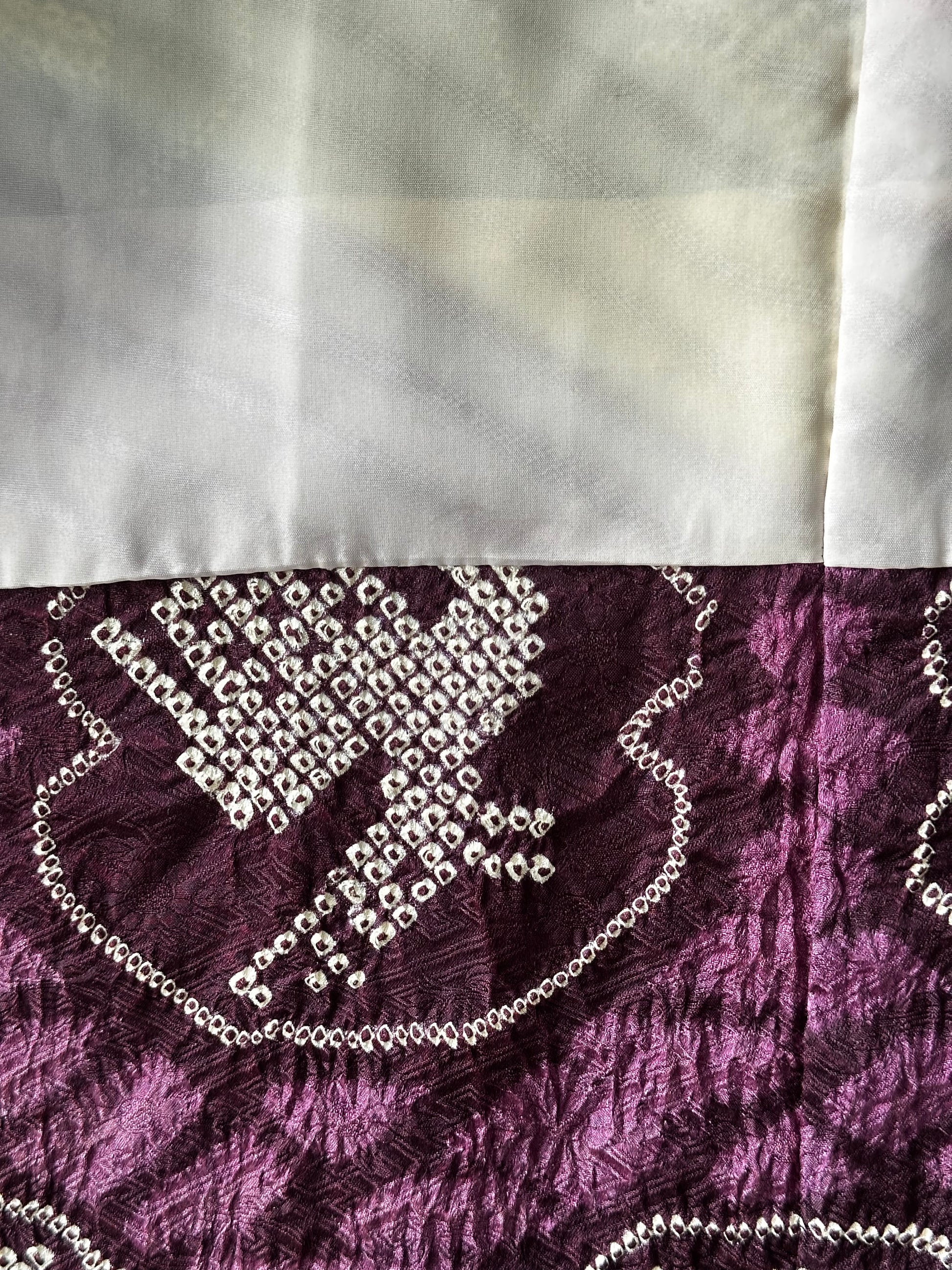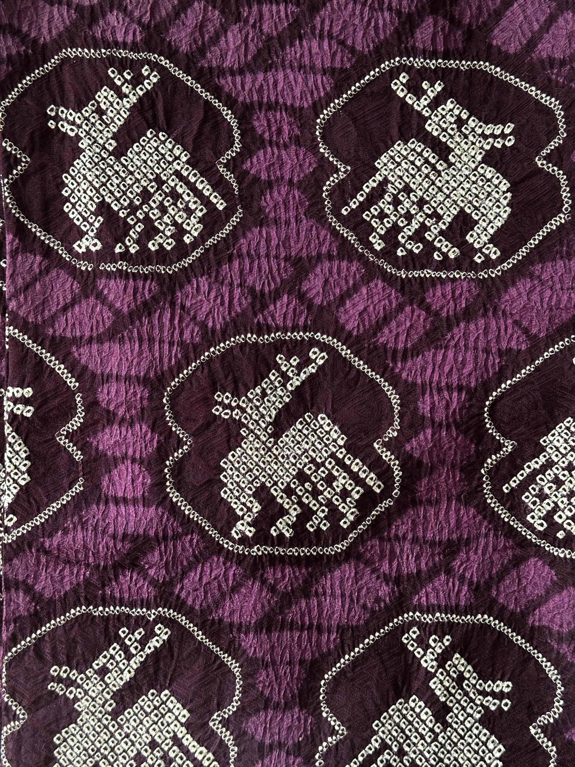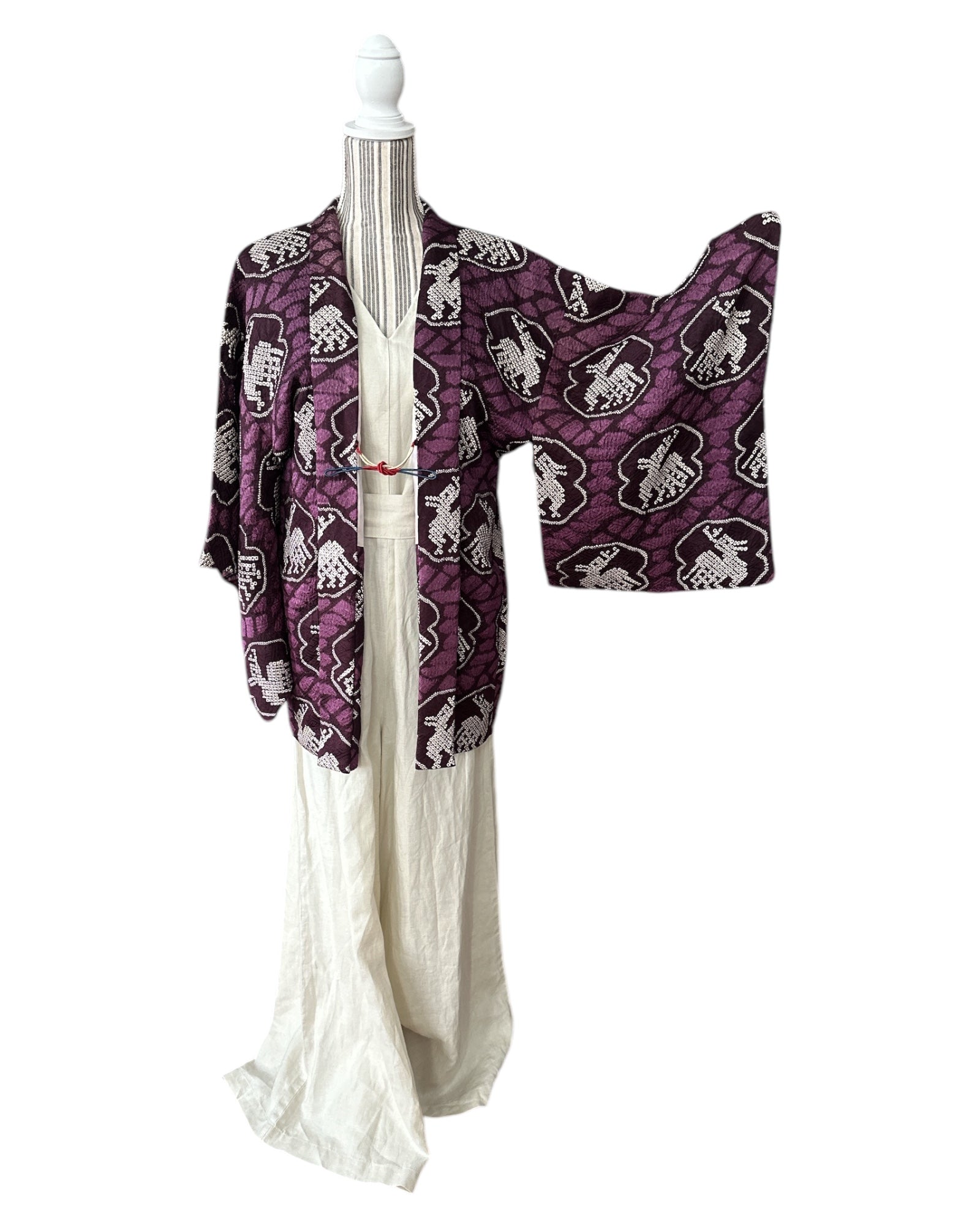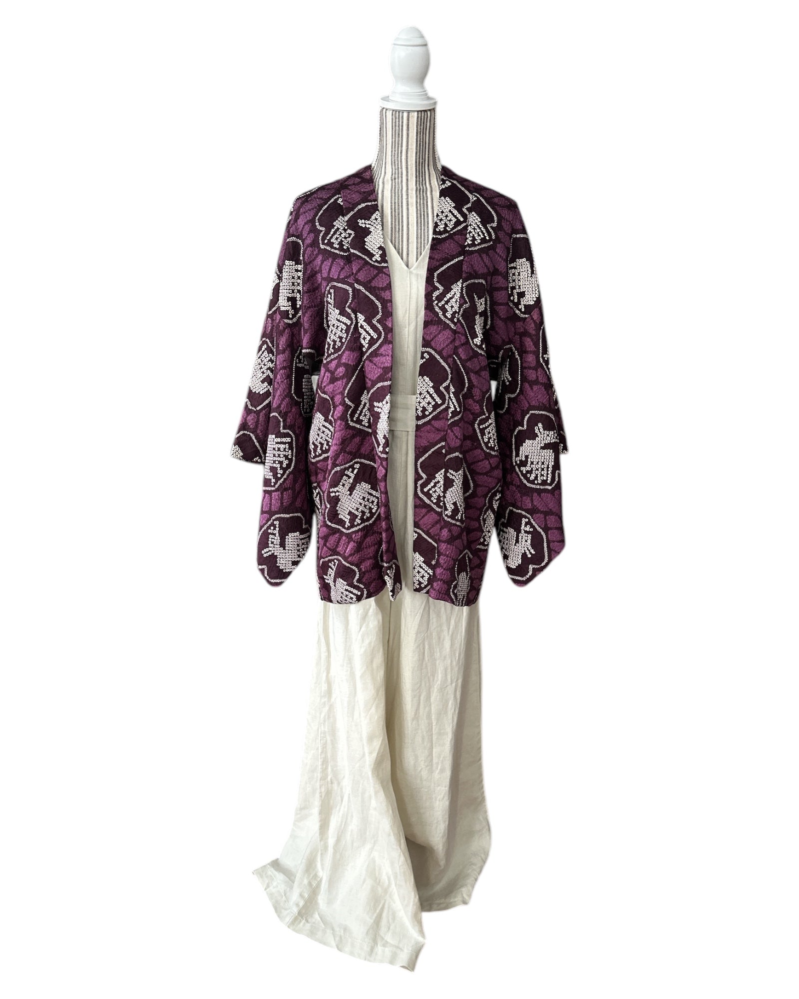 Description: This captivating vintage women’s haori is crafted from fine silk in a rich deep purplish-red (plum) hue, showcasing an intricate all-over shibori dyeing pattern. The design features a stylised mythical creature, possibly a deer or spirit-like animal, rendered in the organic softness that only traditional shibori can create.