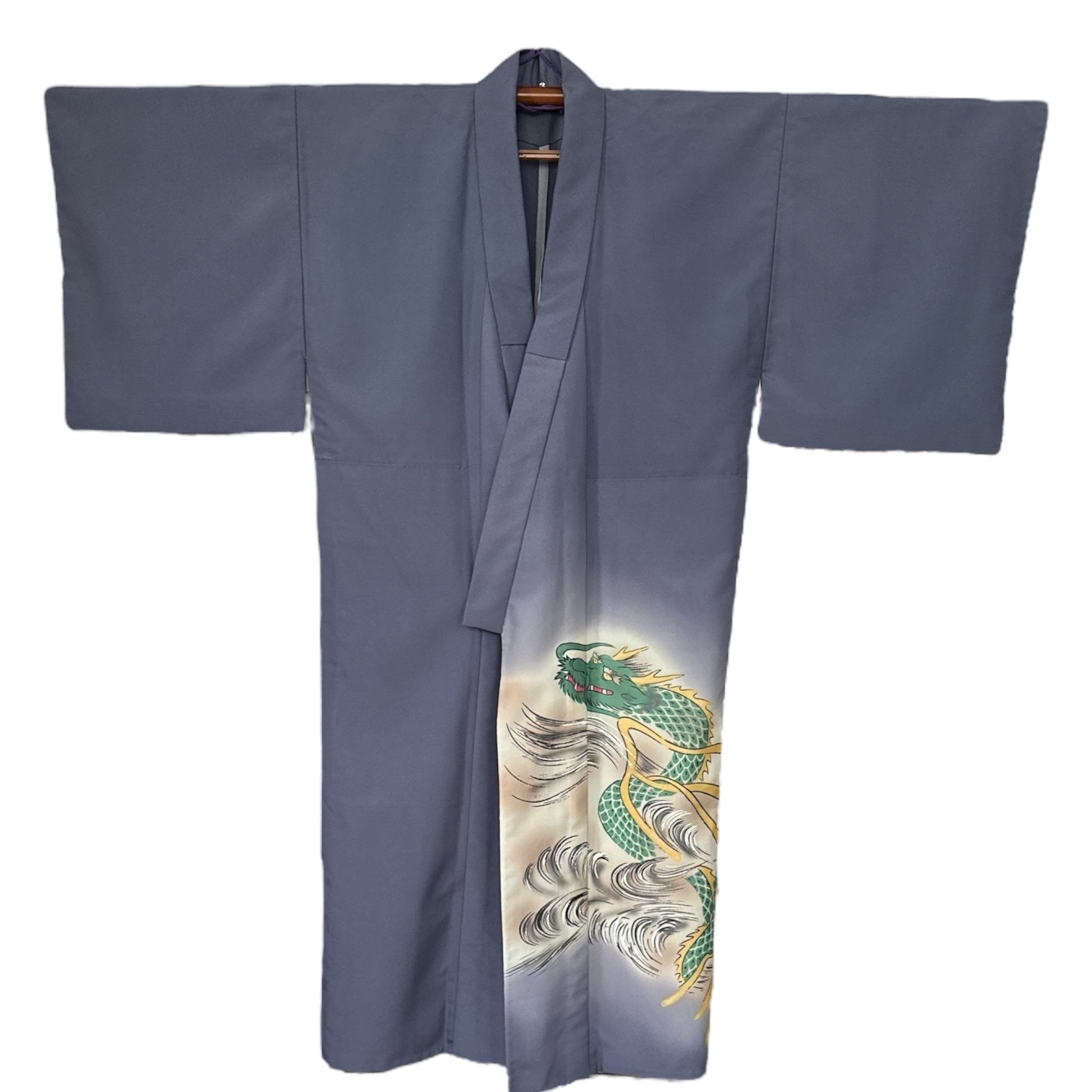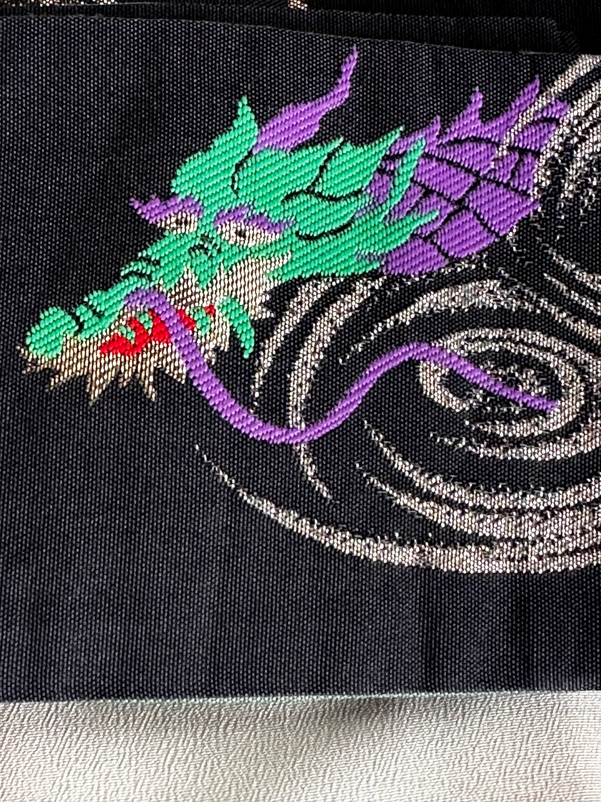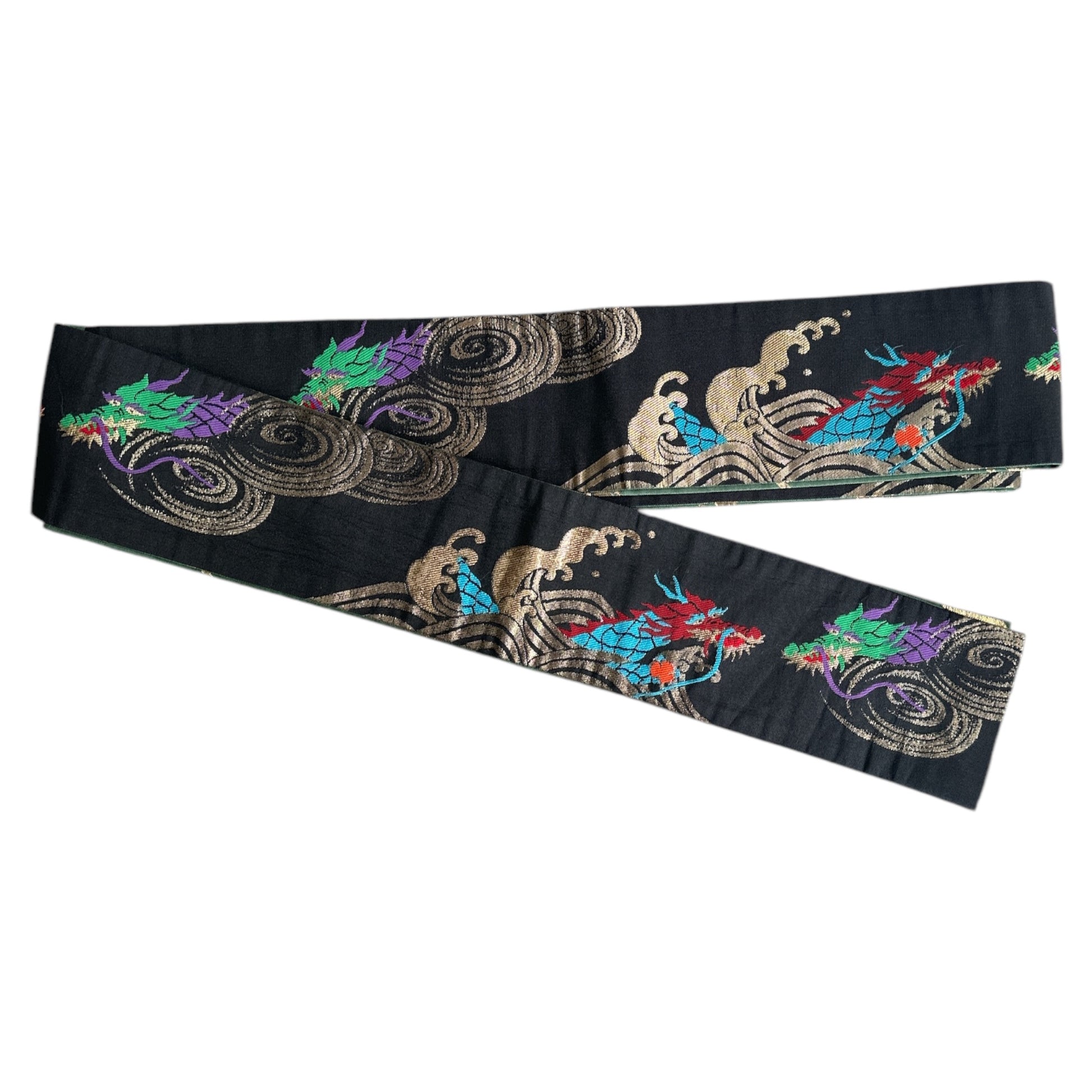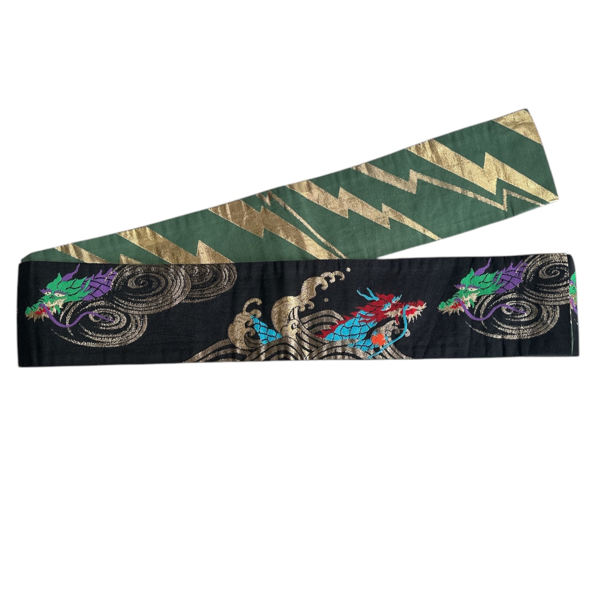 Description: This men's kimono and obi set features a striking yet refined design, originally worn for a Tachiyaku (male role) in an artistic play. The kimono showcases a painted ryū (dragon) extending from the front to the back, symbolising strength and power. It is a simple, single-layered kimono made from polyester, ensuring lightweight comfort. The accompanying obi is reversible, offering two distinct motifs. One side features a woven design of a dragons with claws or waves, emphasising dynamic movement, while the other side displays a geometric pattern of gold thunderbolts set against a rich green background, adding a bold and regal contrast. Made of silk, the obi enhances the overall elegance of the set.