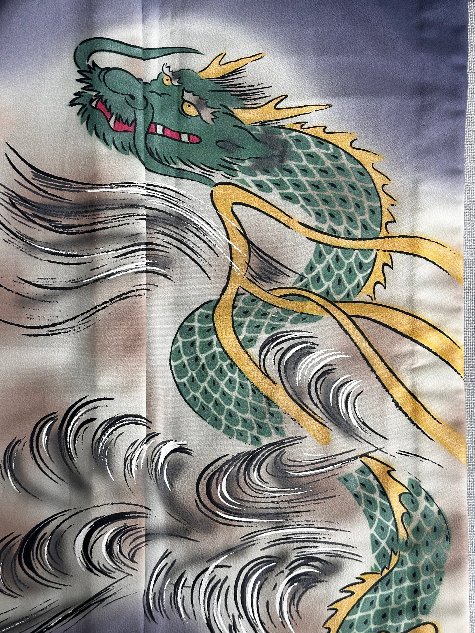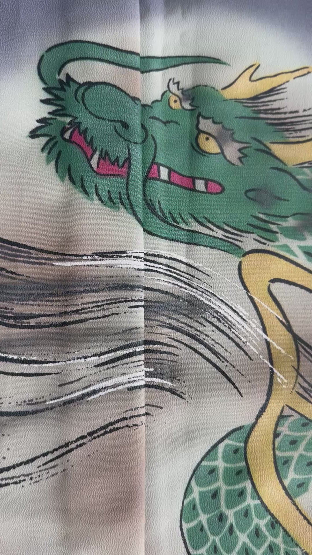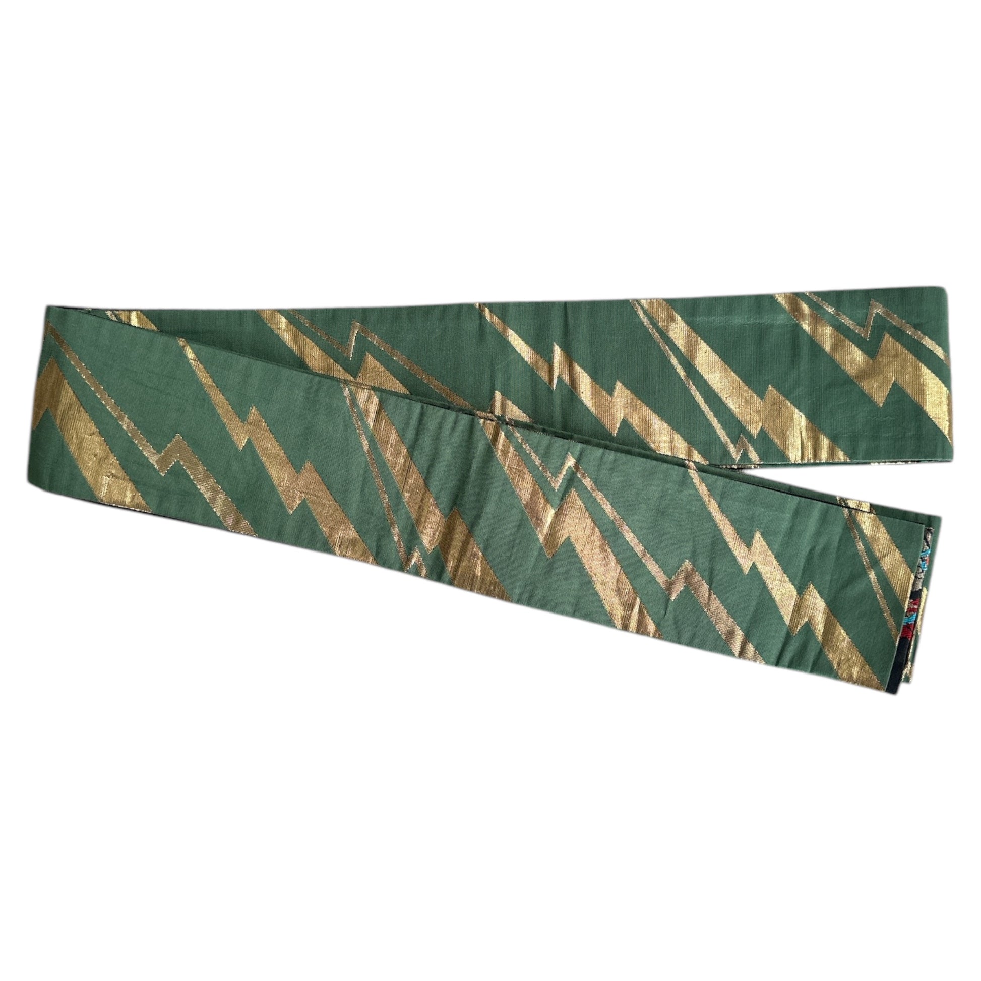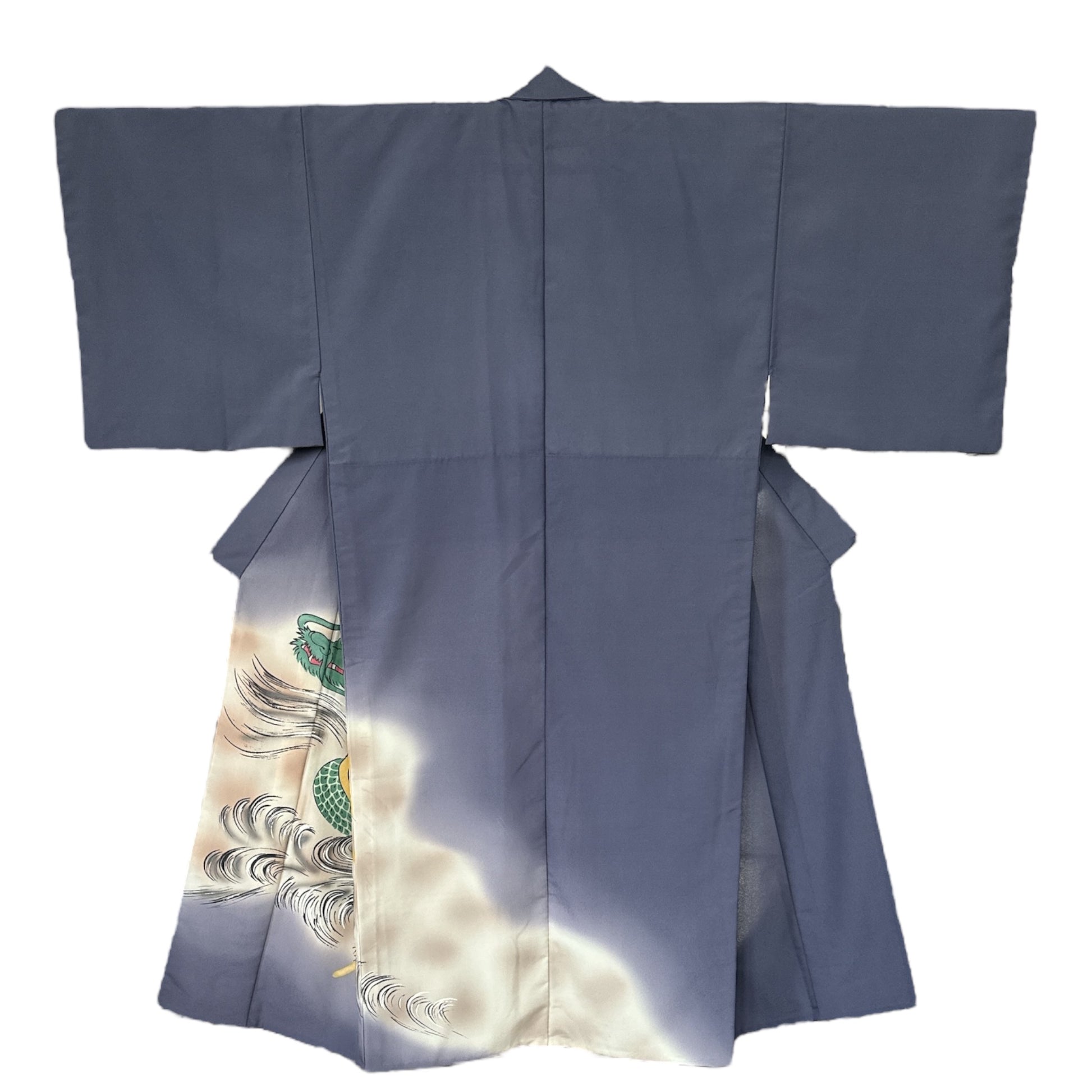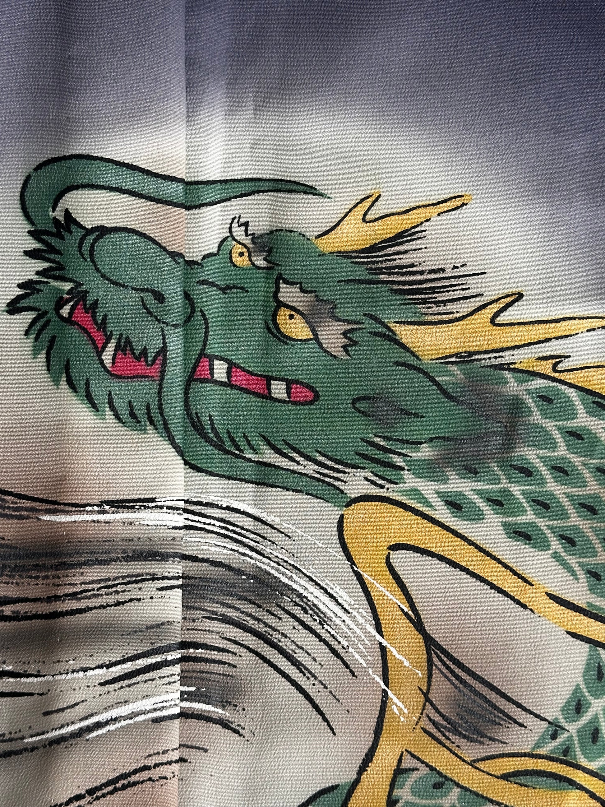 Description: This men's kimono and obi set features a striking yet refined design, originally worn for a Tachiyaku (male role) in an artistic play. The kimono showcases a painted ryū (dragon) extending from the front to the back, symbolising strength and power. It is a simple, single-layered kimono made from polyester, ensuring lightweight comfort. The accompanying obi is reversible, offering two distinct motifs. One side features a woven design of a dragons with claws or waves, emphasising dynamic movement, while the other side displays a geometric pattern of gold thunderbolts set against a rich green background, adding a bold and regal contrast. Made of silk, the obi enhances the overall elegance of the set.
