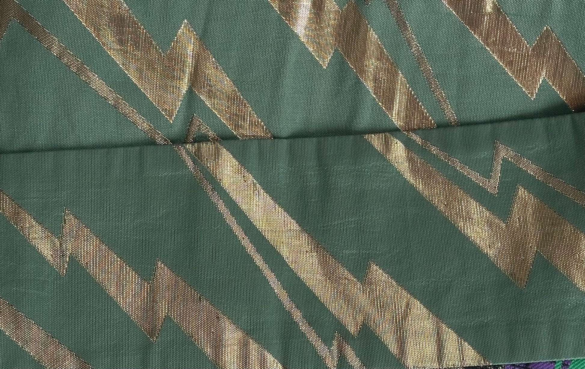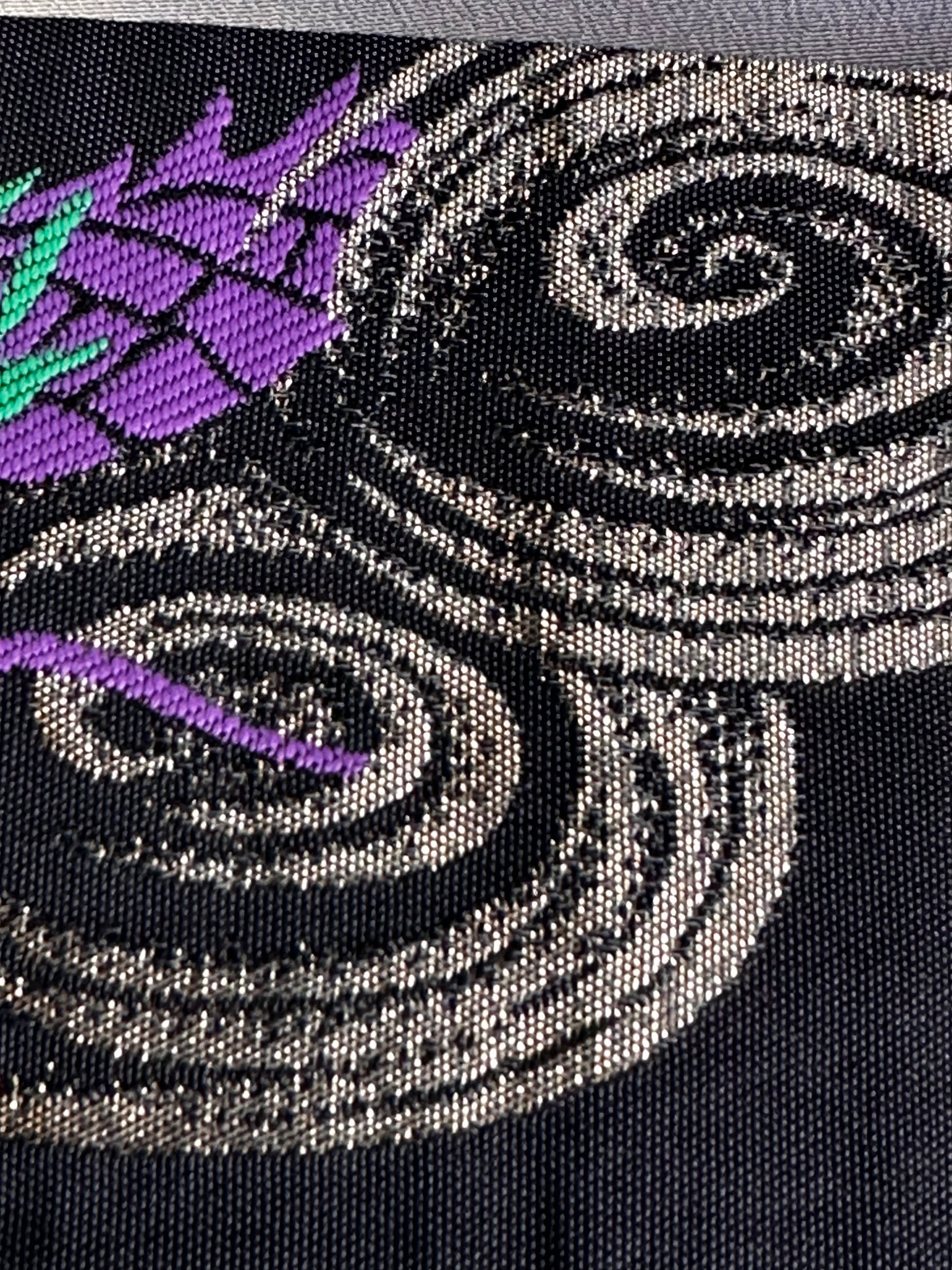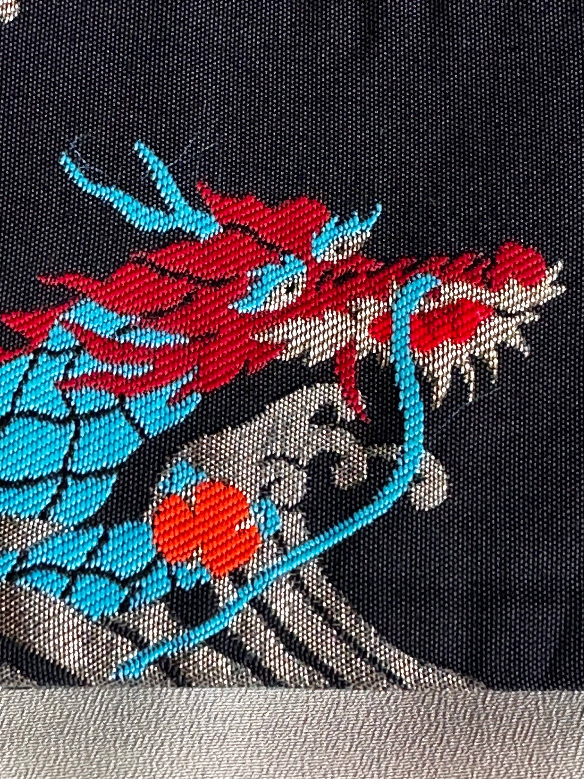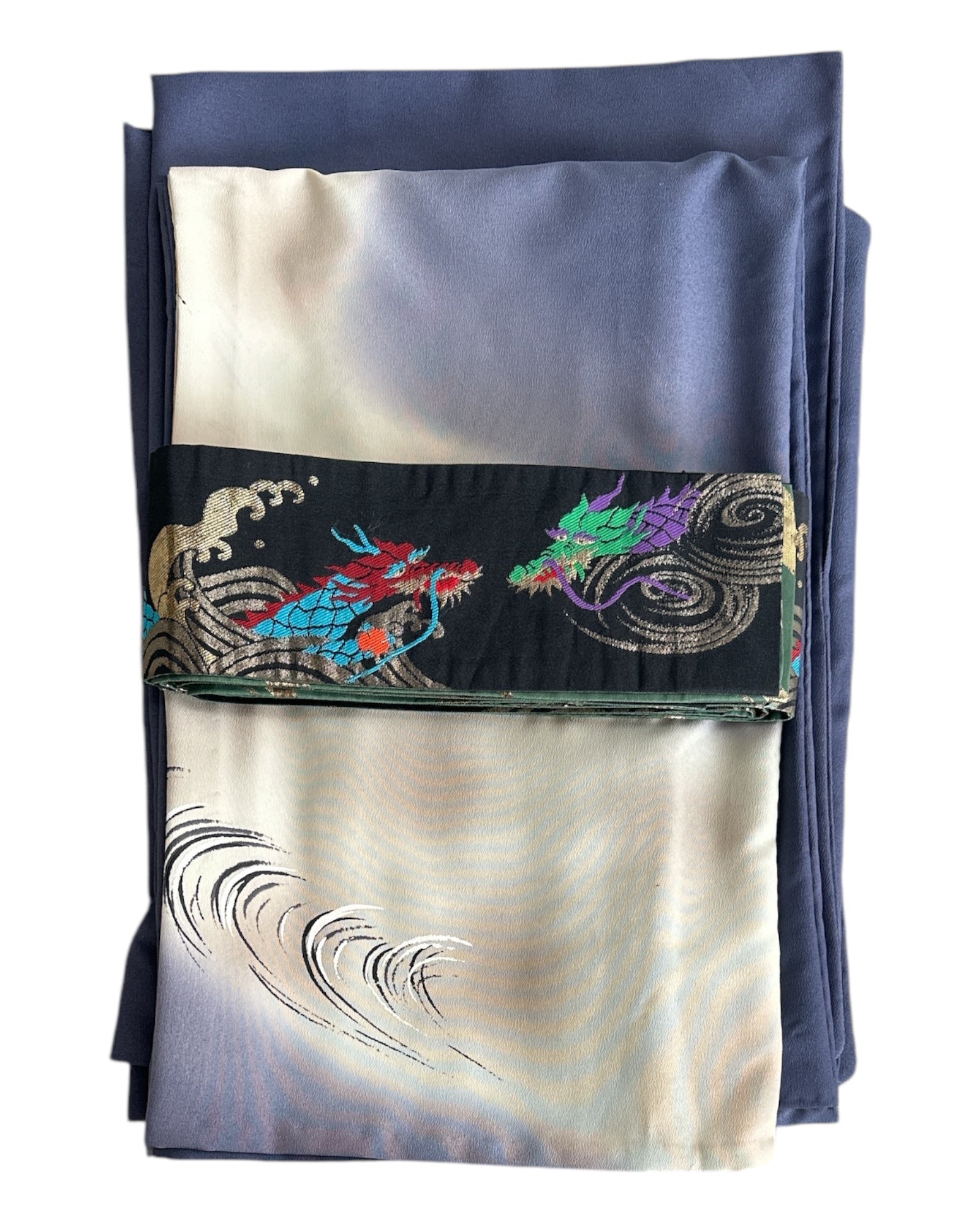 Description: This men's kimono and obi set features a striking yet refined design, originally worn for a Tachiyaku (male role) in an artistic play. The kimono showcases a painted ryū (dragon) extending from the front to the back, symbolising strength and power. It is a simple, single-layered kimono made from polyester, ensuring lightweight comfort. The accompanying obi is reversible, offering two distinct motifs. One side features a woven design of a dragons with claws or waves, emphasising dynamic movement, while the other side displays a geometric pattern of gold thunderbolts set against a rich green background, adding a bold and regal contrast. Made of silk, the obi enhances the overall elegance of the set.
