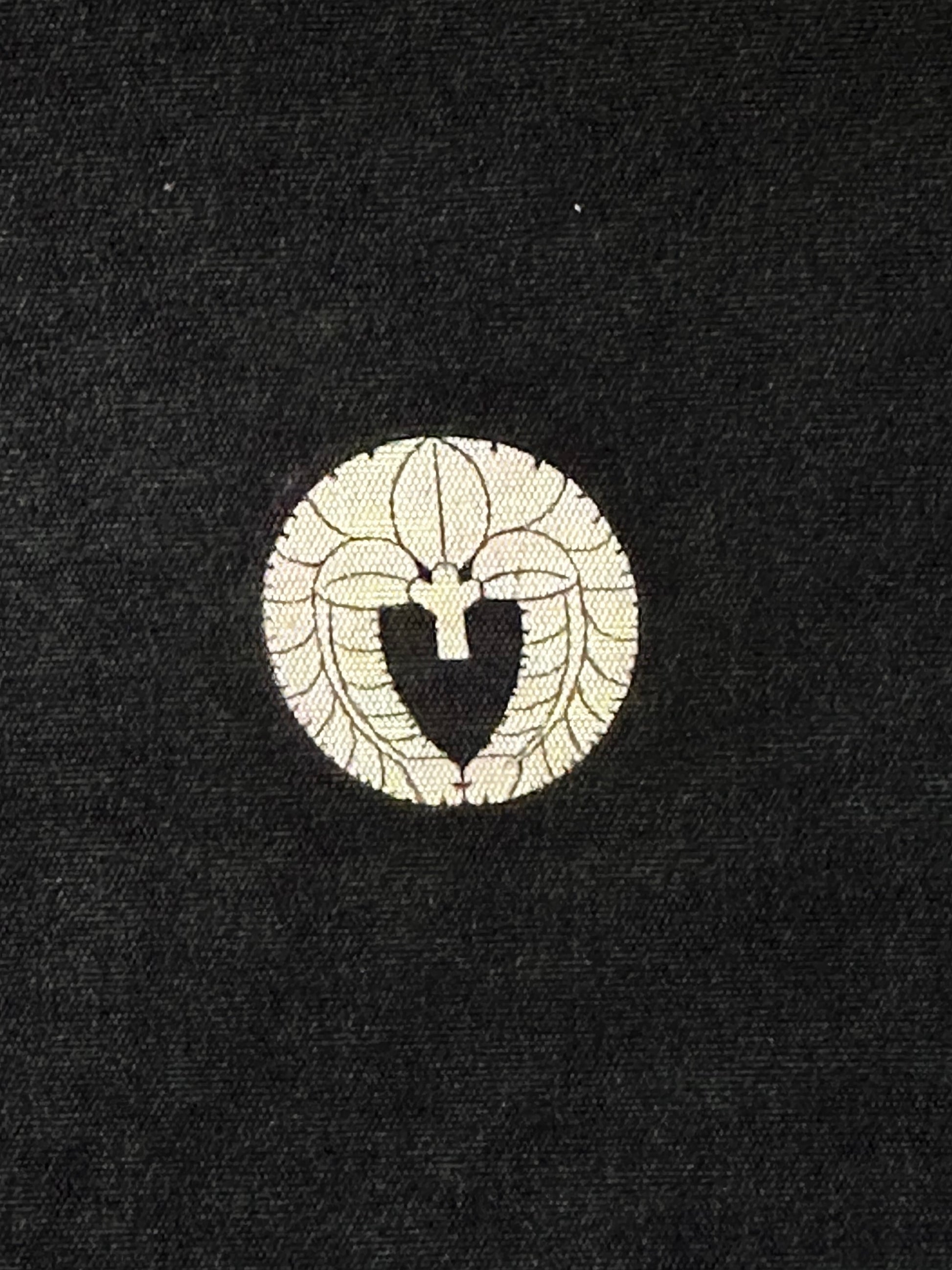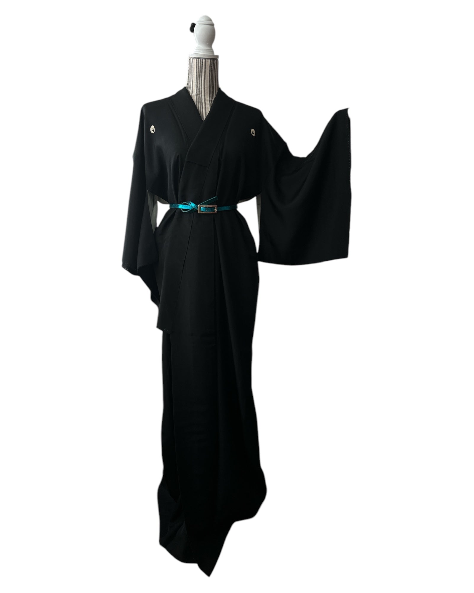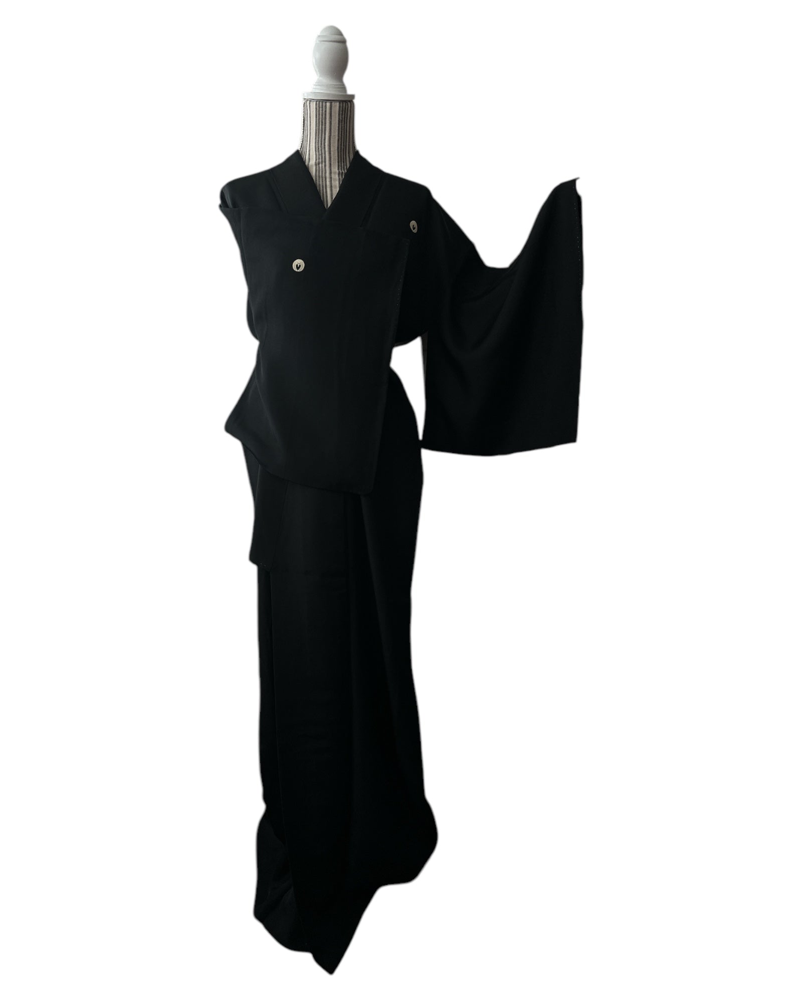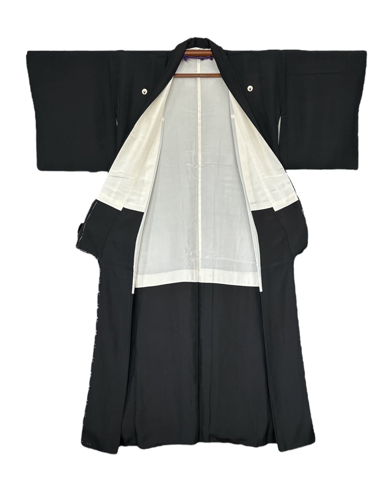 Description: This exquisite Awase Black Mofuku kimono is crafted from a softer silk, offering a light and graceful drape perfect for formal occasions. The deep black color of the kimono is timeless and elegant, making it a perfect choice for traditional wear. Embellished with five Sagari Fuji montsuki (family crests), symbolizing noble lineage and strength, this kimono is adorned with the Sagari Fuji (ascending wisteria) motif, which represents elegance, beauty, and the passing of time. The Awase style, with its lined construction, provides warmth and structure, ideal for more formal settings. This kimono is both sophisticated and versatile, maintaining its status as a beautiful piece for ceremonial occasions.