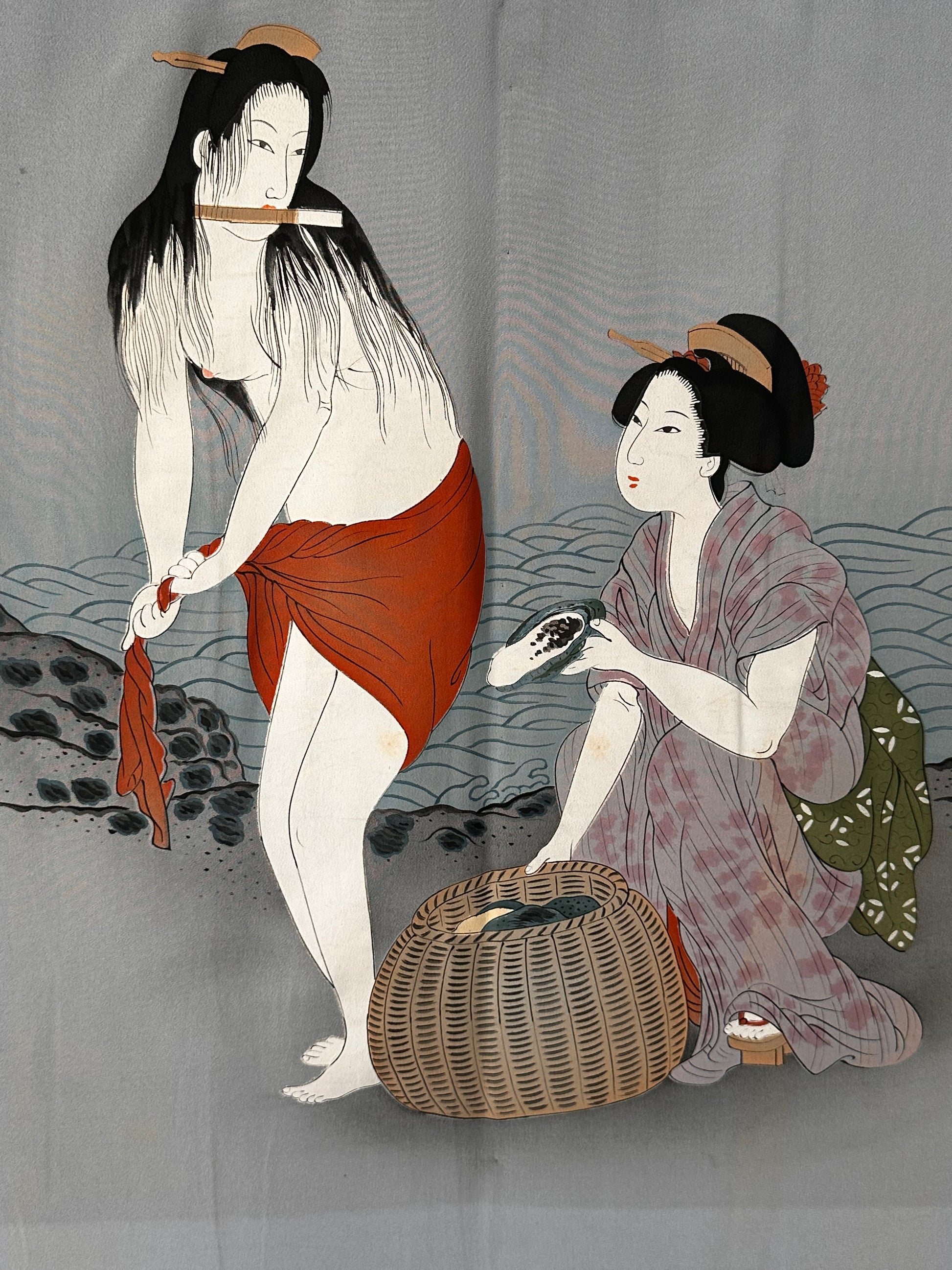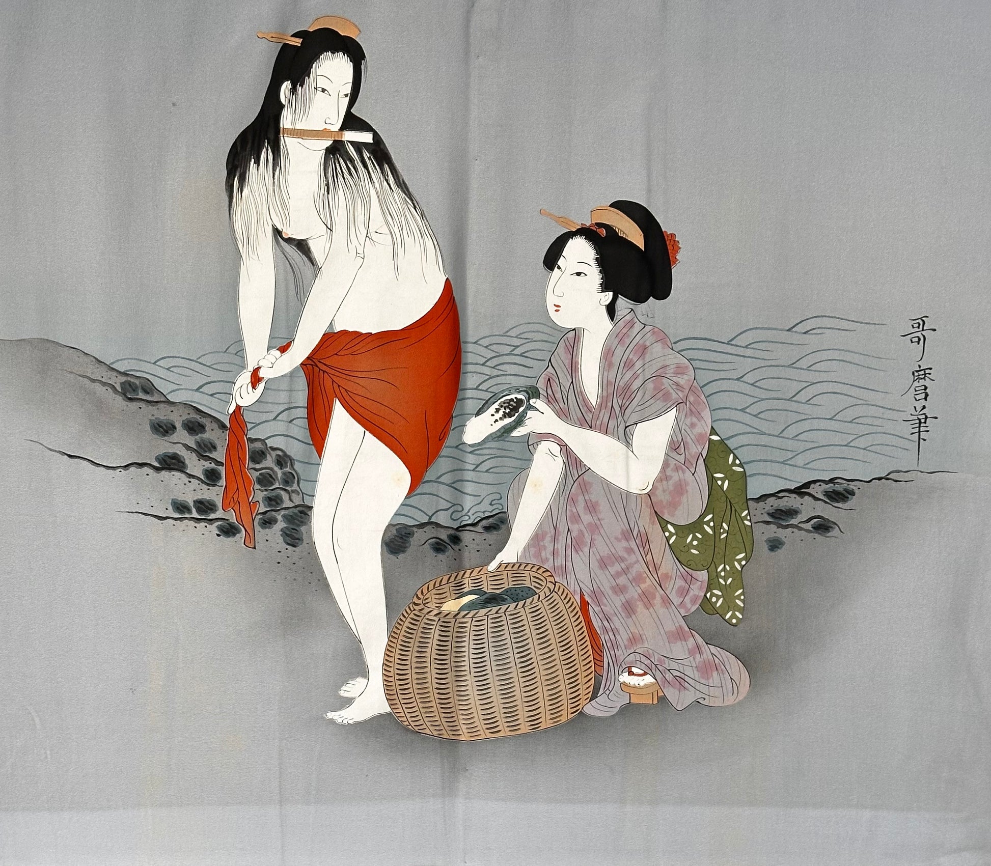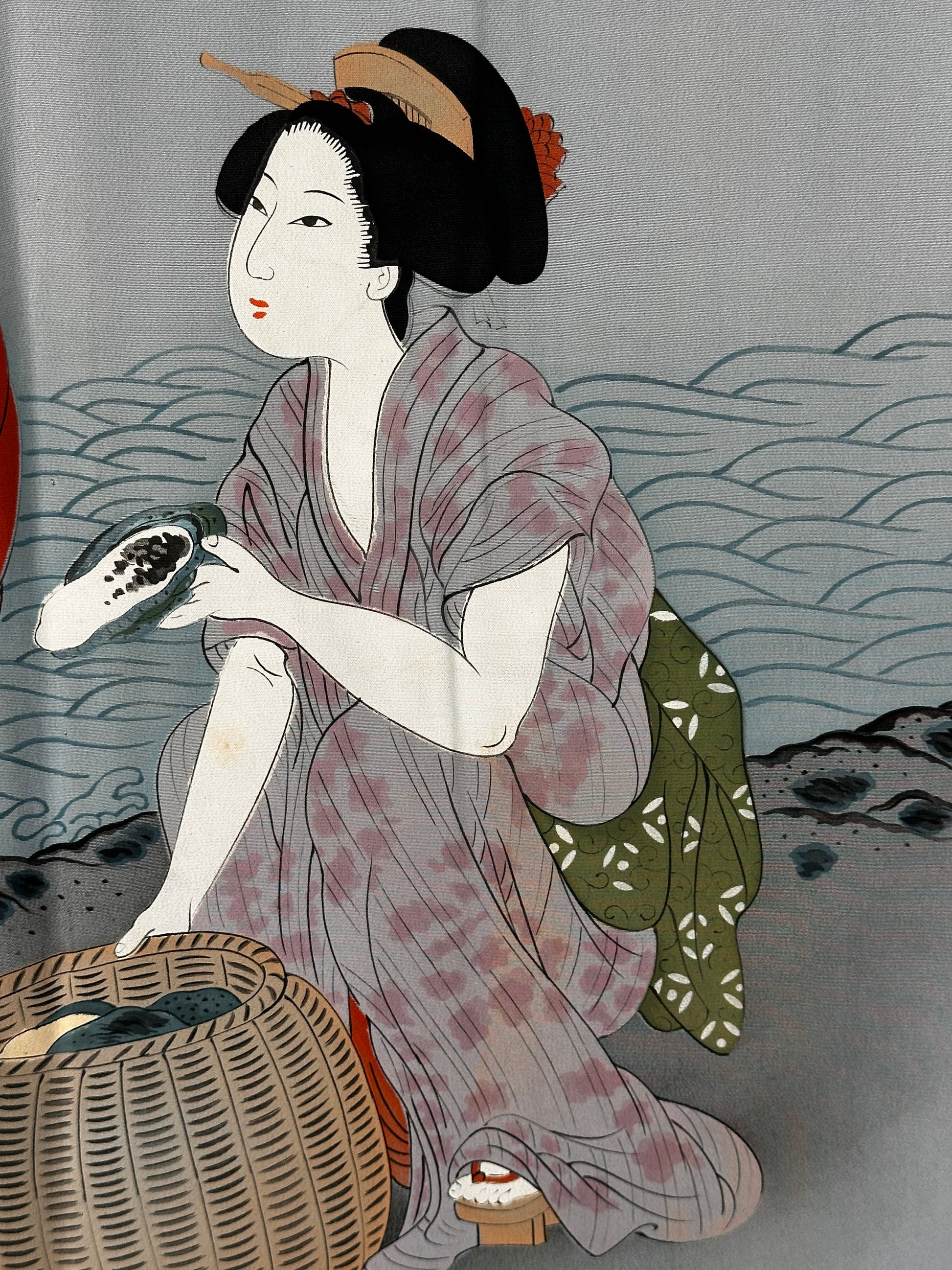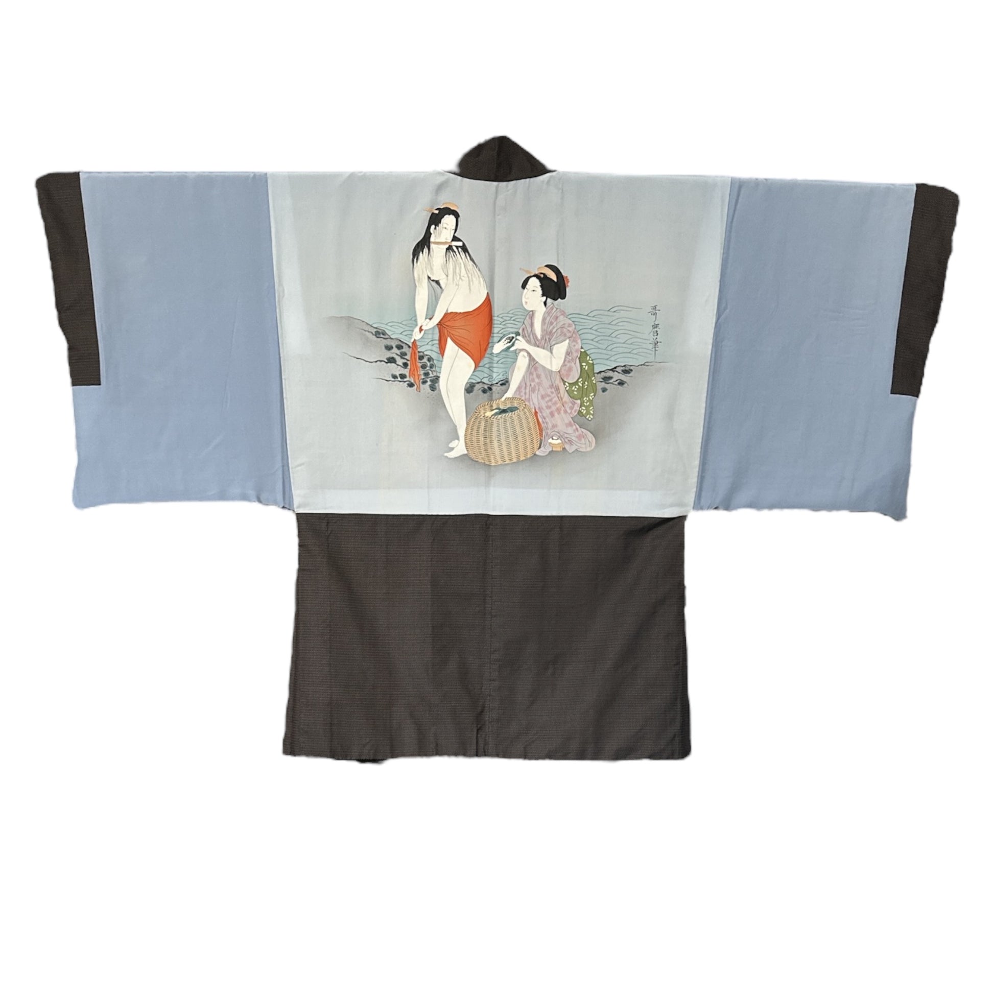 The artwork portrays two Ama (pearl divers) in a serene yet vivid moment: one has just emerged from the water, drying herself with a cloth, while the other, dressed in a kimono, carefully works with a shell beside a basket full of collected treasures. The scene is rendered in the delicate yet expressive style of Ukiyo-e (Japanese woodblock print and painting), capturing the grace and resilience of these legendary women. The artist’s signature is also present, enhancing its uniqueness and value. In good condition, this haori is a remarkable blend of traditional craftsmanship, storytelling, and artistic beauty, making it a standout collector’s piece or a refined addition to any wardrobe.