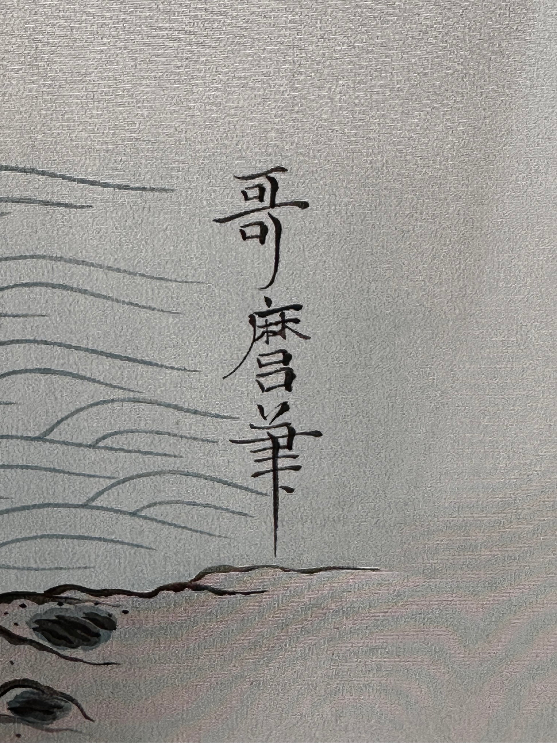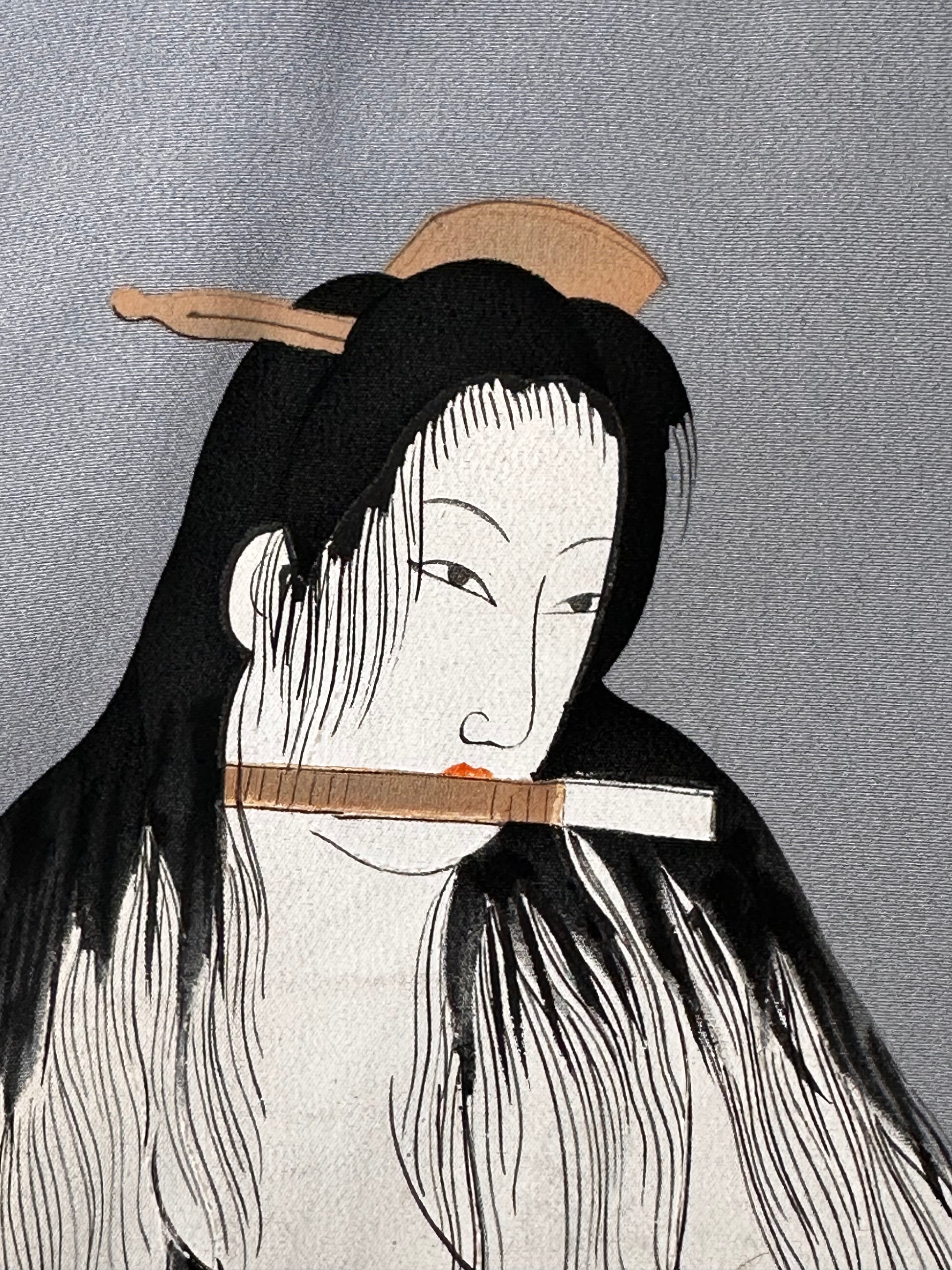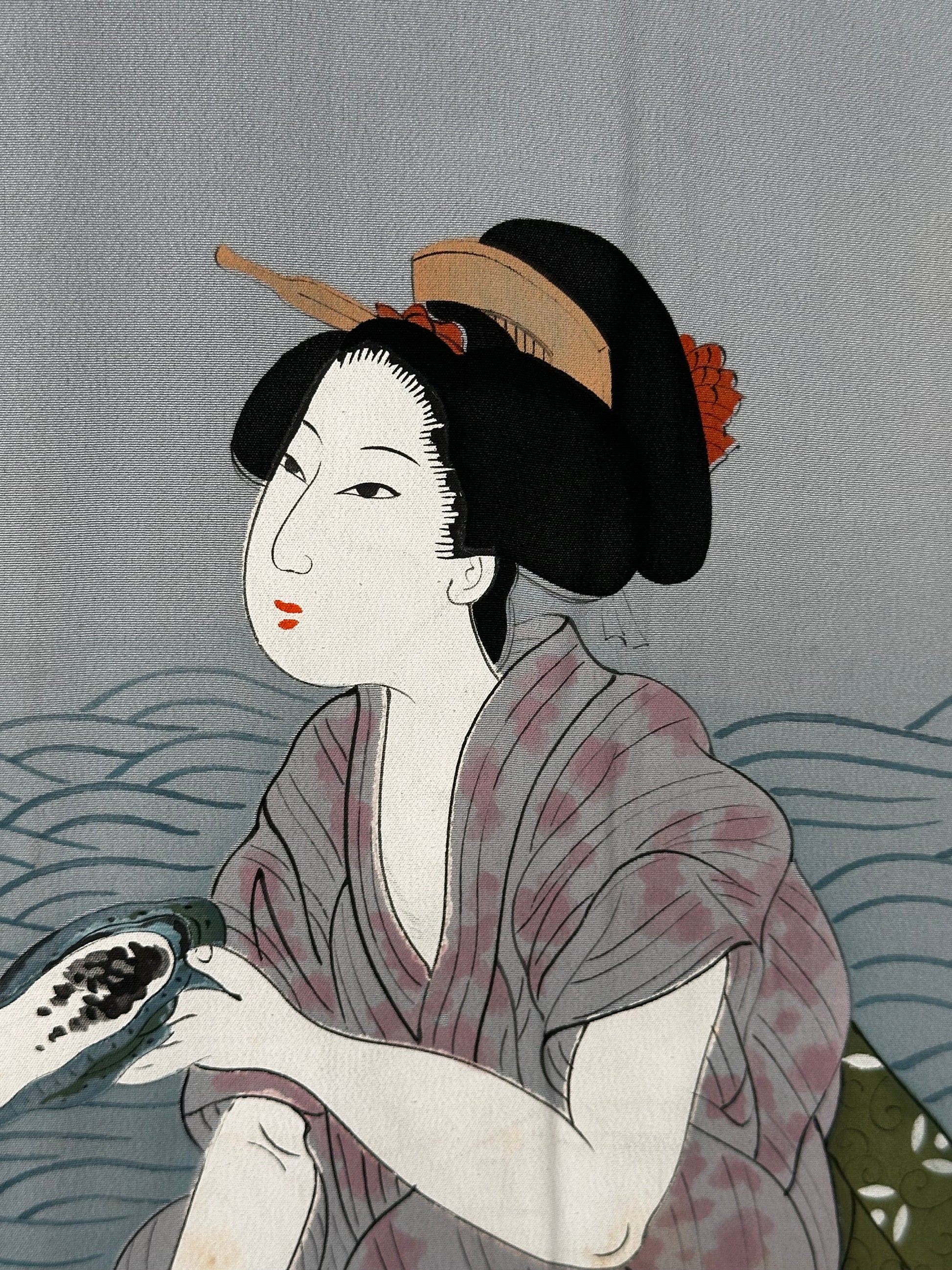 Lining: Light blue silk with hand-painted Ukiyo-e scene