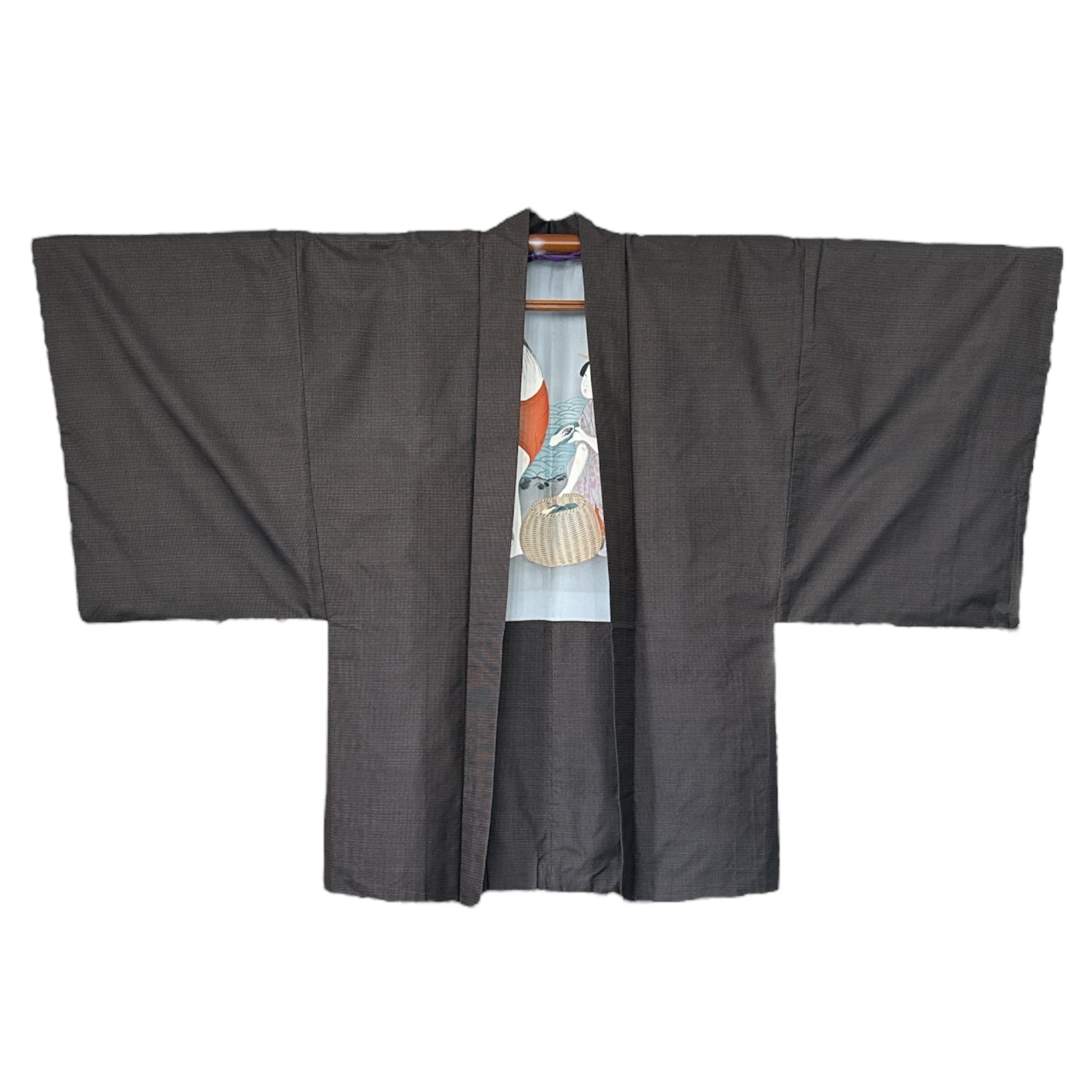 Description: This exquisite men’s haori is crafted from Oshima Tsumugi fabric in a refined brown with woven blue accents, known for its lightweight yet durable texture. The true artistry lies within—the light blue silk lining features a breathtaking hand-painted Ukiyo-e scene, adding depth and cultural significance to the piece.