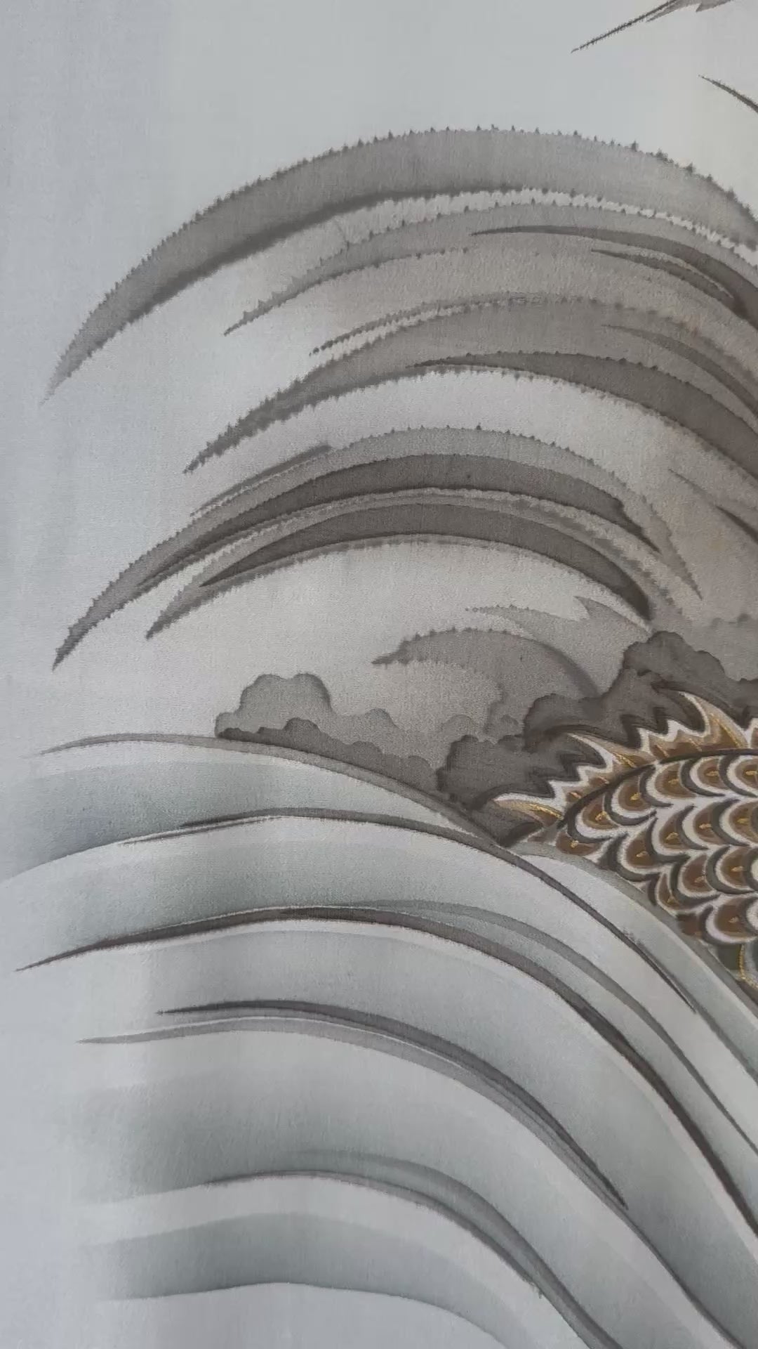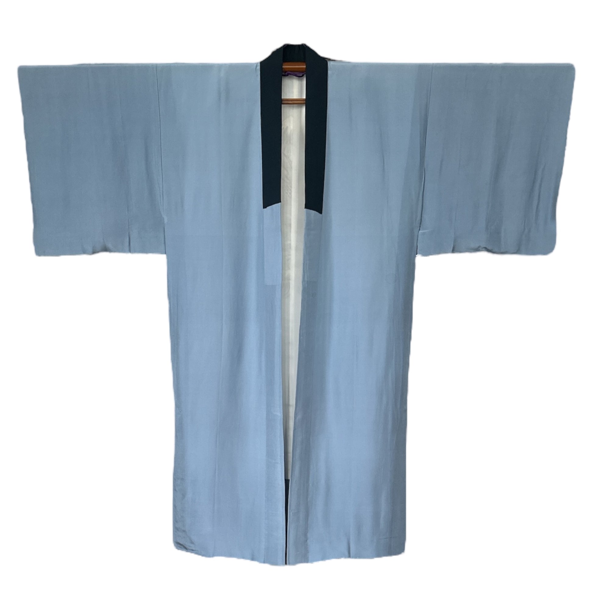 Description: This men's juban showcases a powerful design, featuring Mount Fuji with its snow-capped peak at the top center, and a powerful ryū (dragon) at the center, swirling through dynamic waves and clouds. The dragon's details are highlighted with gold accents, adding depth and luxury to the artwork. Inspired by Sumie (Japanese ink wash) painting, the artwork symbolises strength, energy, and nature, blending mythology with raw power. The juban is made from soft, high-quality silk, with a navy blue collar adding a refined touch. It is in vintage, good condition, offering a timeless and bold statement.