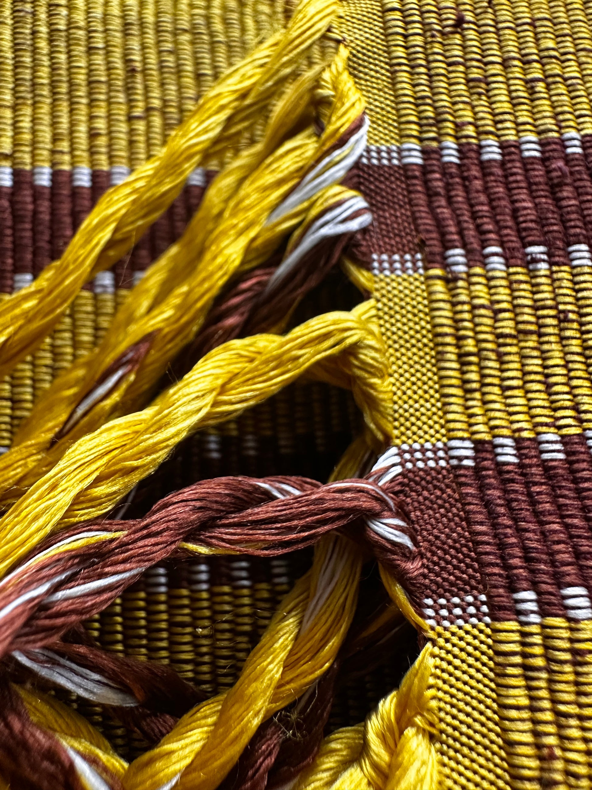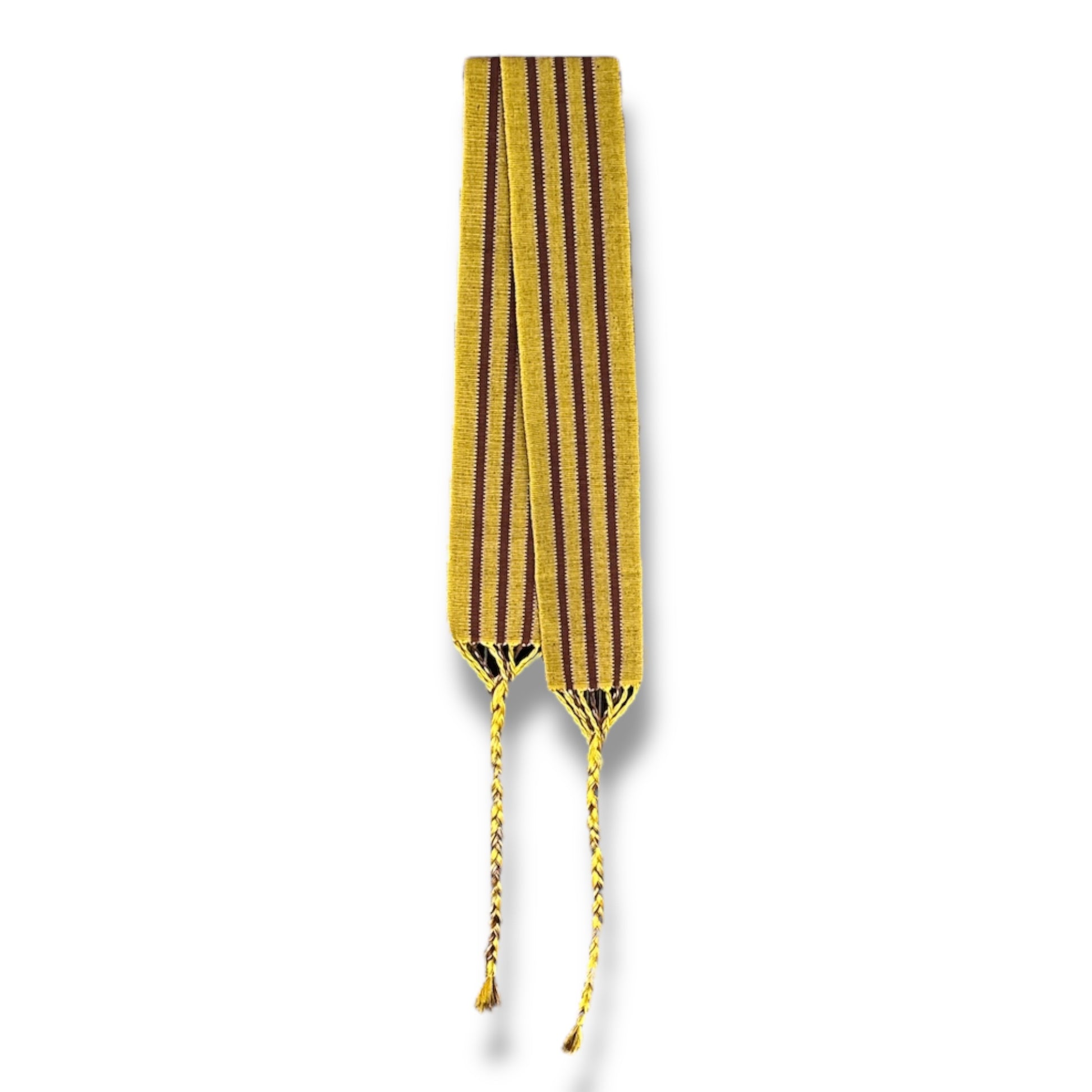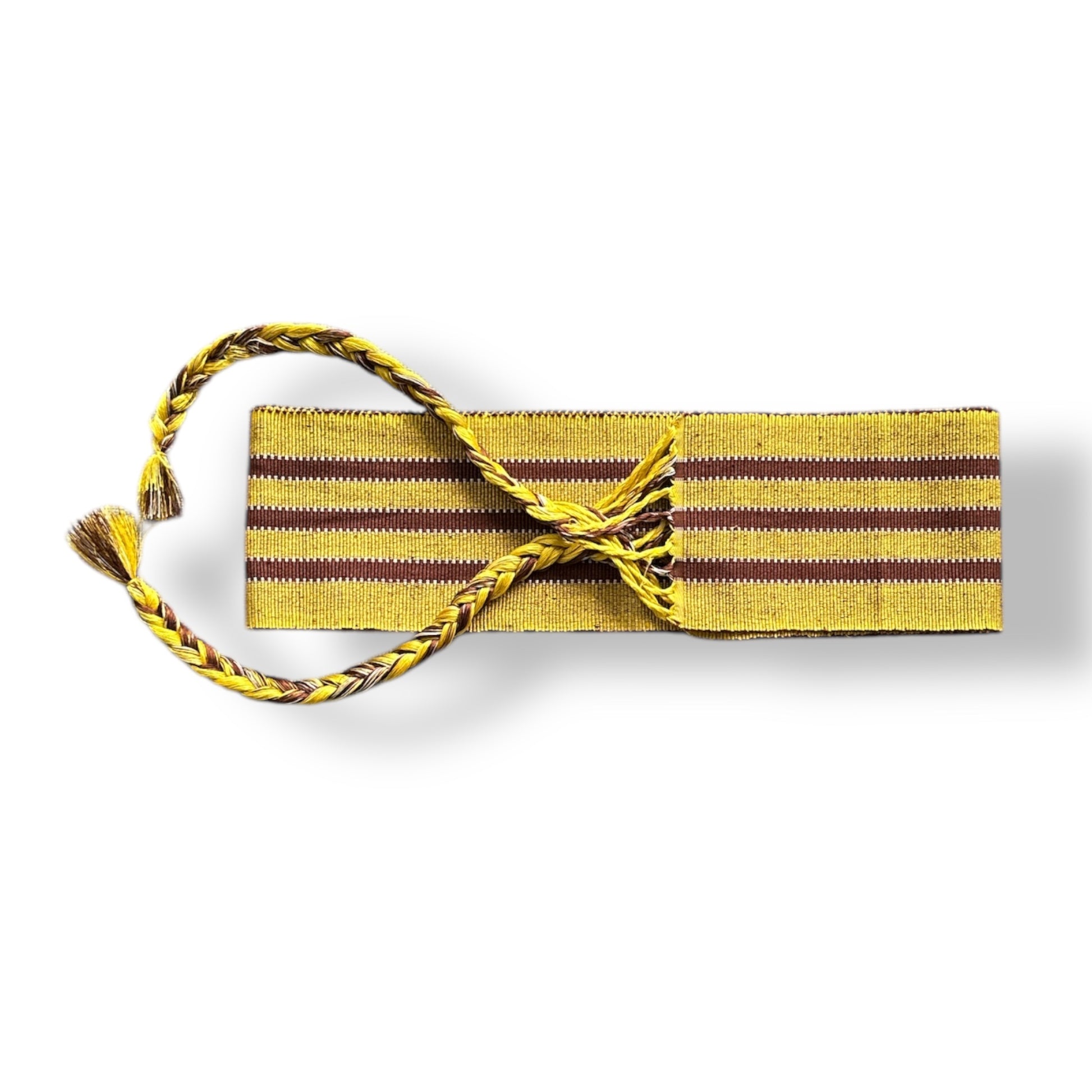 Description: This Kakuhanba Obi (half-width obi) for men is crafted from fine woven silk, offering a refined and luxurious finish. The obi features a sophisticated blend of yellow, golden, brown, and white threads, with yellow-golden and brown tones standing out as the main colors. Tassels are elegantly attached to each end, adding a touch of traditional flair. This piece is a rare find, in exceptional condition, showcasing a timeless design that exudes both craftsmanship and style. Perfect for formal occasions or as a statement piece to complement any traditional ensemble.