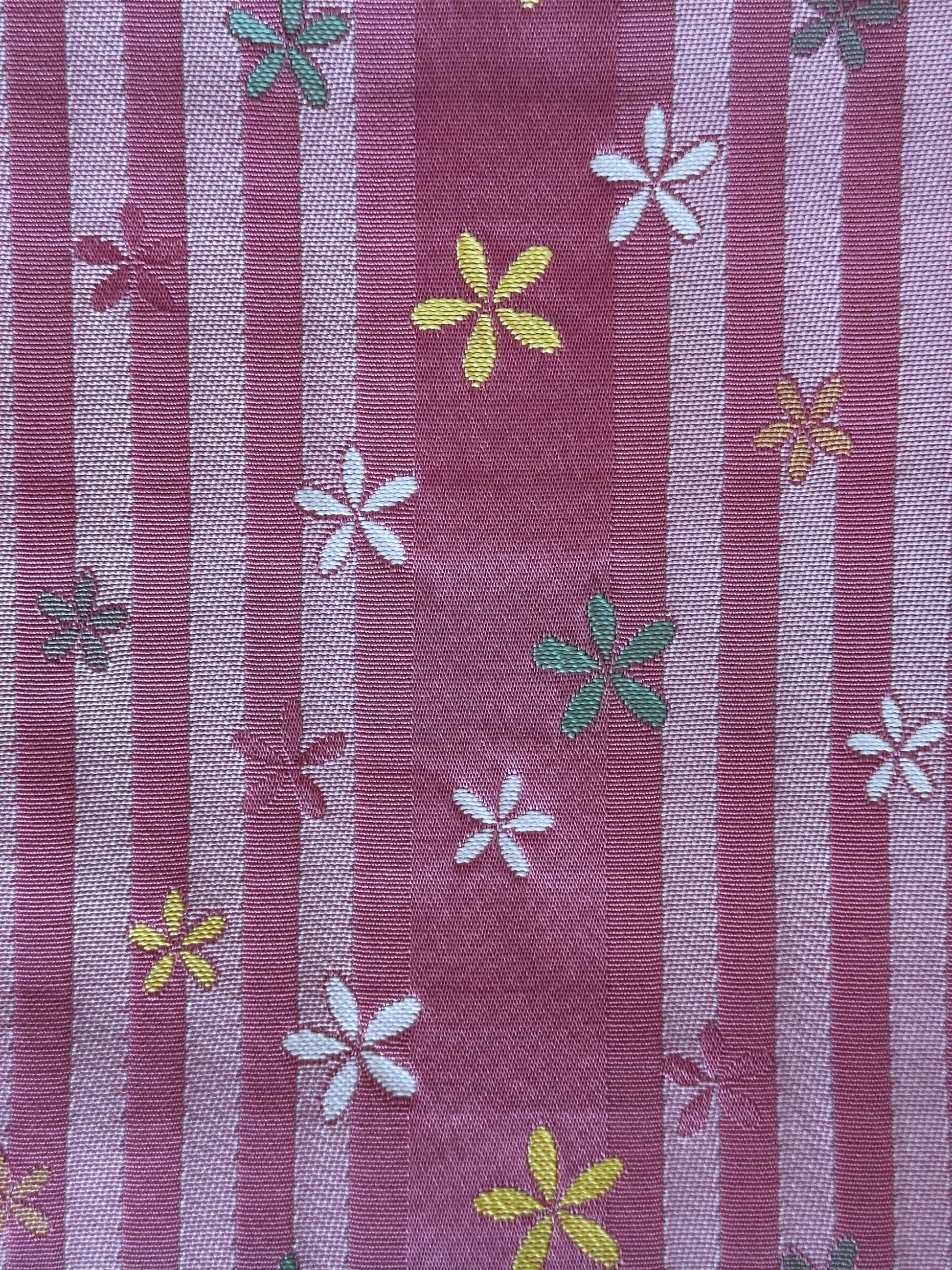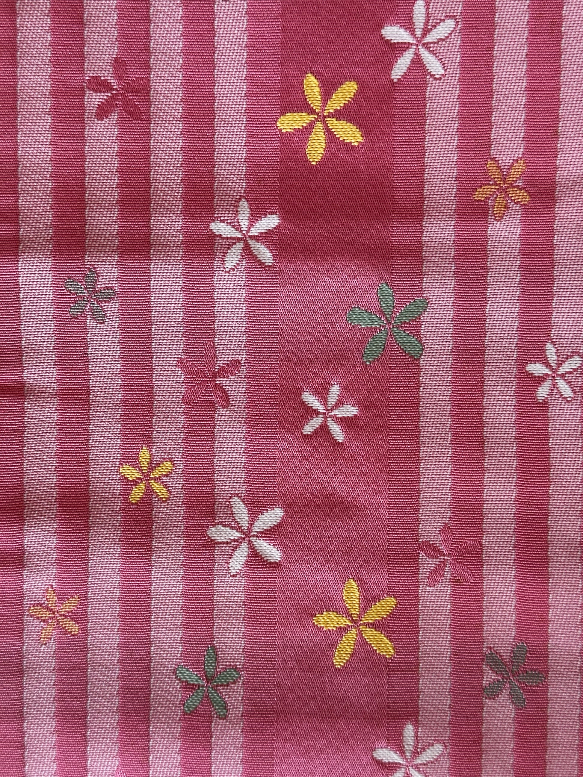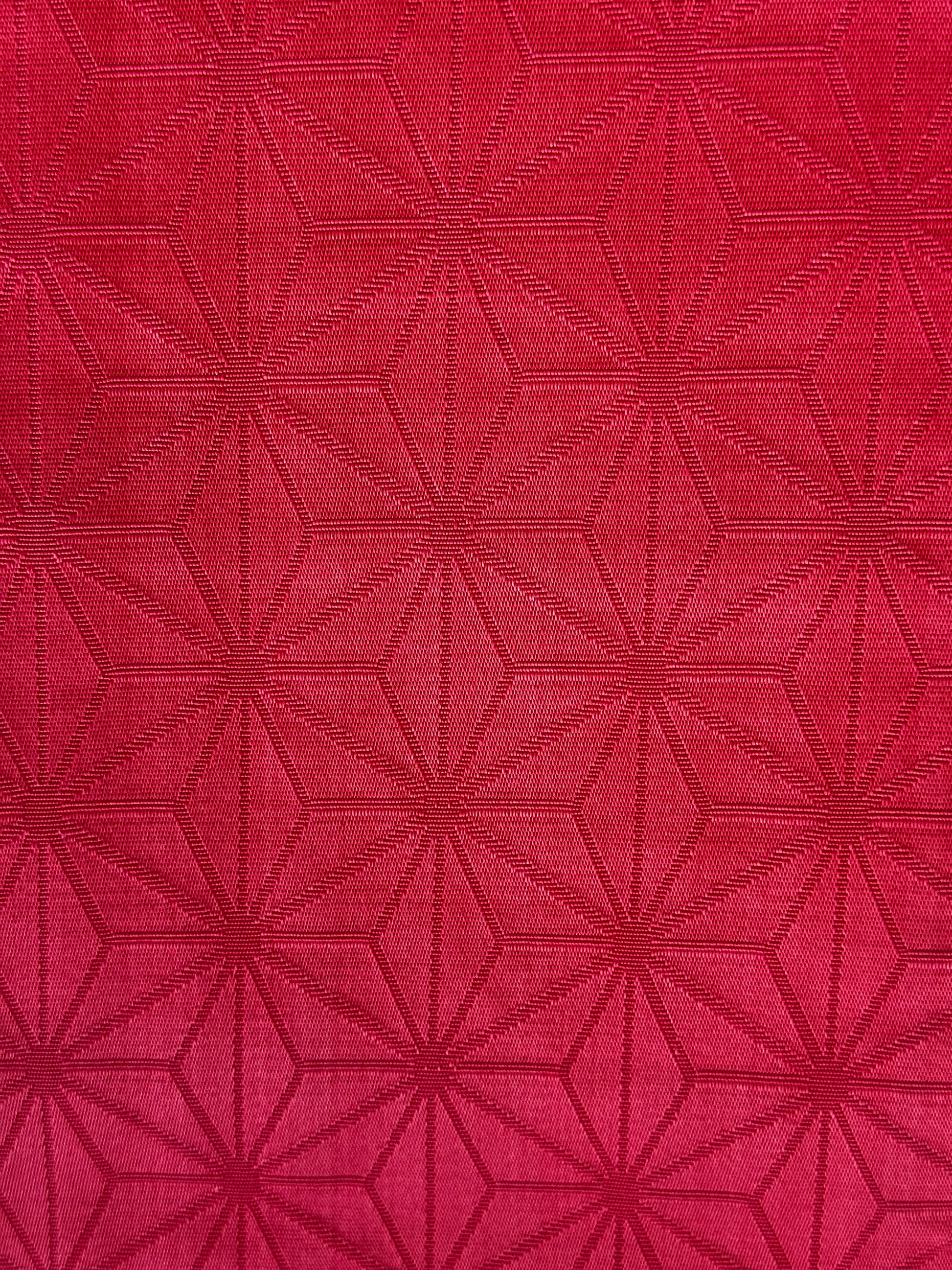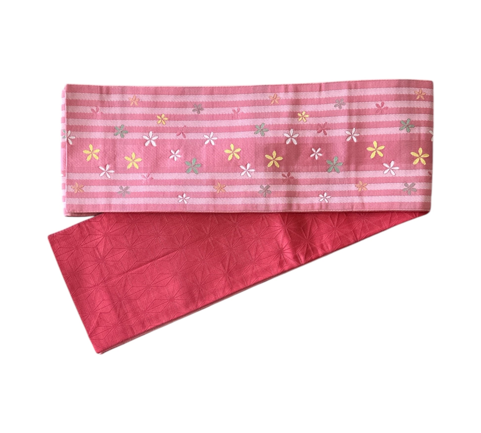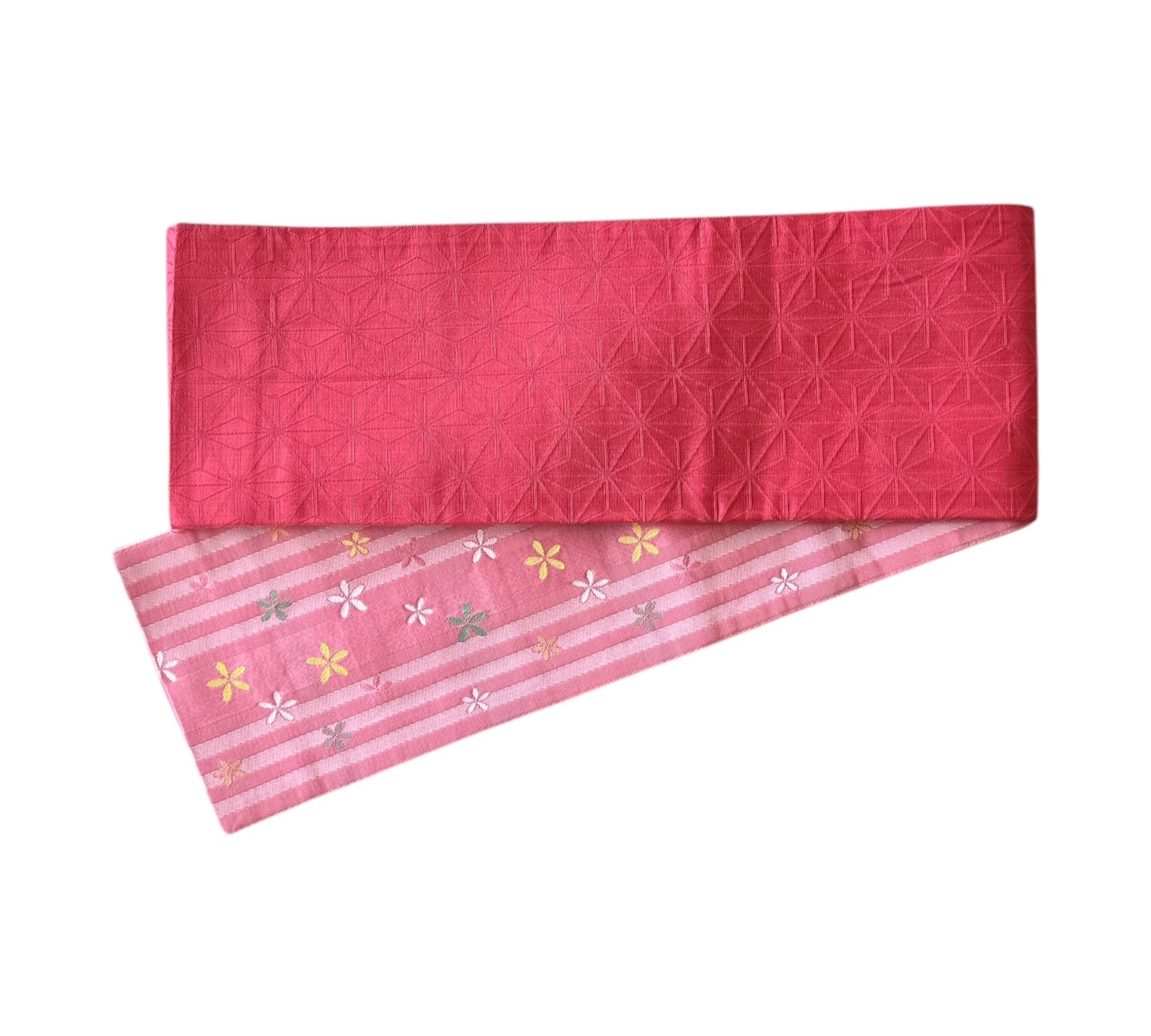 Description: Soft, vibrant, and full of seasonal charm, this hanhaba obi is a joyful blend of traditional patterns and gentle color play. One side features a salmon pink base woven with the classic Asanoha (hemp leaf) motif, symbolising growth, protection, and vitality—a timeless design full of quiet strength and elegance.