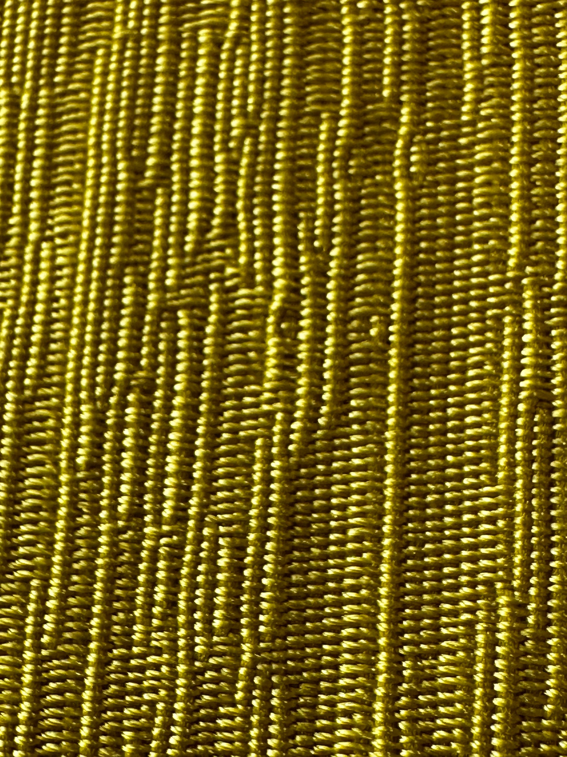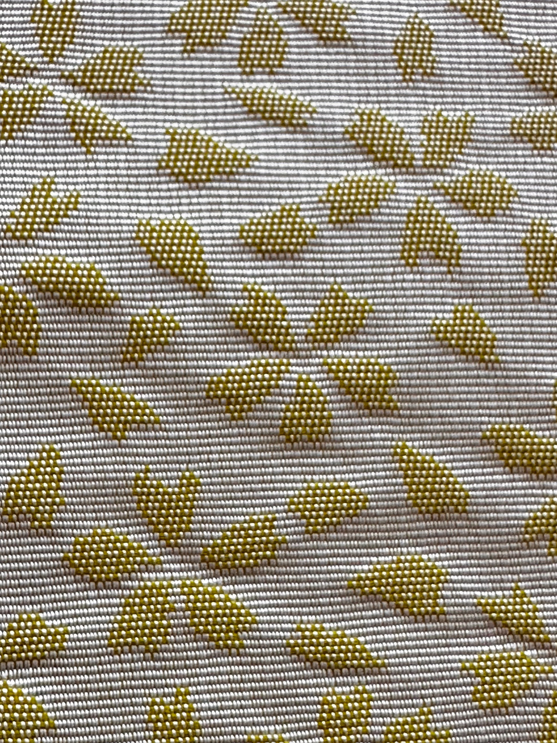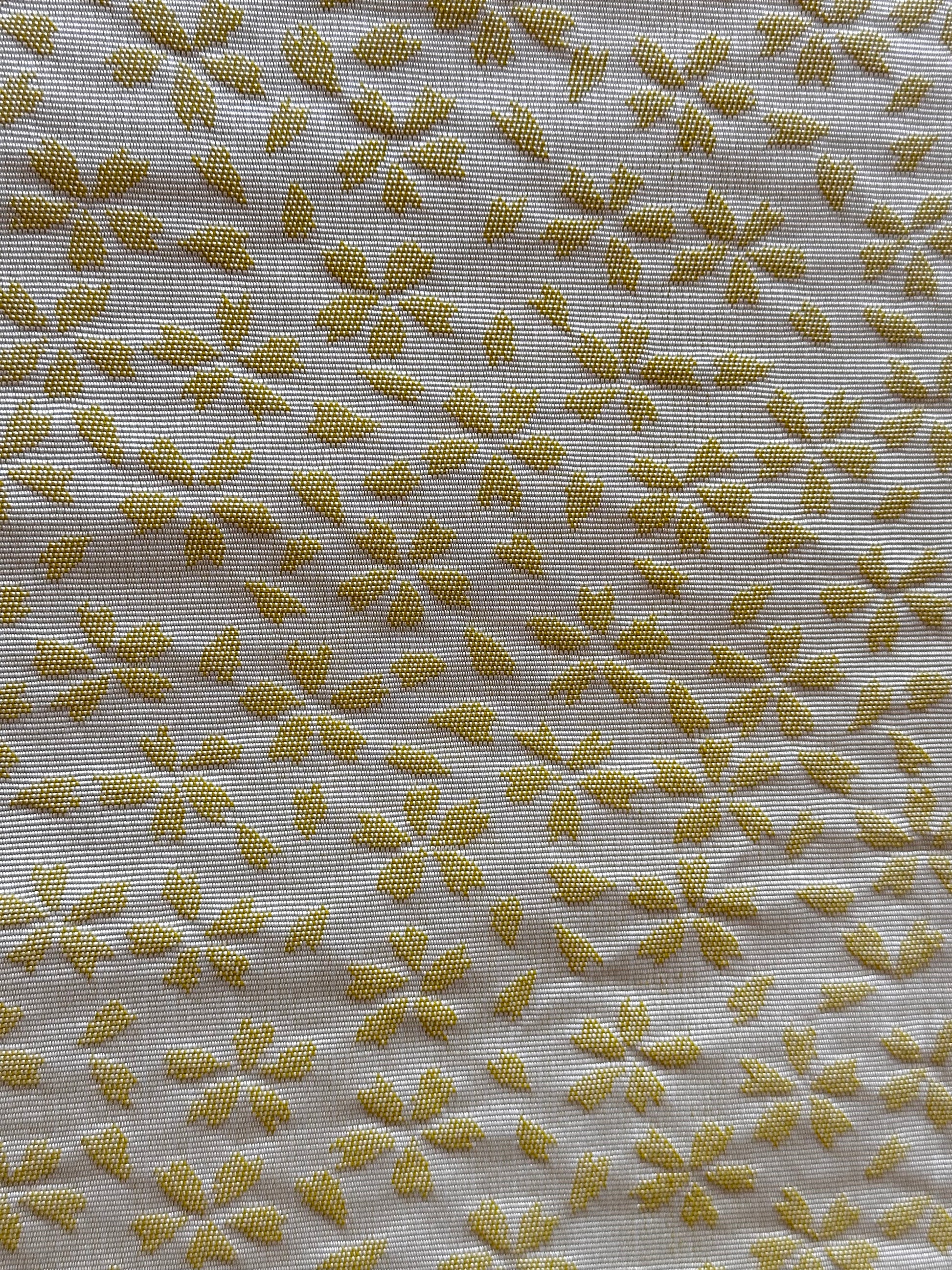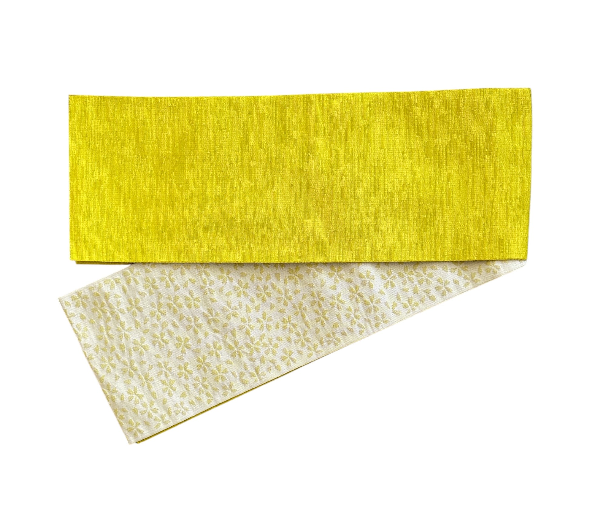 Description: Add a touch of elegance and modernity to your wardrobe with this hanhaba obi. One side features a striking metallic yellow-green base, woven with a subtle sheen that catches the light beautifully, offering a sophisticated and contemporary look. The reverse side showcases a soft light grey background, adorned with cherry blossoms (sakura flowers) and petals woven in the same golden-green tones, creating a harmonious and refined design.