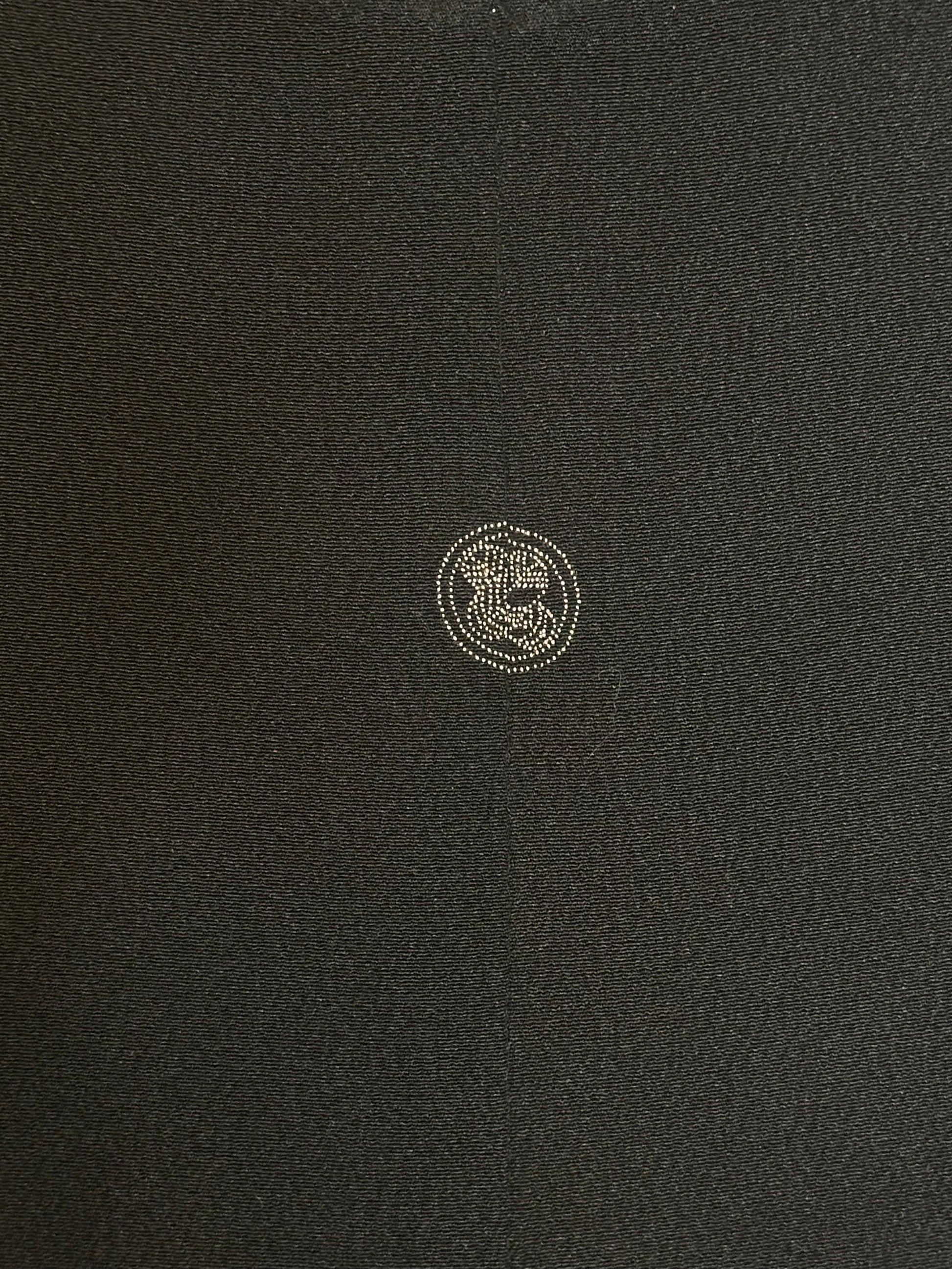 Description: This women’s vintage haori is crafted from very light black silk, exemplifying traditional Japanese elegance. The exterior features a large, stylized peony woven with metallic silver and chrome urushi threads, creating a shimmering, textured effect. The peony is a symbol of prosperity, honor, and bravery in Japanese culture, making this haori not only beautiful but also rich in meaning. The back displays one embroidered kamon (family crest), adding formality and historical significance.