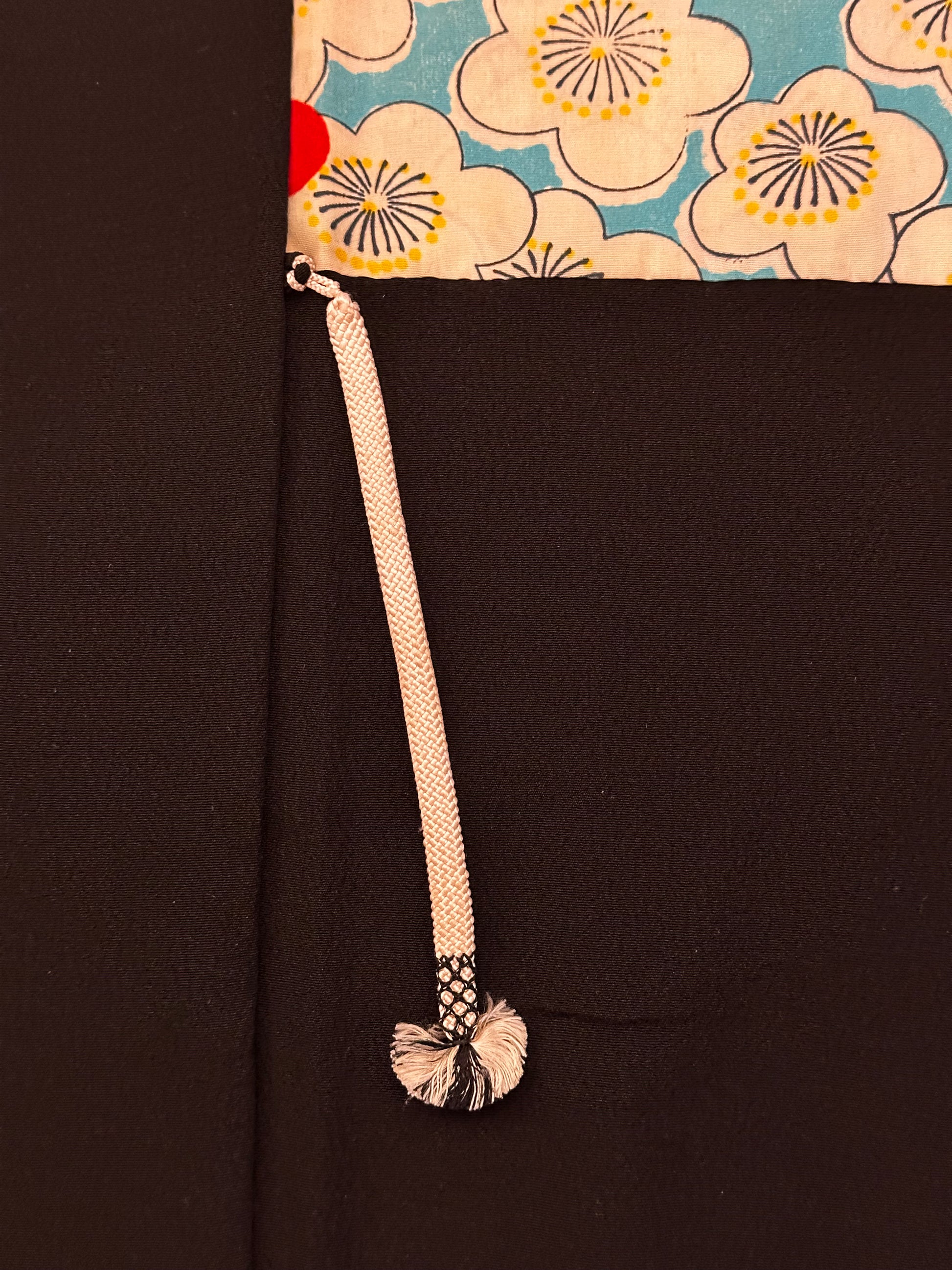 The interior is lined with vivid red silk, adorned with cloud patterns, ume (plum blossoms), and tachibana (mandarin orange) motifs, adding a striking contrast and depth to the piece. The haori is completed with traditional haori himo (decorative haori ties), preserving its authentic form.