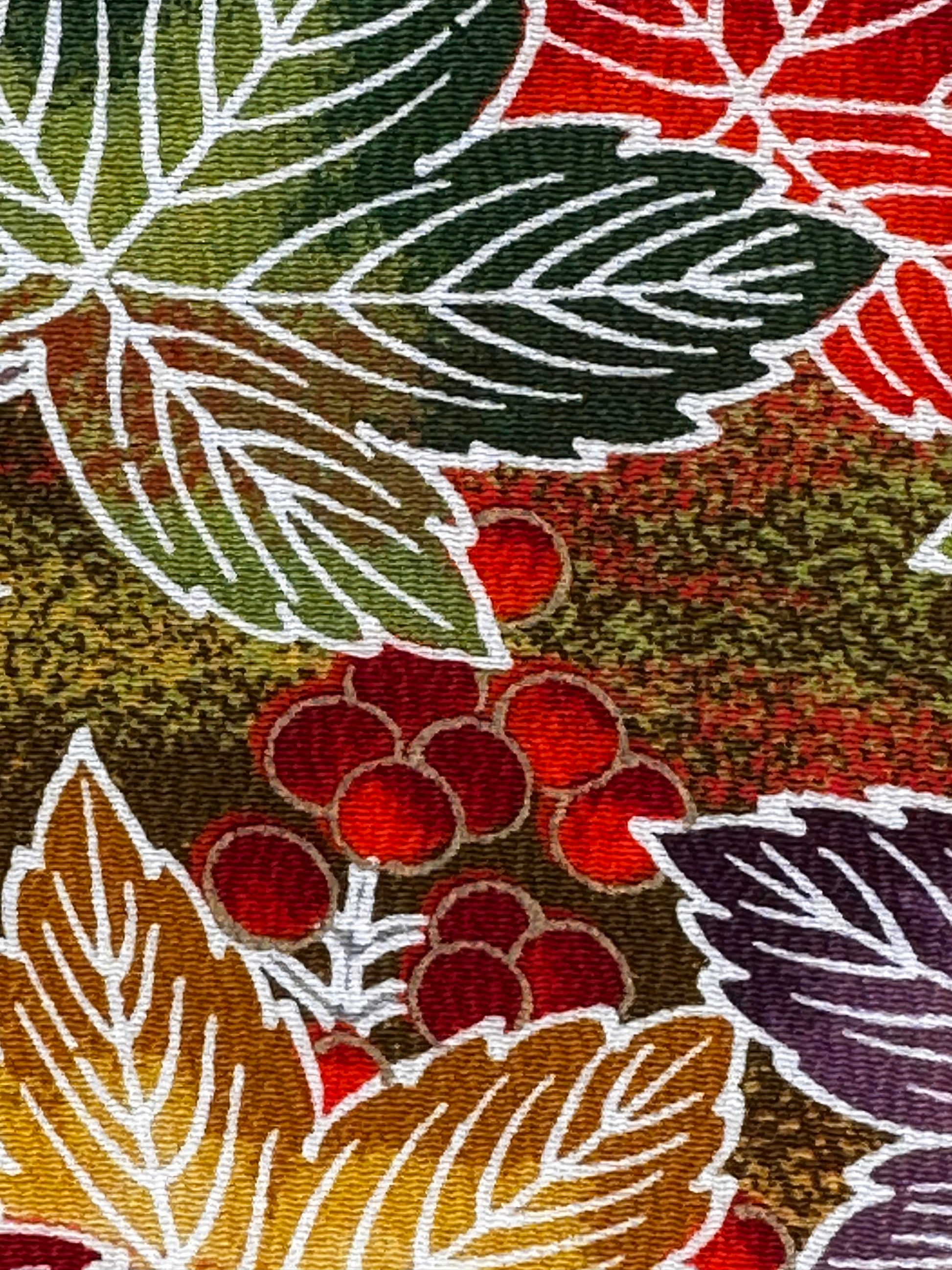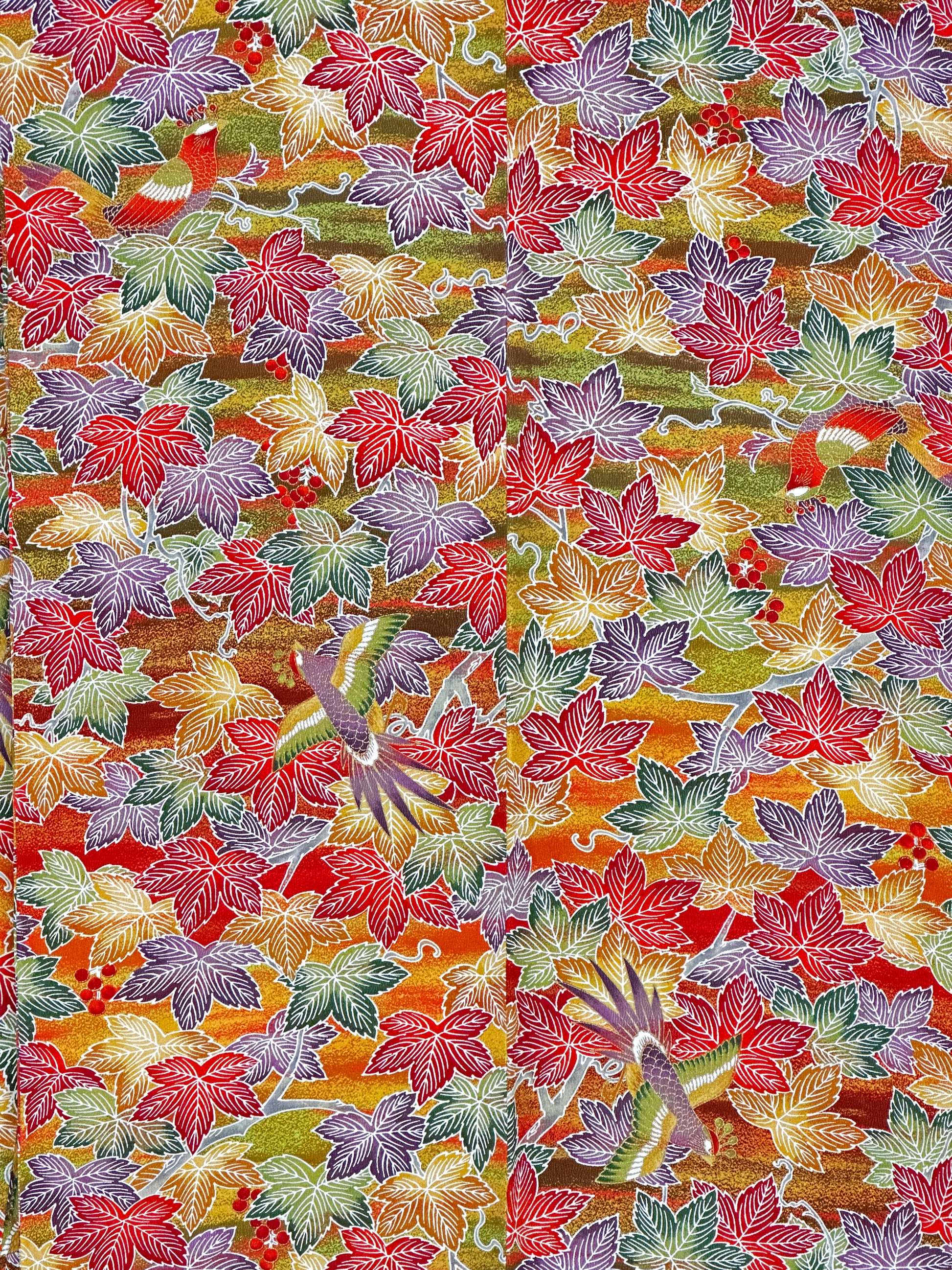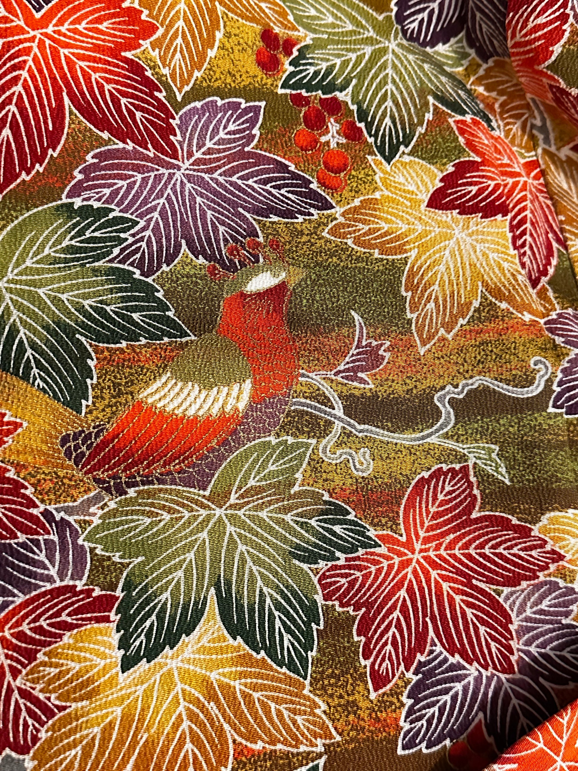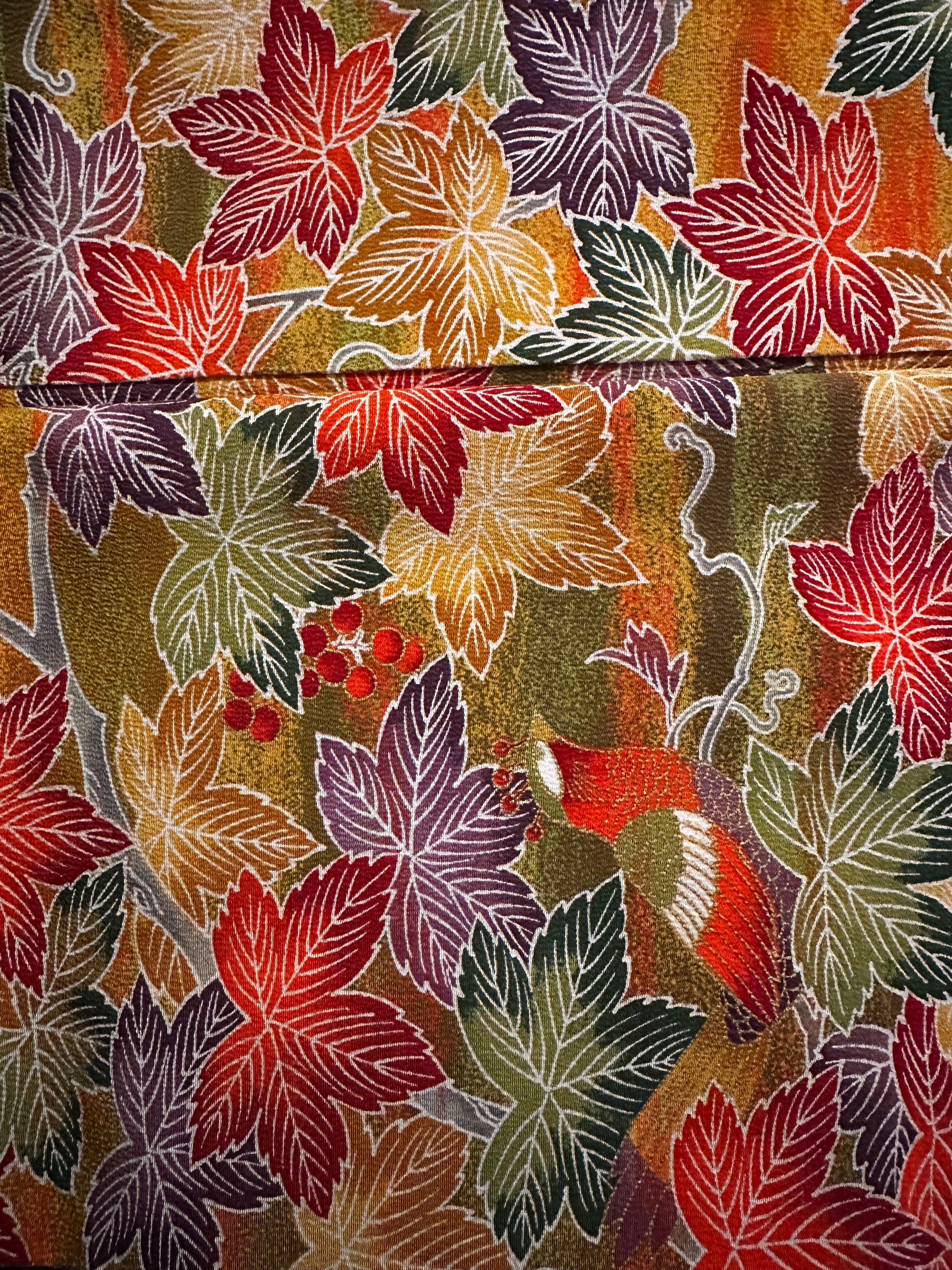 Description: This women’s komon kimono features a striking, hand-painted design inspired by autumn, with vivid leaves and berries in rich seasonal tones, complemented by stylized birds rendered in bold, expressive details. The dynamic composition brings warmth and movement to the garment, blending traditional Japanese motifs with a lively, artistic flair.