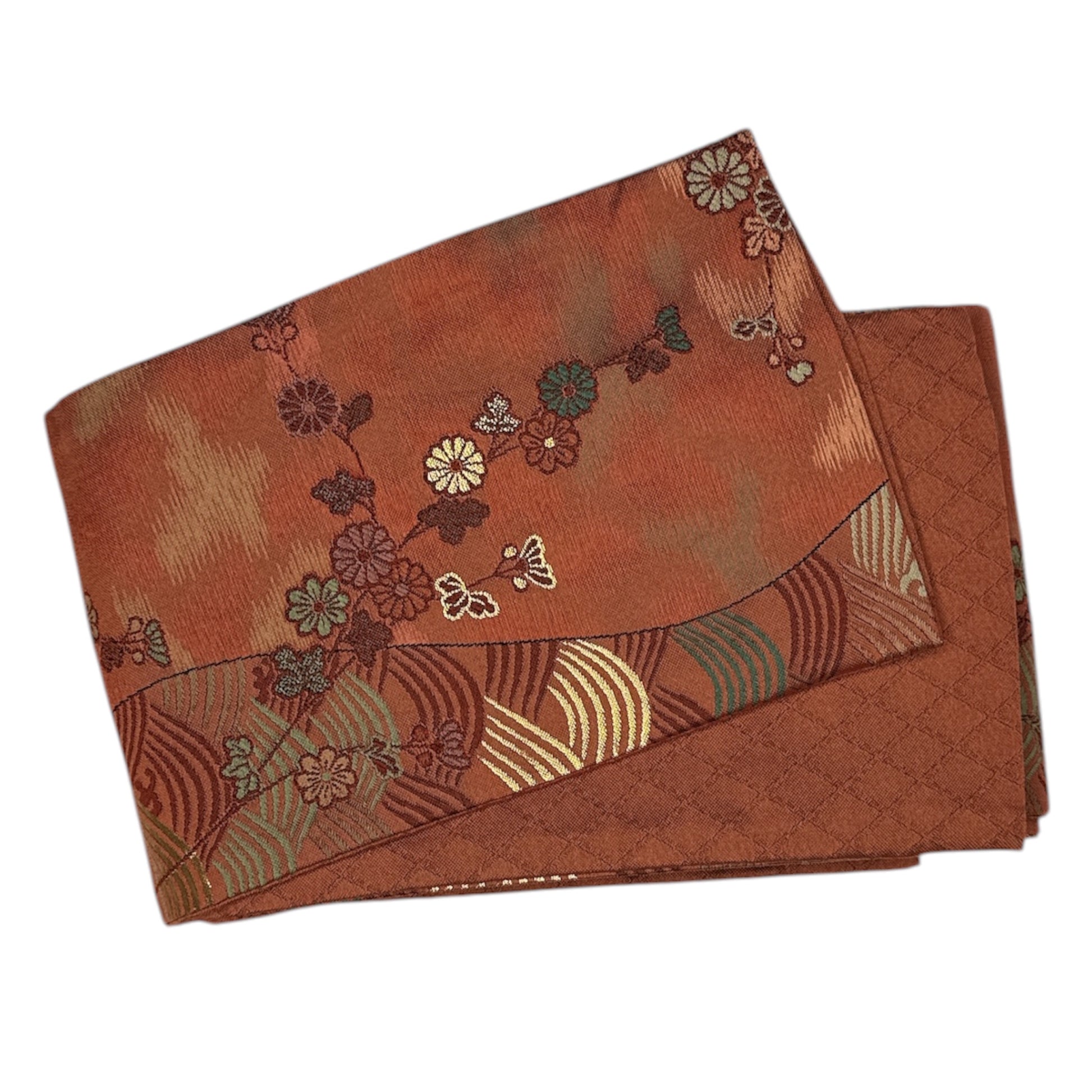 Description: This exquisite hanhaba obi captures the warmth and richness of autumn through its elegant combination of motifs and color. The front side features woven chrysanthemums (kiku) — a timeless symbol of longevity and rejuvenation — rendered in autumnal hues accented with touches of metallic gold. Along one section, delicate seigaiha (青海波, wave) patterns shimmer in multi-colored tones, adding rhythm and depth to the design. The base tone of deep burnt orange–terracotta enhances the seasonal warmth and visual harmony.
