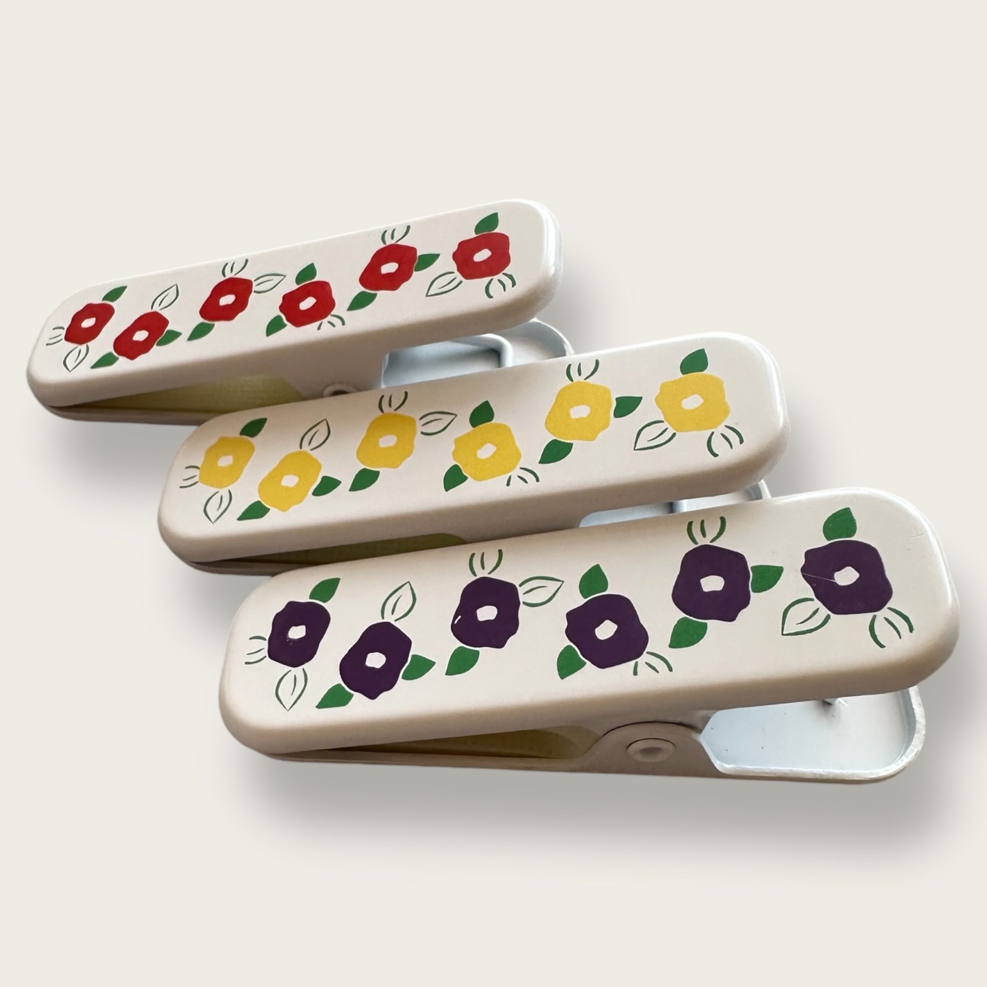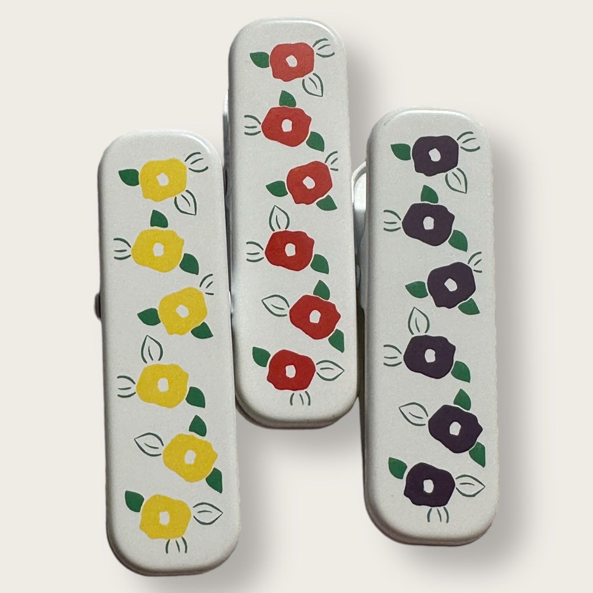 Each clip is decorated with a charming camellia flower design in vibrant colors—one red, one yellow, and one purple—adding a touch of elegance and color to your dressing routine. These clips are perfect for holding kimono layers in place as you arrange collars, secure obi ties, and style your look, allowing you to enjoy a hassle-free Kitsuke experience.