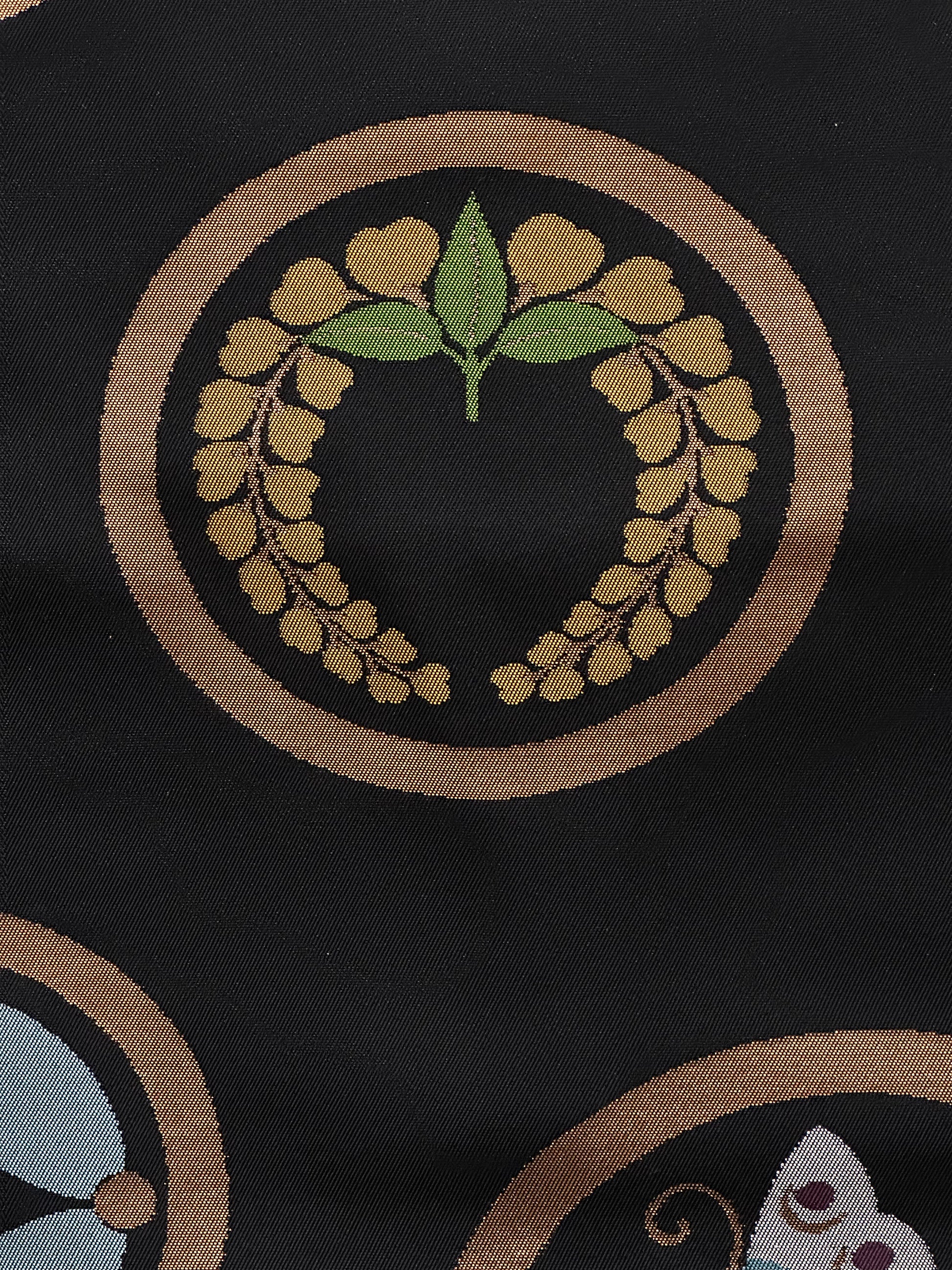 Description: Elegant vintage fukuro obi featuring a refined black silk base beautifully adorned with gold circular motifs of flowers, family crests, and a butterfly. The intricate brocade weaving reflects traditional Japanese artistry and carries symbols of beauty, transformation, and good fortune.