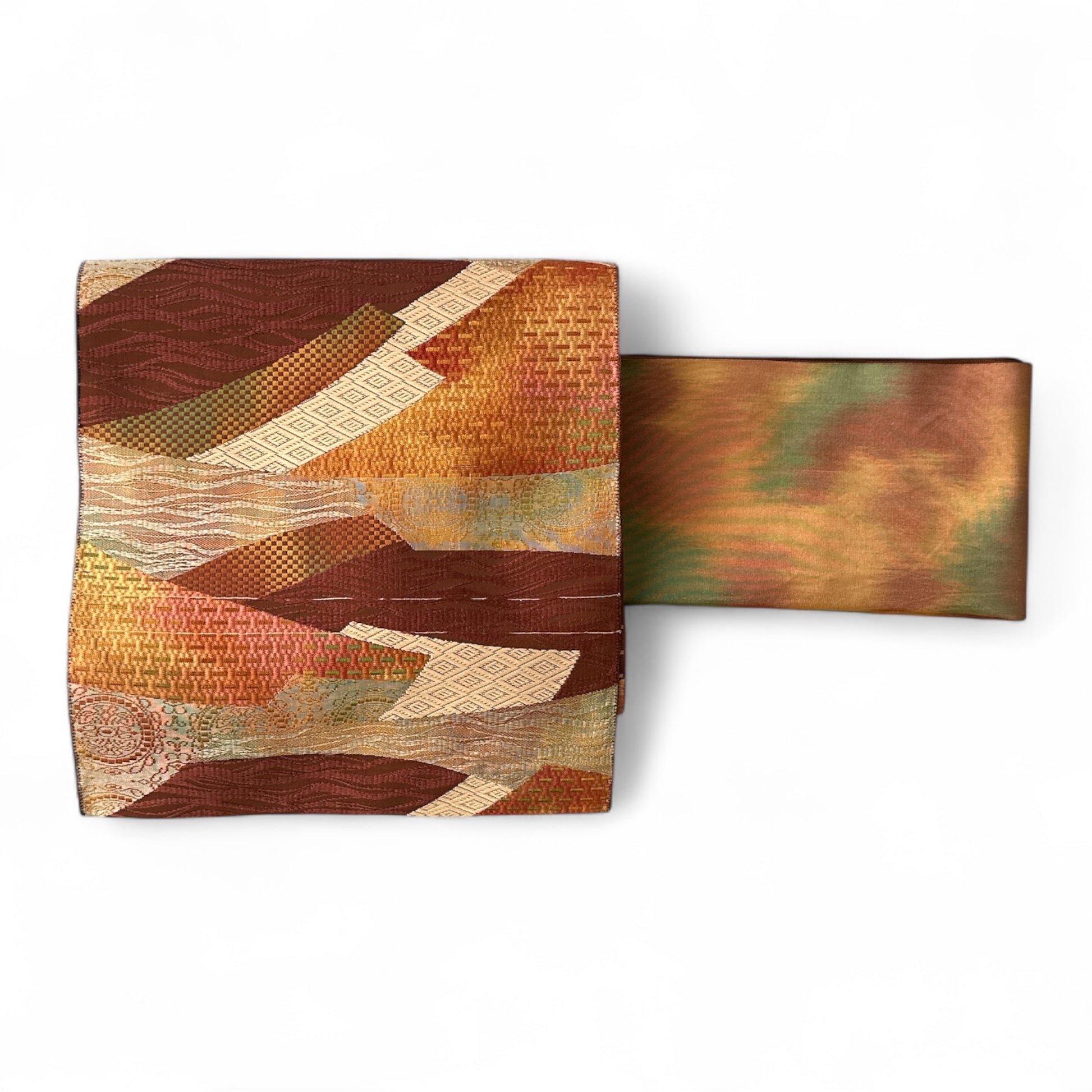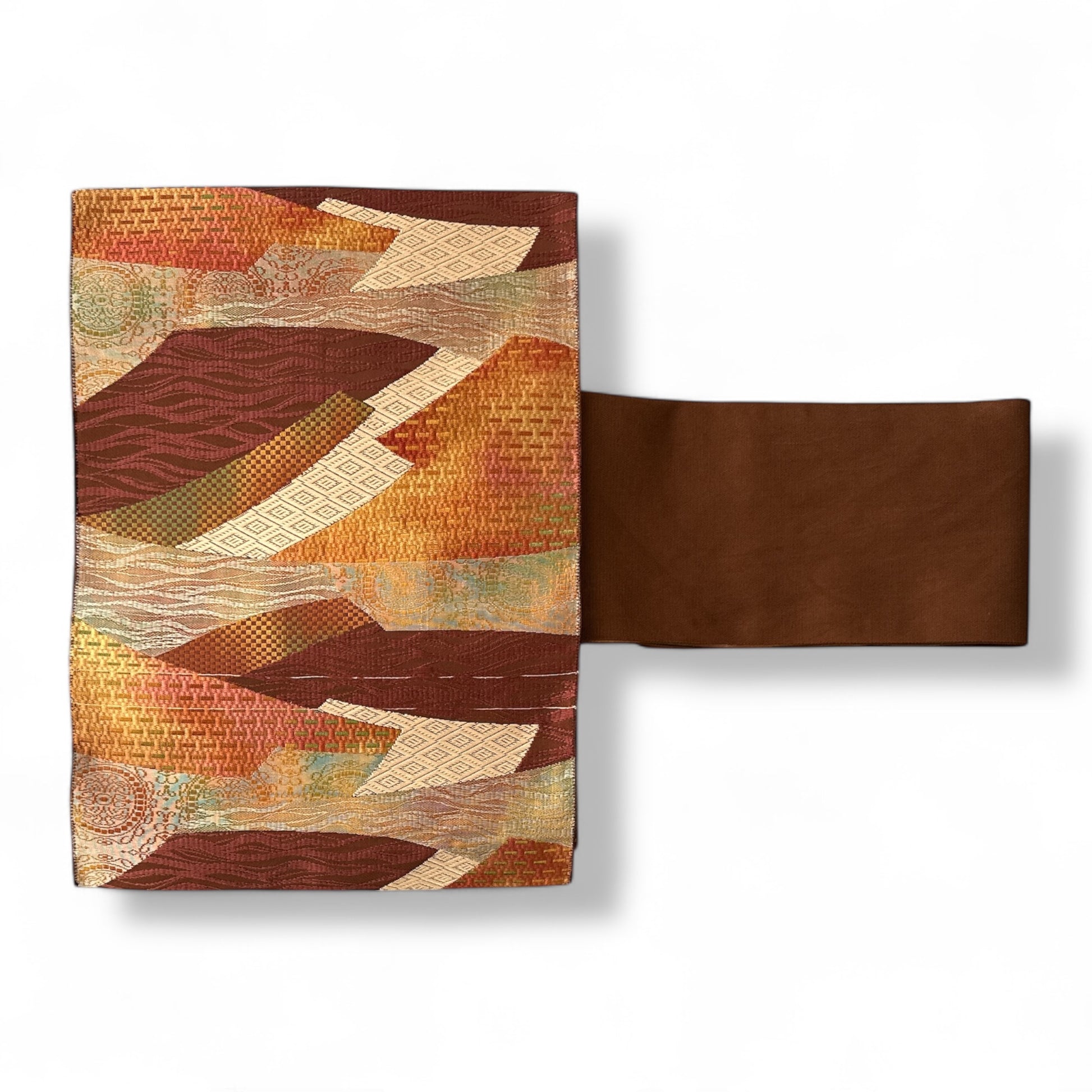 Description: This striking Nagoya obi is a celebration of autumnal beauty, woven from fine silk using the esteemed Nishijin-ori brocade technique. The obi showcases a rich, earthy palette of deep browns, golds, burnt orange, and muted green—evoking the warm tones of falling leaves and seasonal transitions.