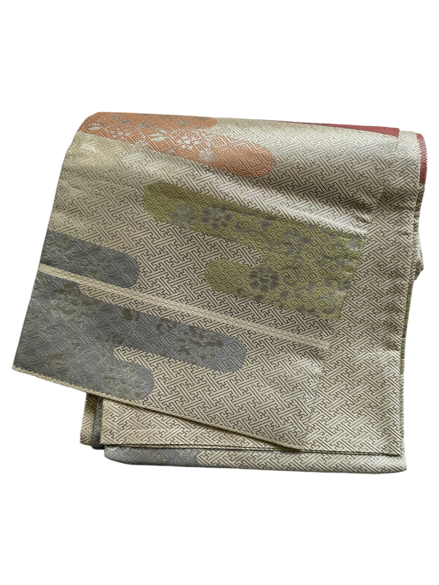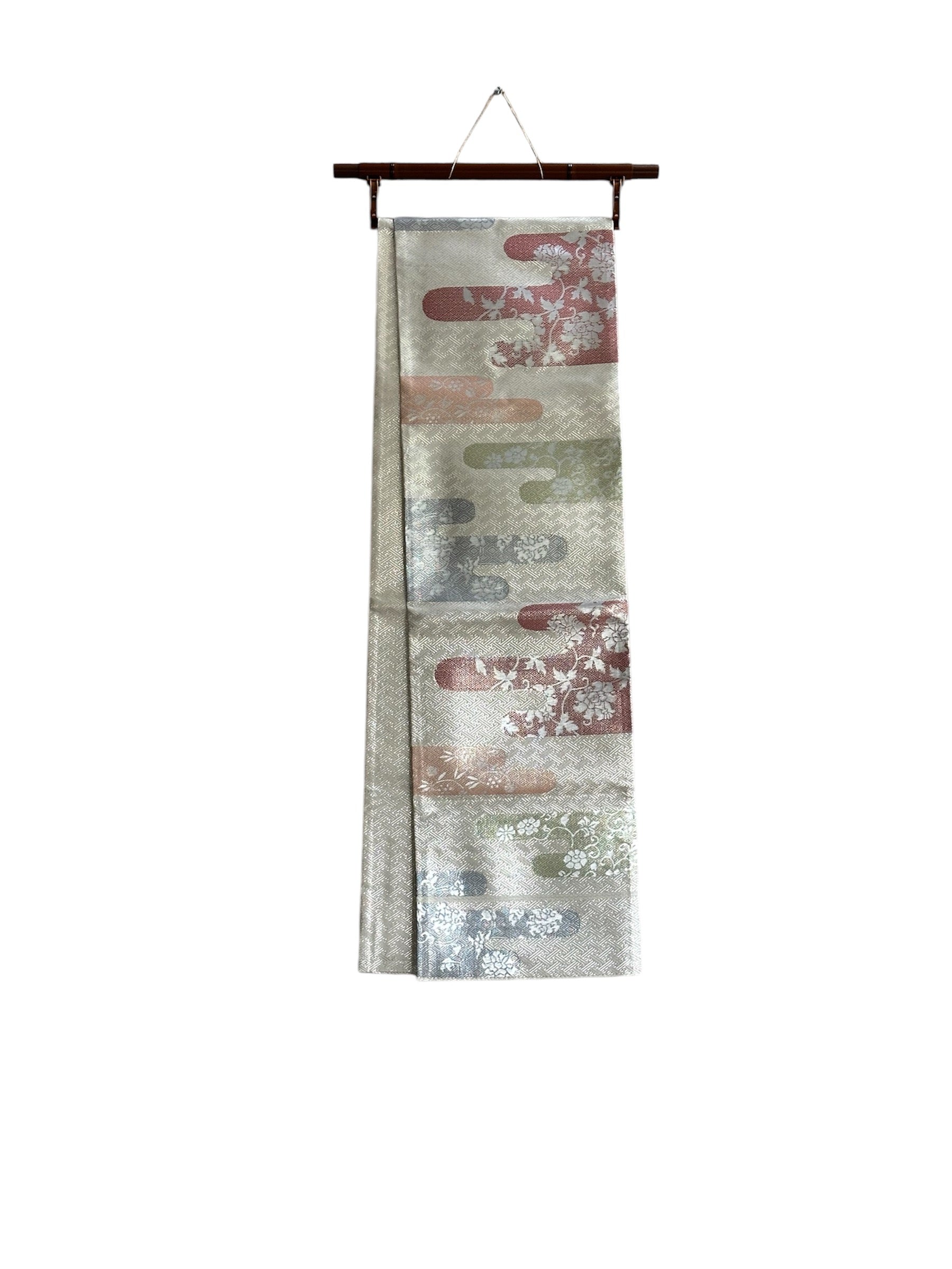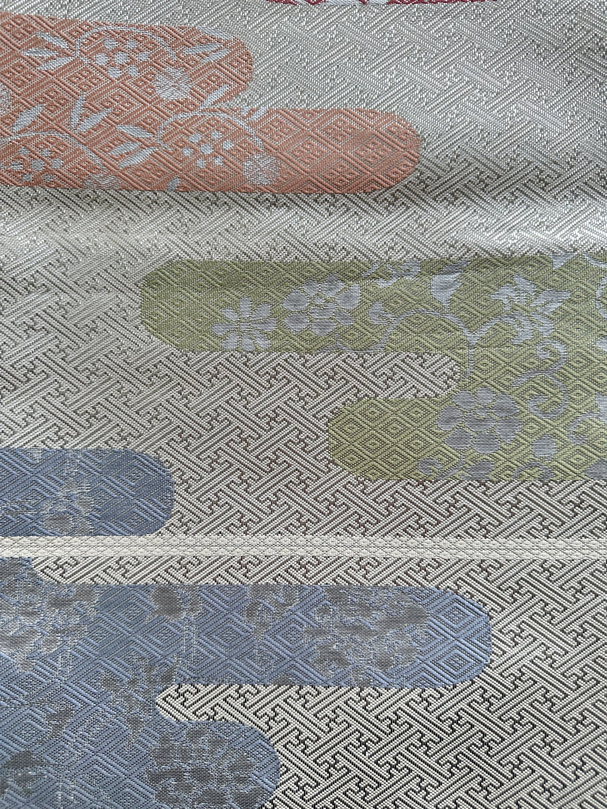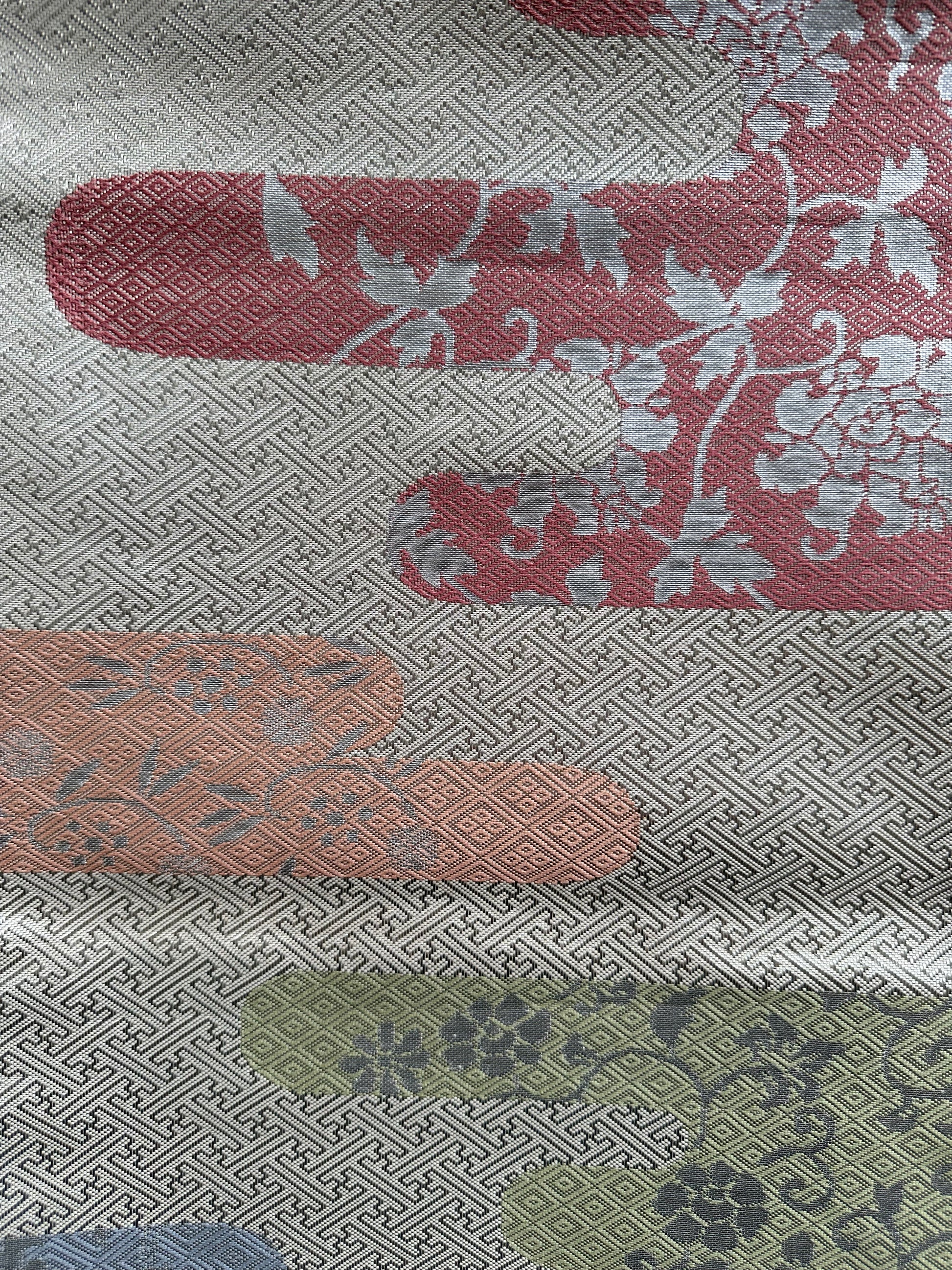 Description: This exquisite Fukuro Obi features a shiny silver base adorned with the classic Sayagata pattern, which runs the entire length of the fabric. The design is enhanced by delicate pale-colored floral motifs, intricately woven into the fabric. The combination of the shimmering background and the soft floral accents creates a stunning visual contrast, making this obi a standout piece.