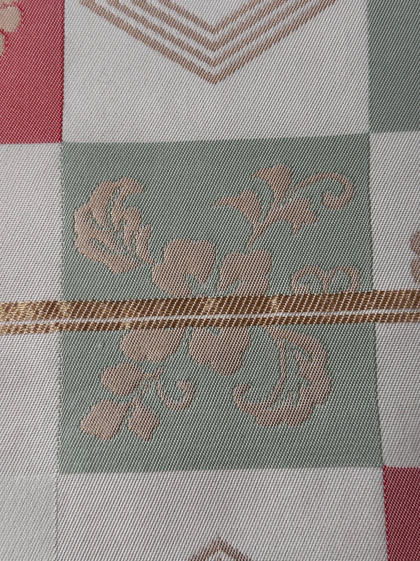 Description: A stunning Fukuro obi featuring an elegant and refined design, ideal for formal and semi-formal kimono ensembles. This exquisite piece brings together tradition and sophistication, making it a perfect accessory for enhancing the beauty of furisode, tomesode, or iromuji. The obi is adorned with a harmonious checkboard pattern in soft pastel hues of mint green, blush pink, and ivory. Each square is thoughtfully decorated with traditional Japanese motifs: