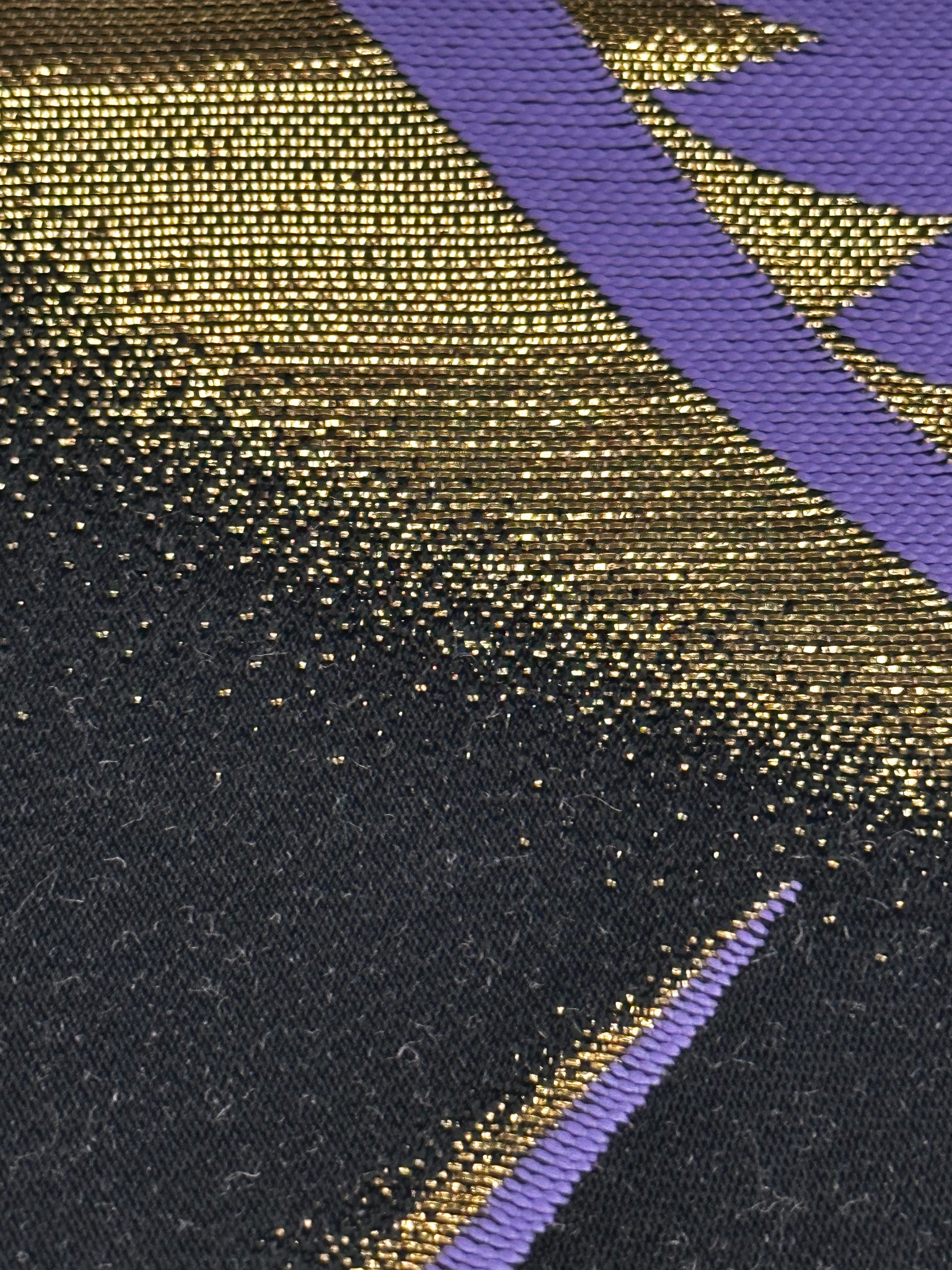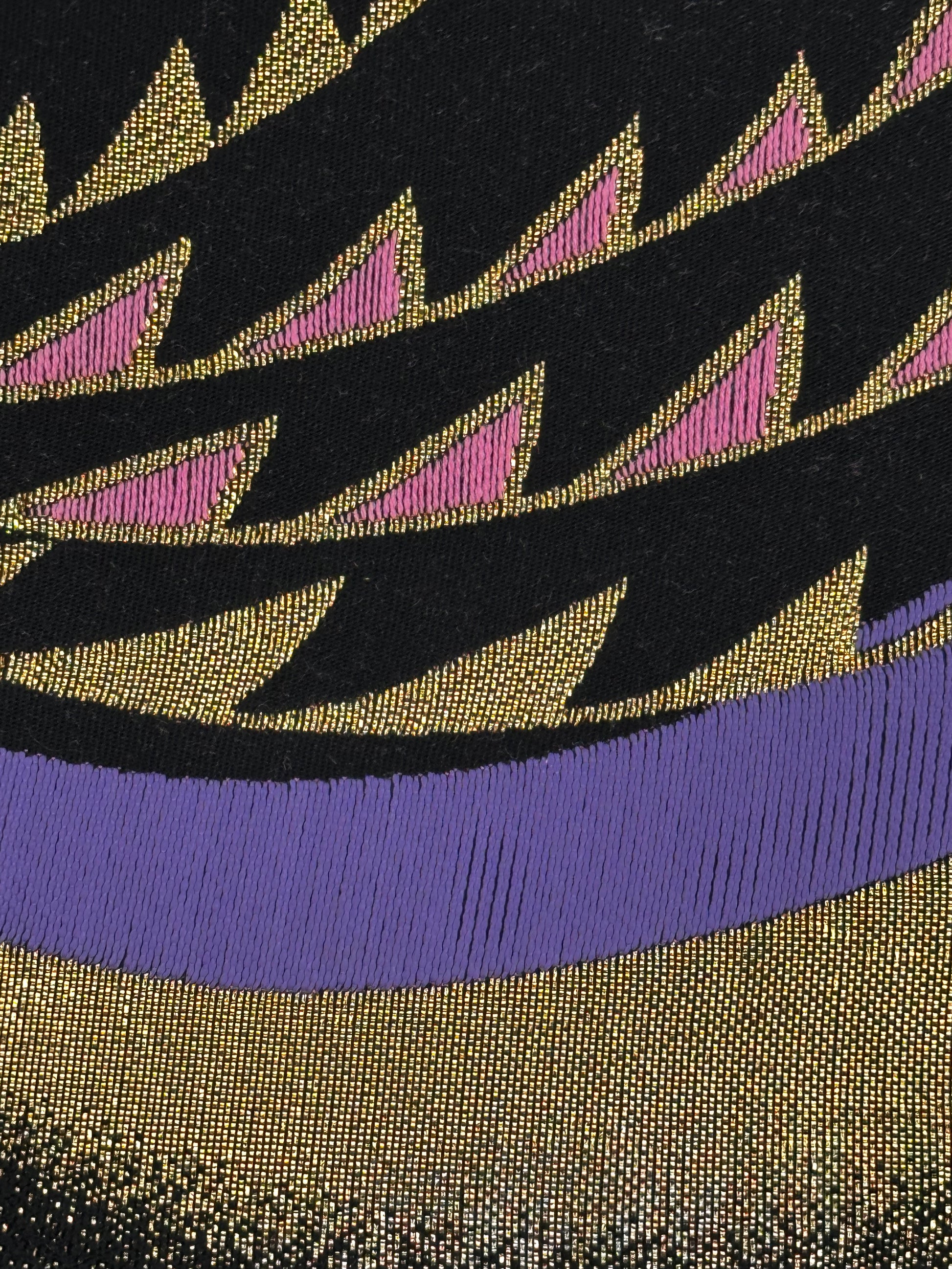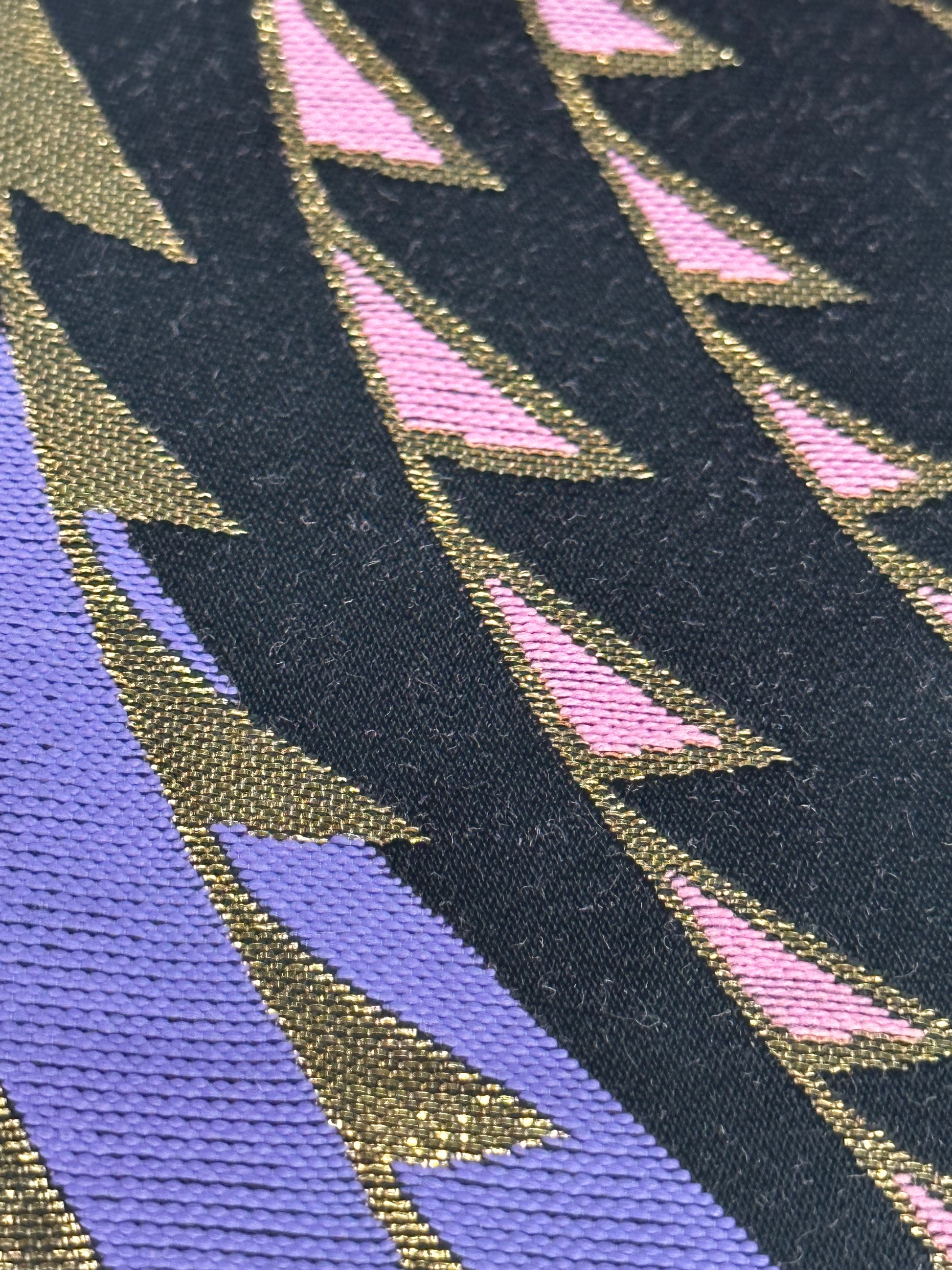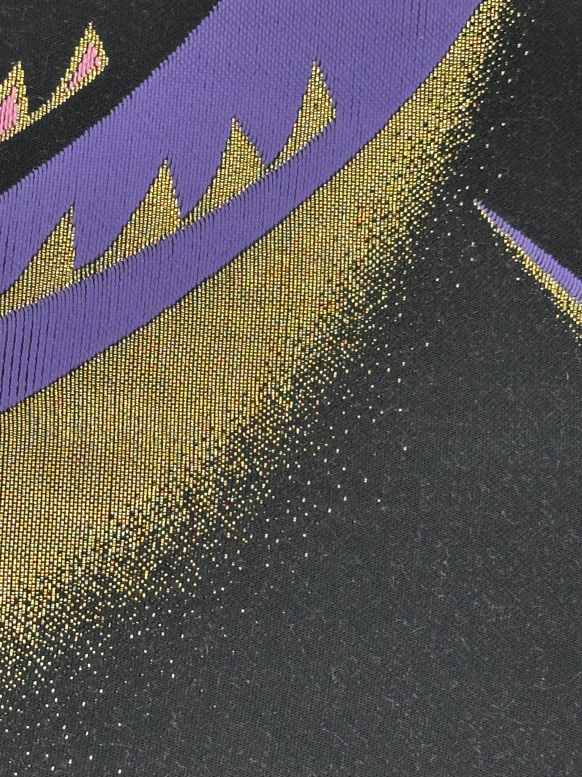 Description: This striking hanhaba obi captivates with its bold contrast and dynamic movement. One side features a deep, rich black background adorned with broad, flowing gold metallic bands that sweep gracefully across the surface like waves in motion. The design is further accented with a solid purple band and subtle pink highlights, adding depth and a touch of modern vibrancy to the traditional motif. The shimmering gold threads catch the light beautifully, evoking a sense of energy and refinement.