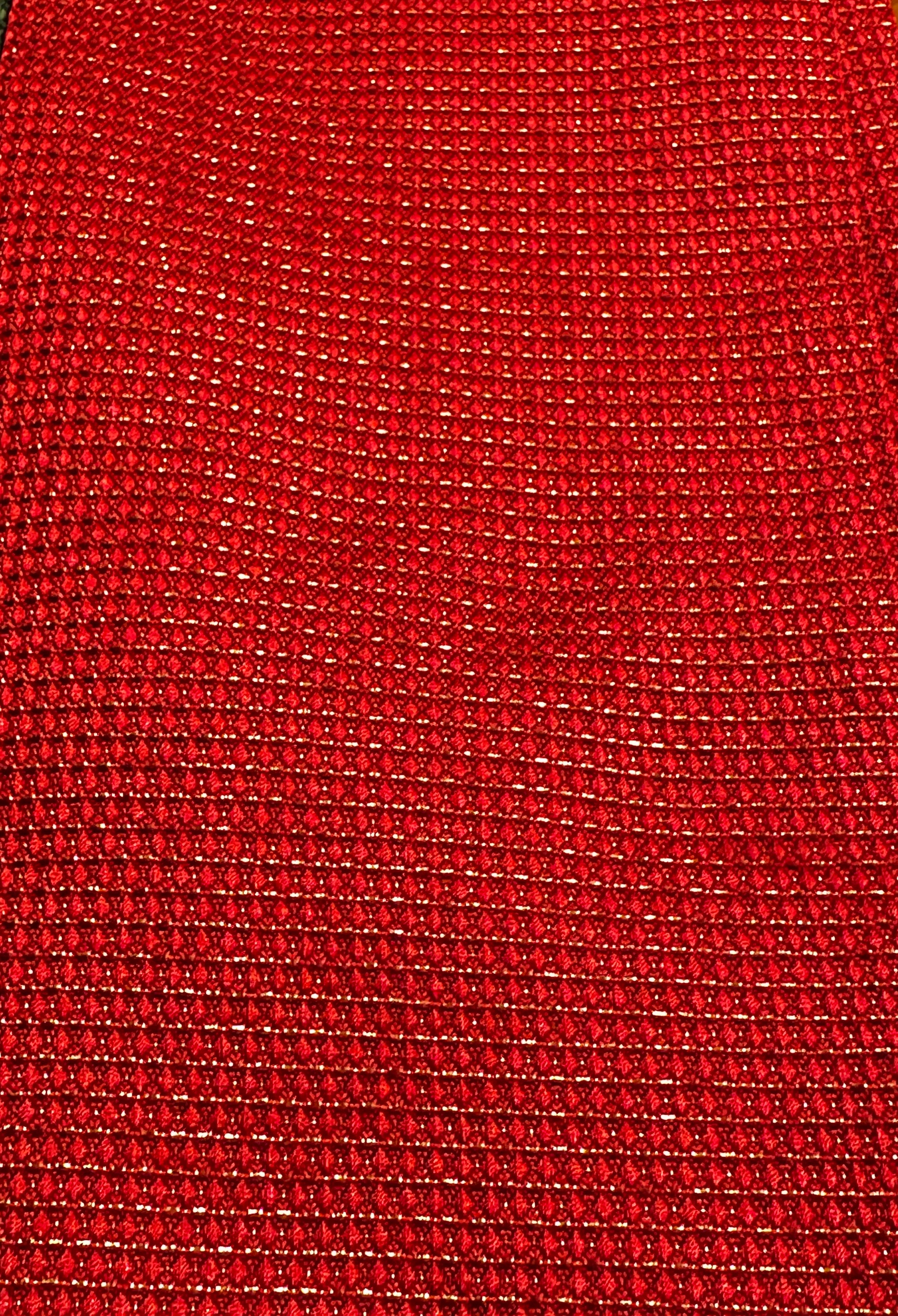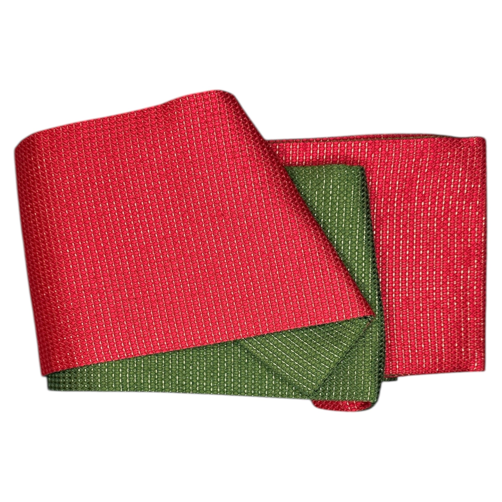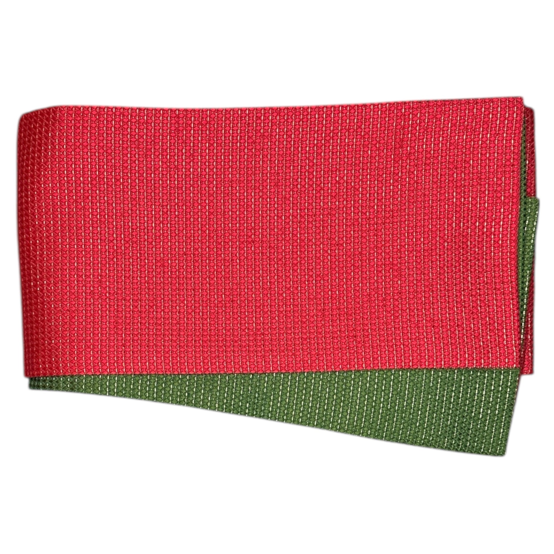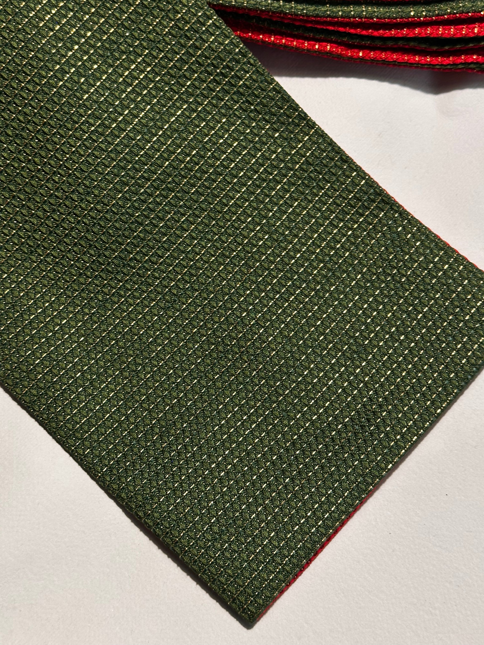 Description: This elegant women's hanhaba obi radiates holiday spirit with its rich, festive color. One side features a deep, vibrant red woven with shimmering gold threads, while the reverse side is a lush green accented with the same delicate gold threads. The obi’s soft texture and gentle sheen give it a luxurious feel, perfect for adding a seasonal touch to your kimono.