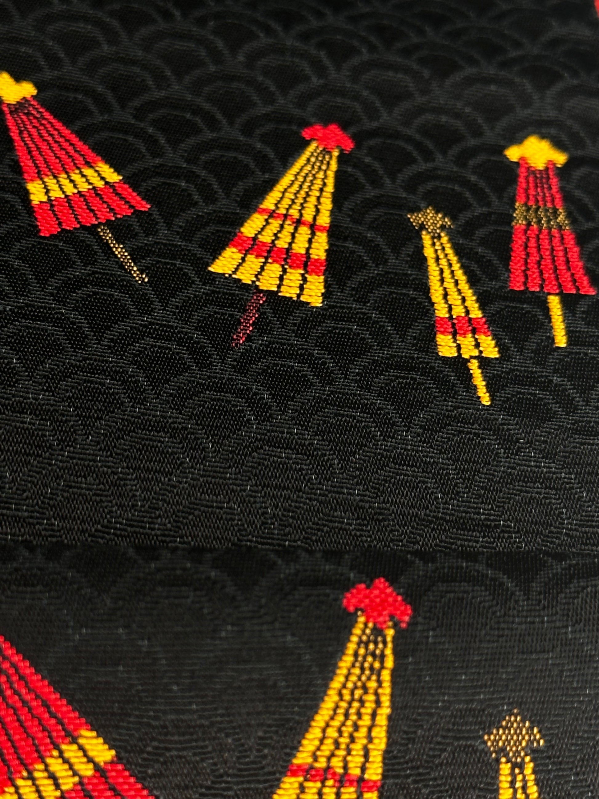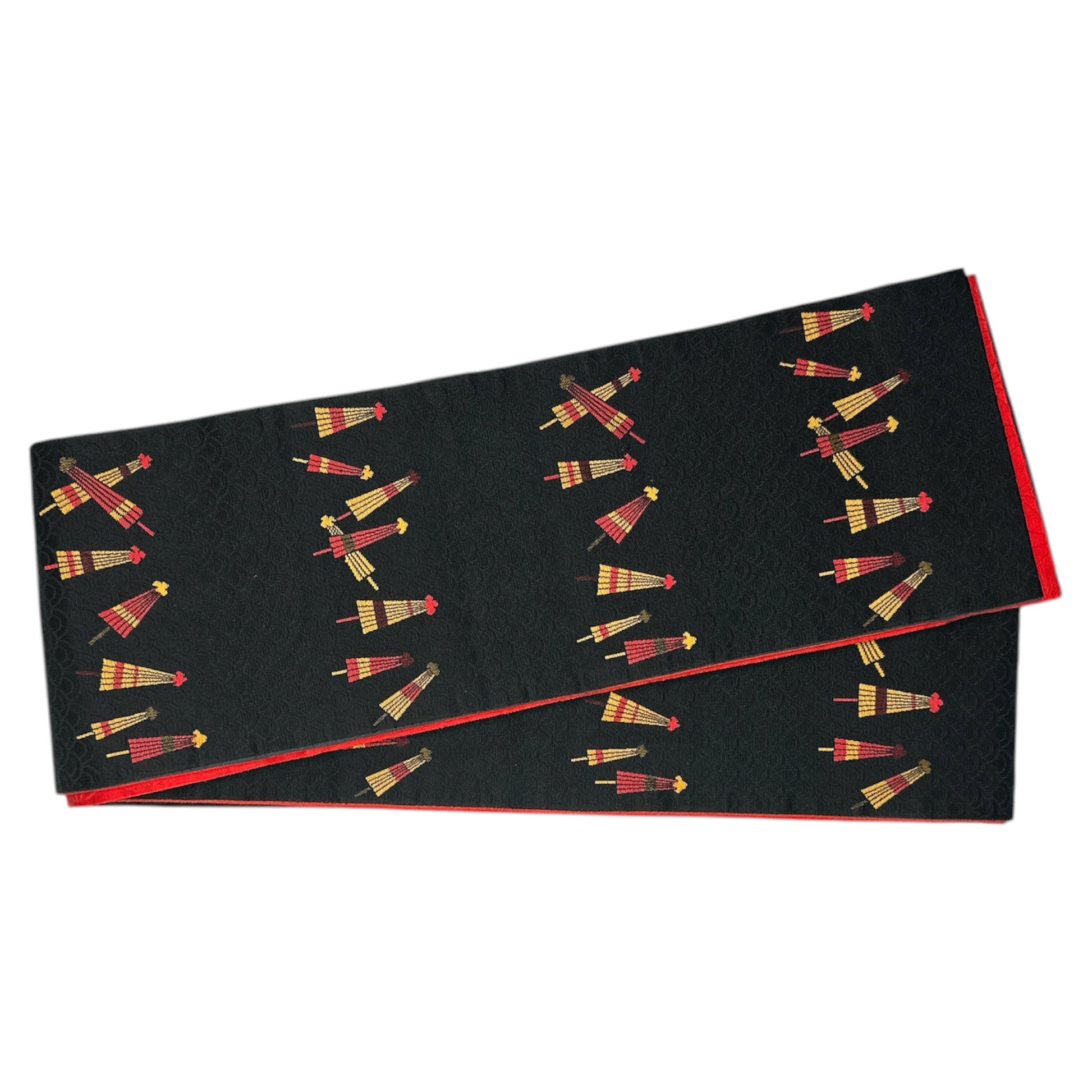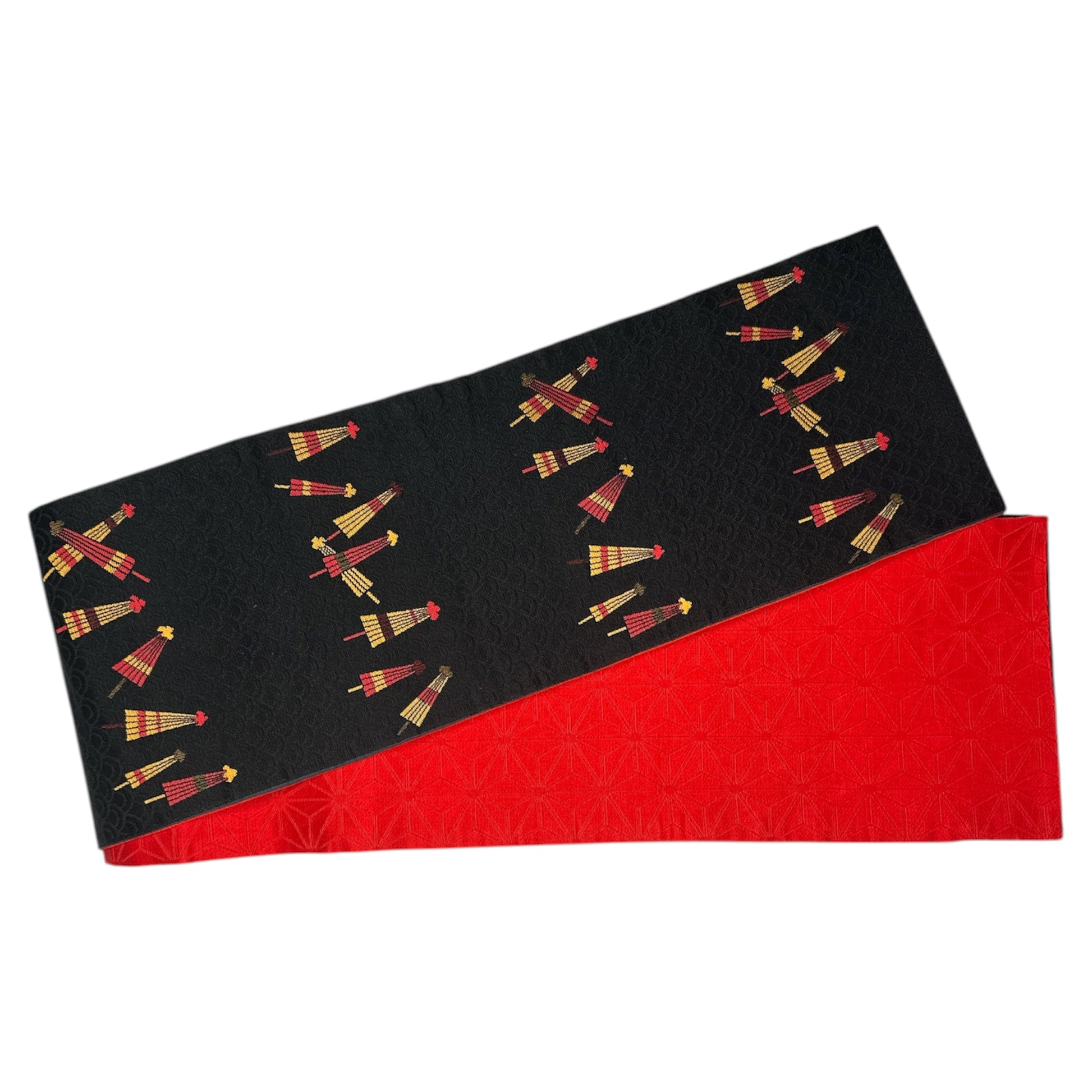 Description: Charming vintage hanhaba obi for women, beautifully reversible and crafted from soft, high-quality silk. One side features a refined black base woven with elegant wagasa (traditional Japanese umbrellas) in red and yellow, their closed forms symbolizing grace and tranquility. The reverse side displays a plain red-orange silk delicately patterned with the timeless asanoha (hemp leaf) motif, representing growth and protection.