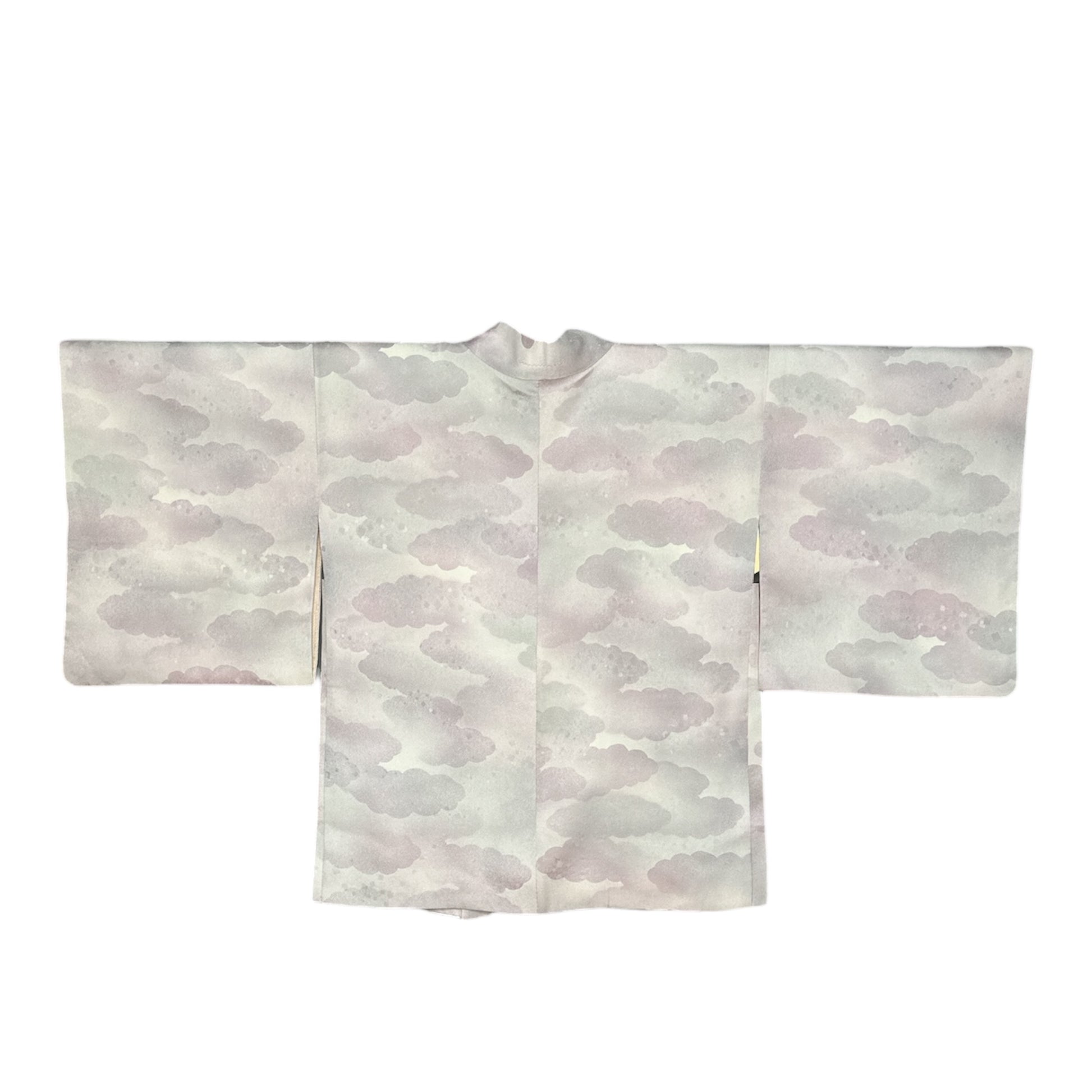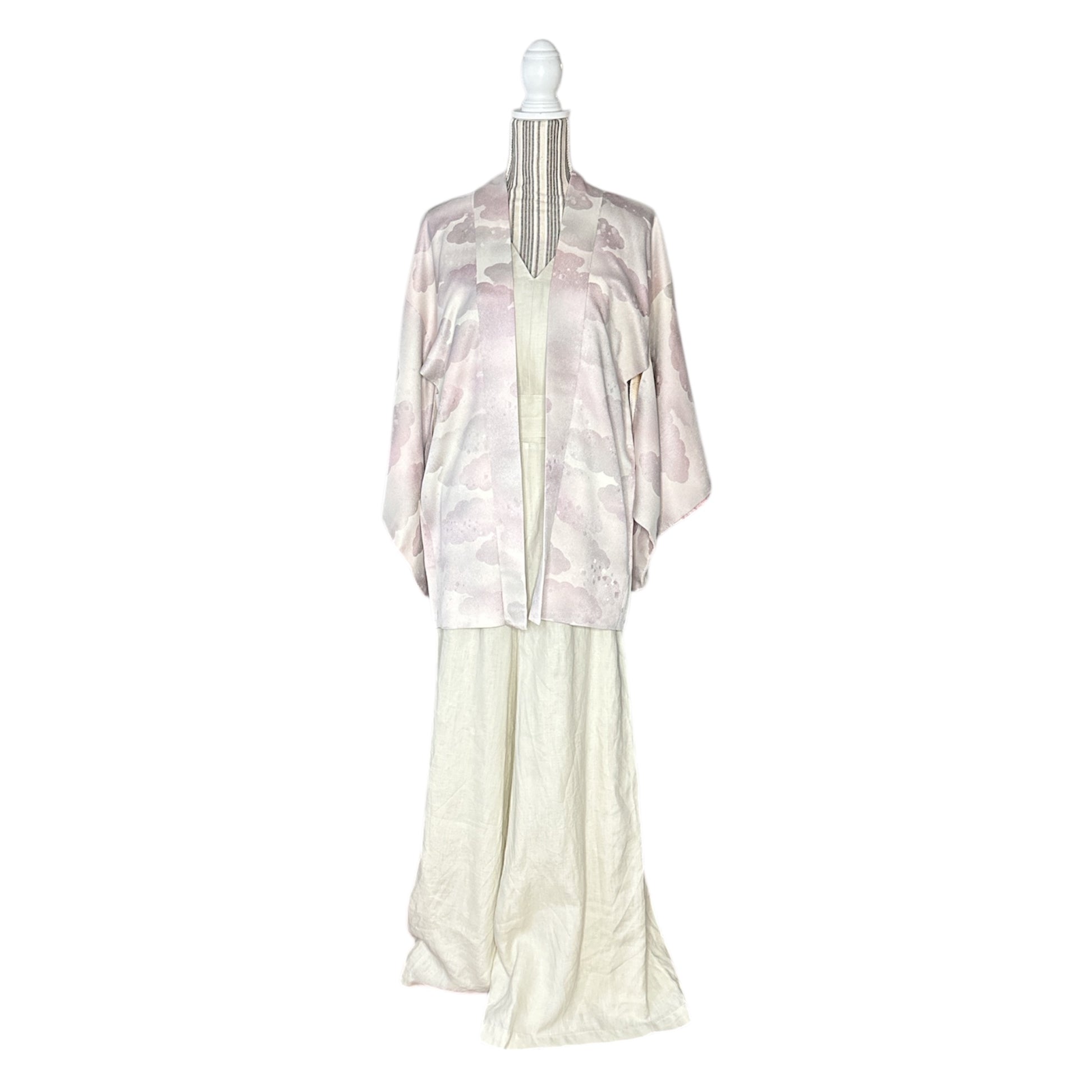 Description: This women’s vintage haori is crafted from luxurious rinzu silk, featuring a delicate woven cloud (kumo) motif across a luminous pearl base. Soft, shimmering pink clouds drift gracefully over the fabric, evoking the serene beauty of the sky and the ephemeral elegance of nature.