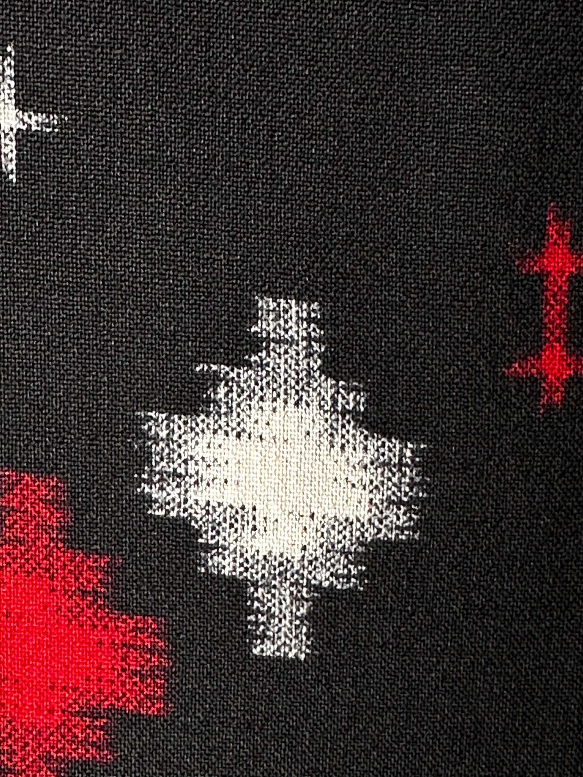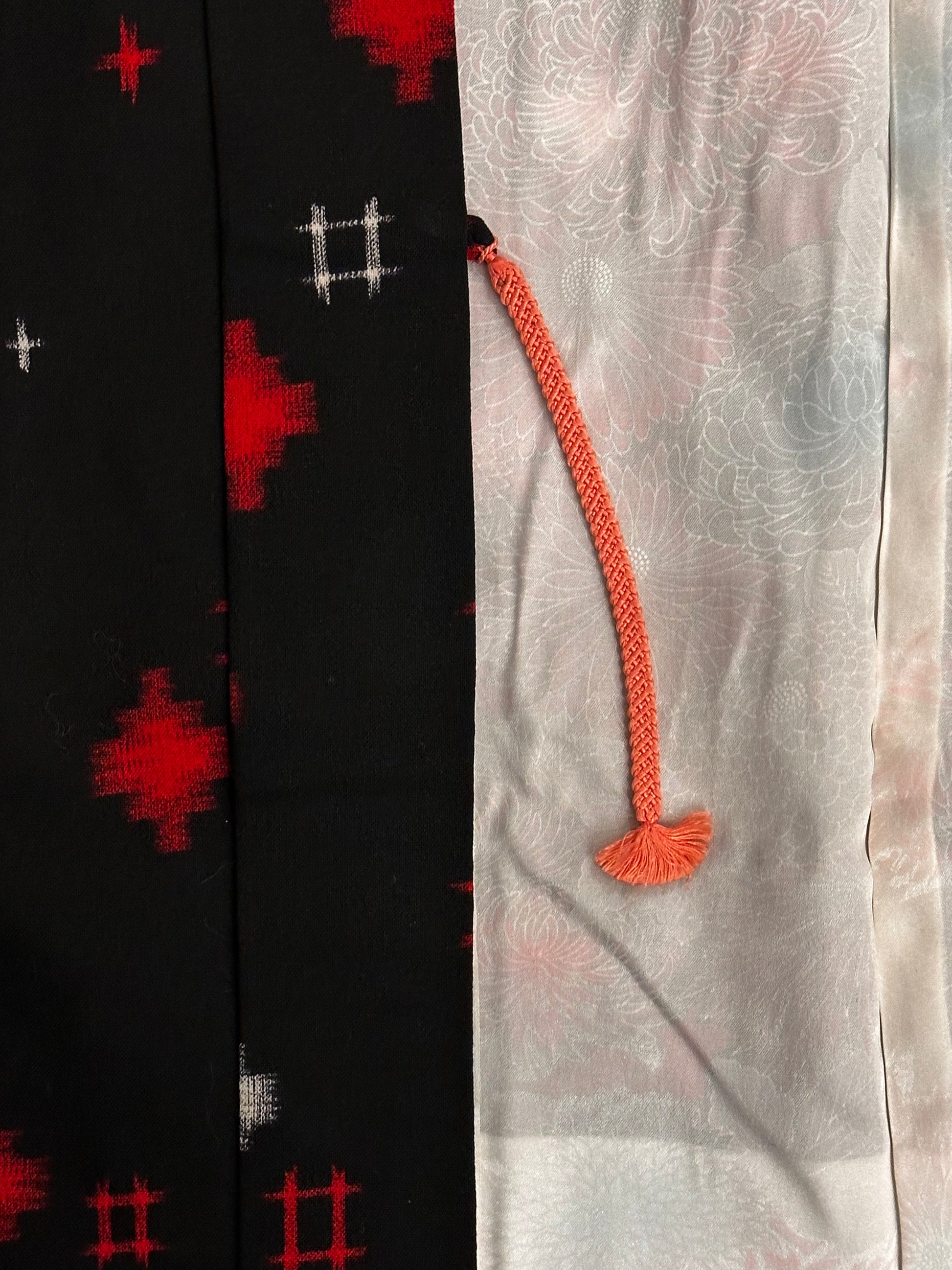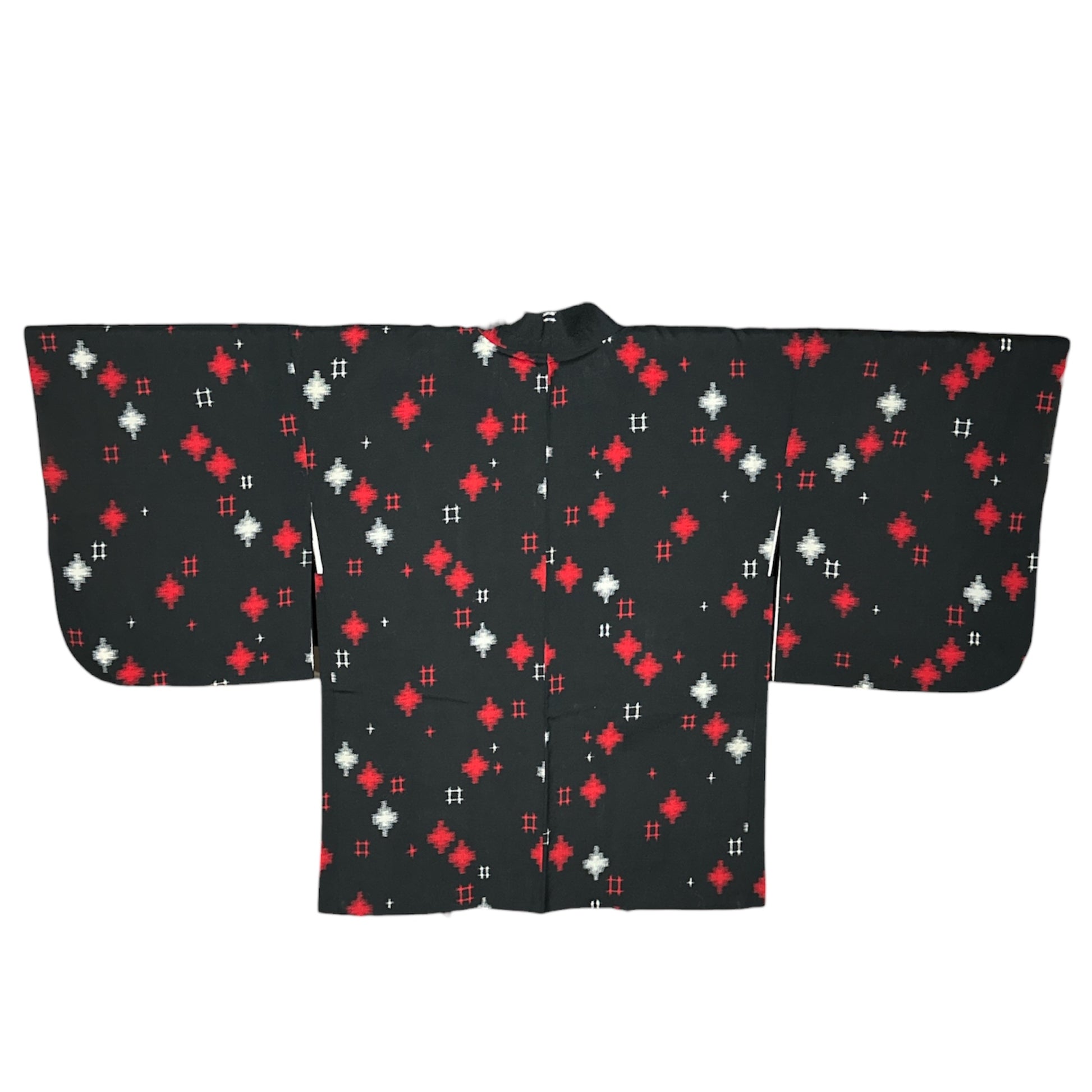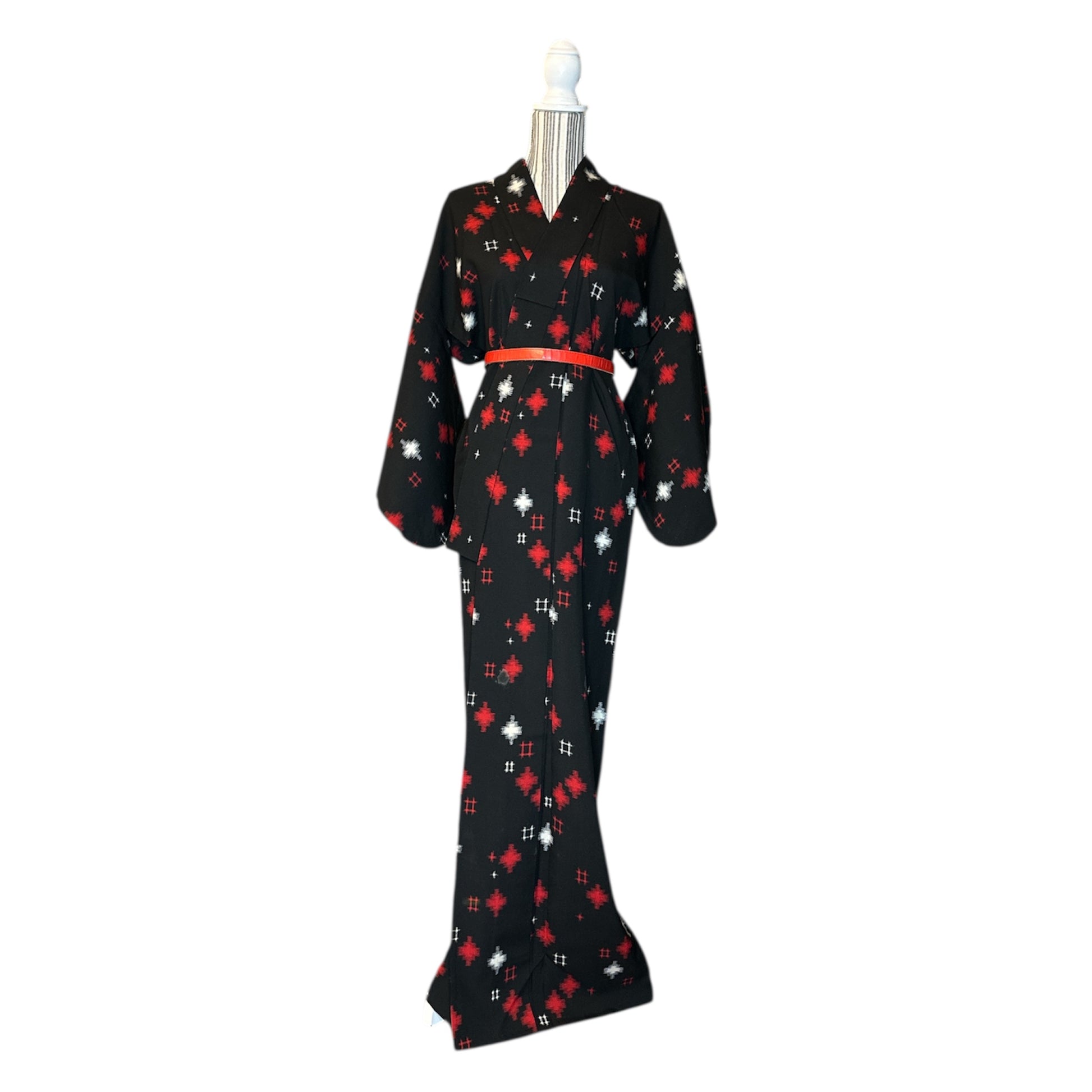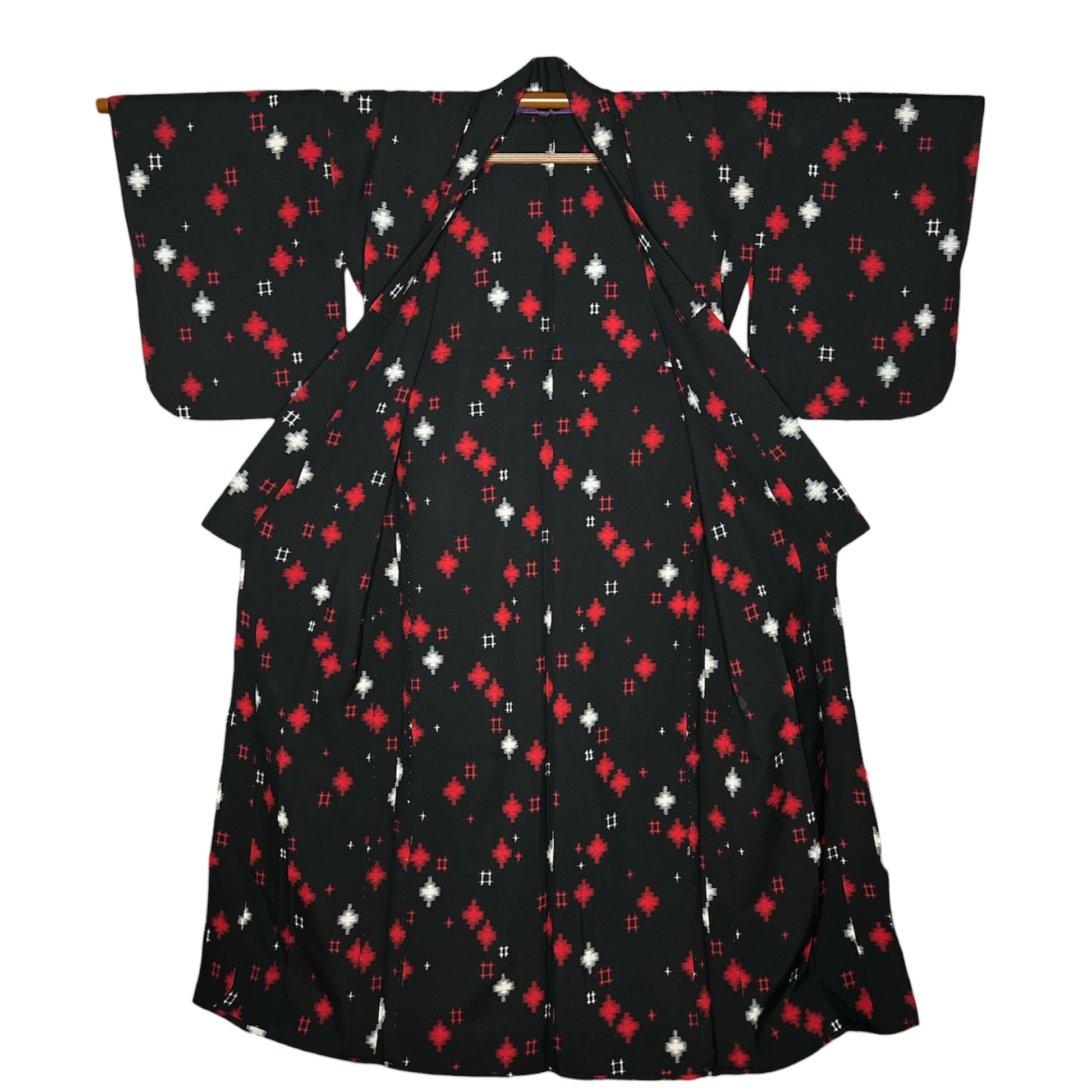 Description: This women’s kimono and haori set is a beautiful example of mid-20th-century Japanese design, dating from the late 1950s to early 1970s. The kimono is hitoe (unlined) and made in a classic komon style, featuring a traditional kasuri pattern. The black base is decorated with geometric cross motifs in red and white, a design traditionally associated with protection, balance, and harmony, symbolizing interconnected paths and continuity in everyday life.