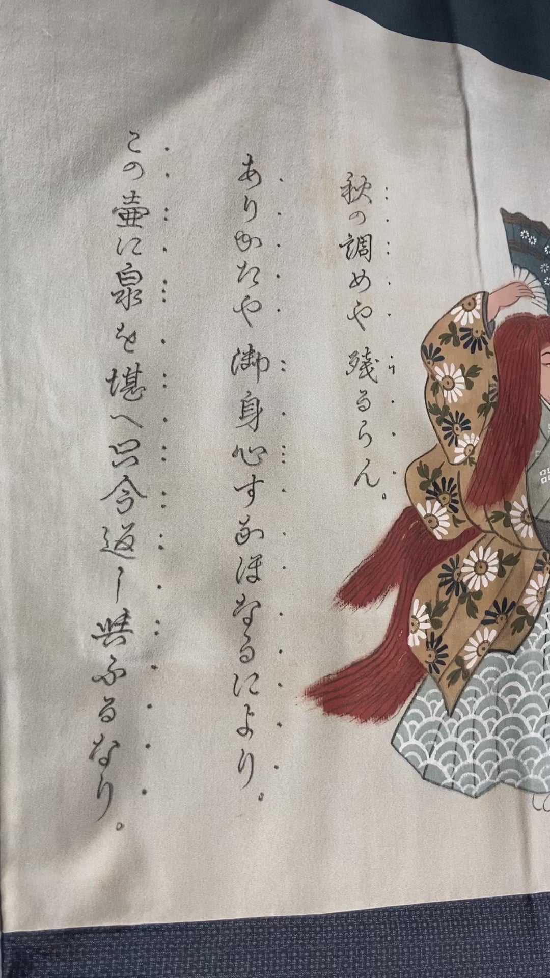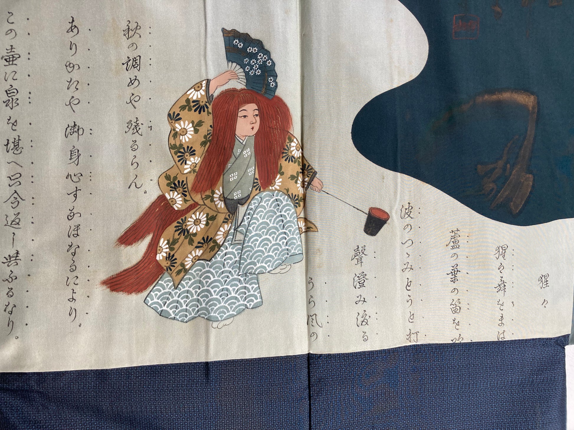 Description: Beautiful men’s haori in a deep indigo tone, crafted from Oshima Tsumugi fabric and accented with hand-painted artwork. This vintage piece features an elegant poem and the artist’s signature, offering a unique touch of Japanese heritage.