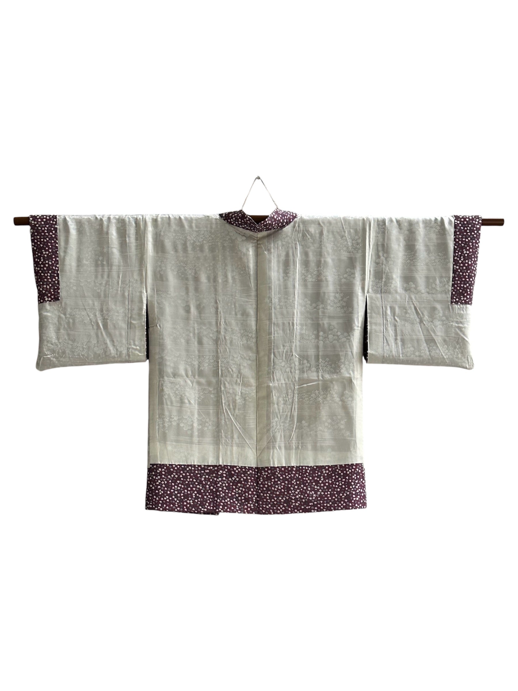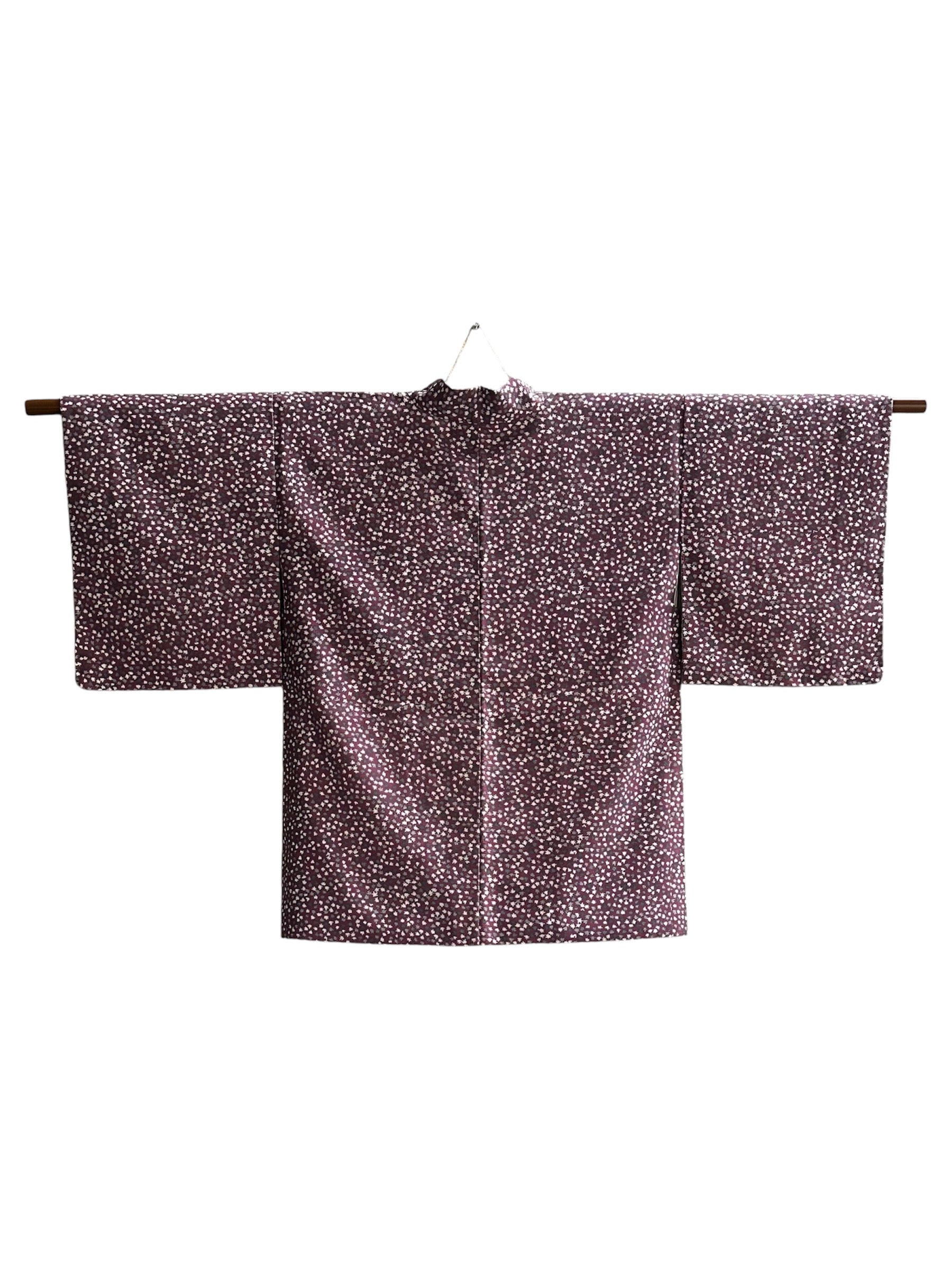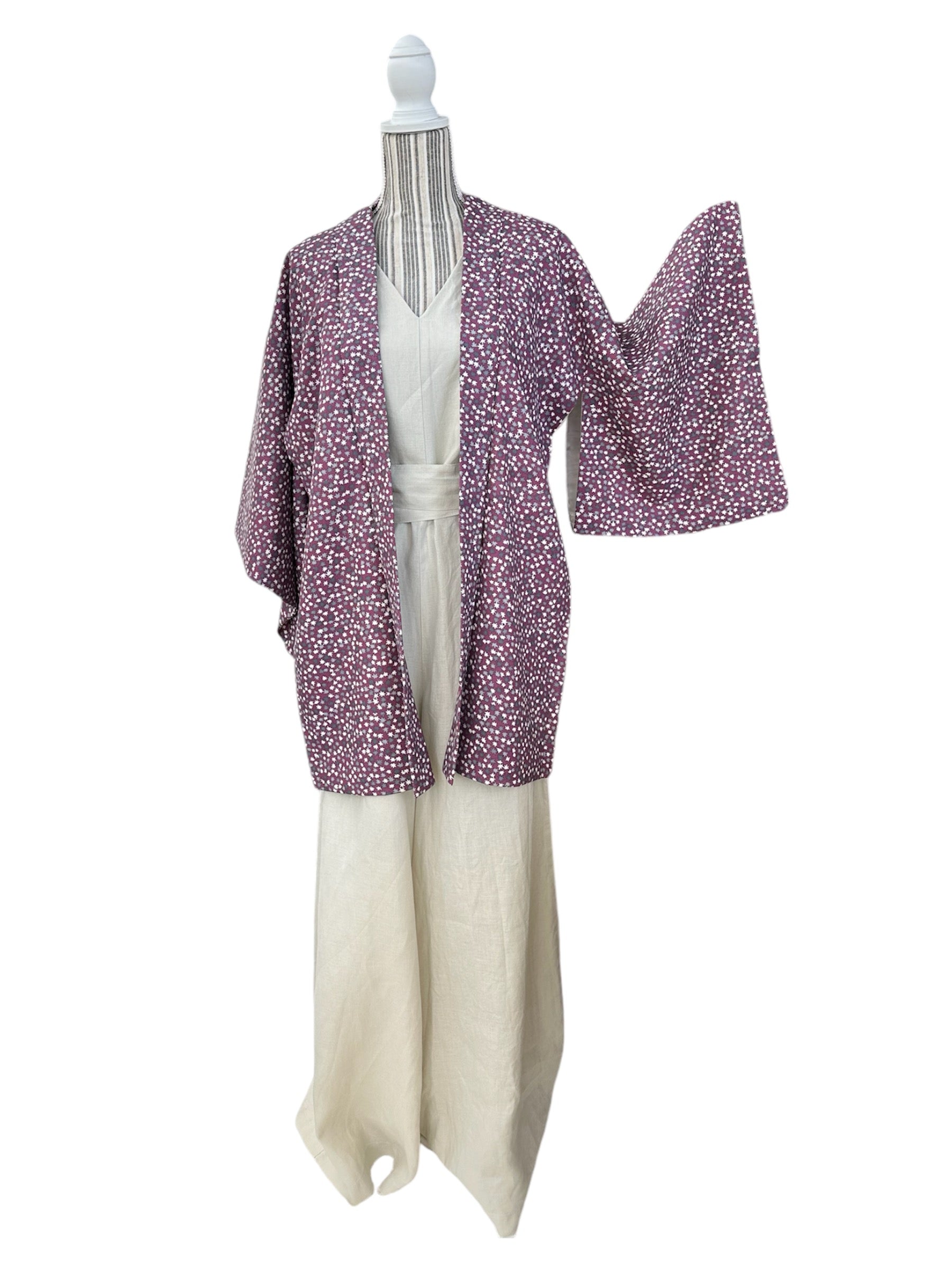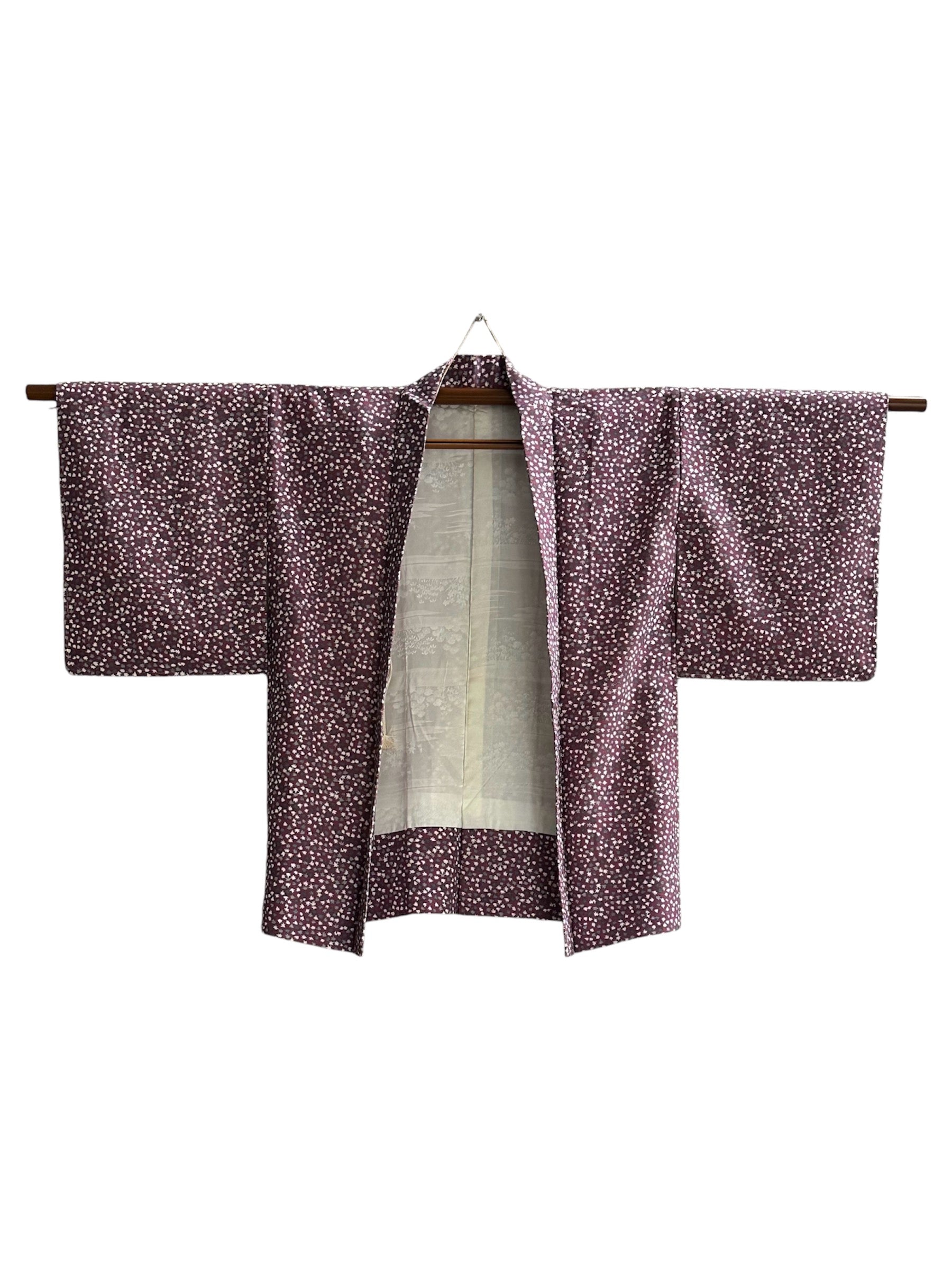 Description: This stunning Suoh color cotton haori showcases a rich reddish-purple base, adorned with delicate small momiji leaves in soft shades of grey and white. The intricate leaf patterns add a touch of elegance and a natural motif that beautifully complements the deep color of the haori.