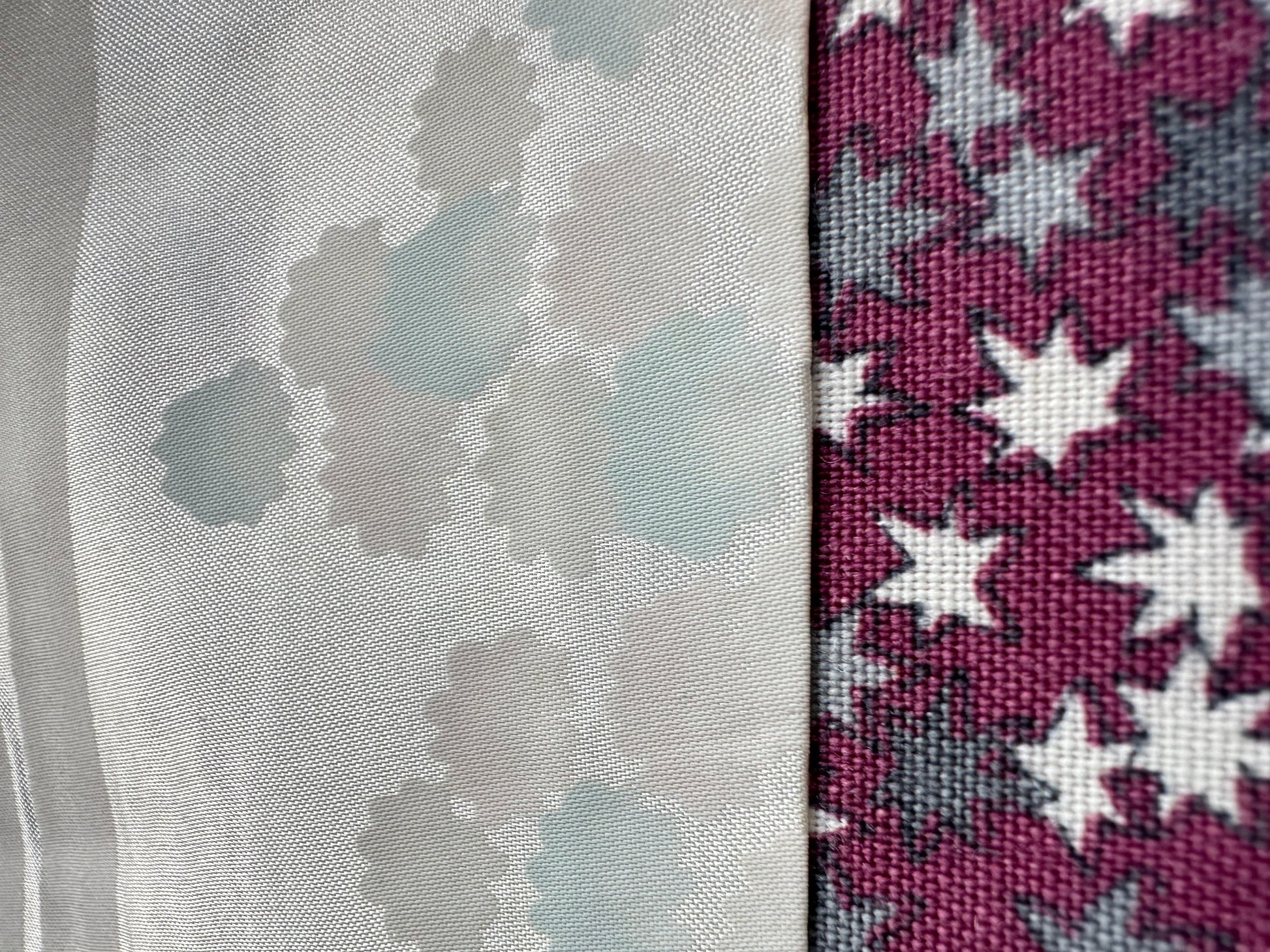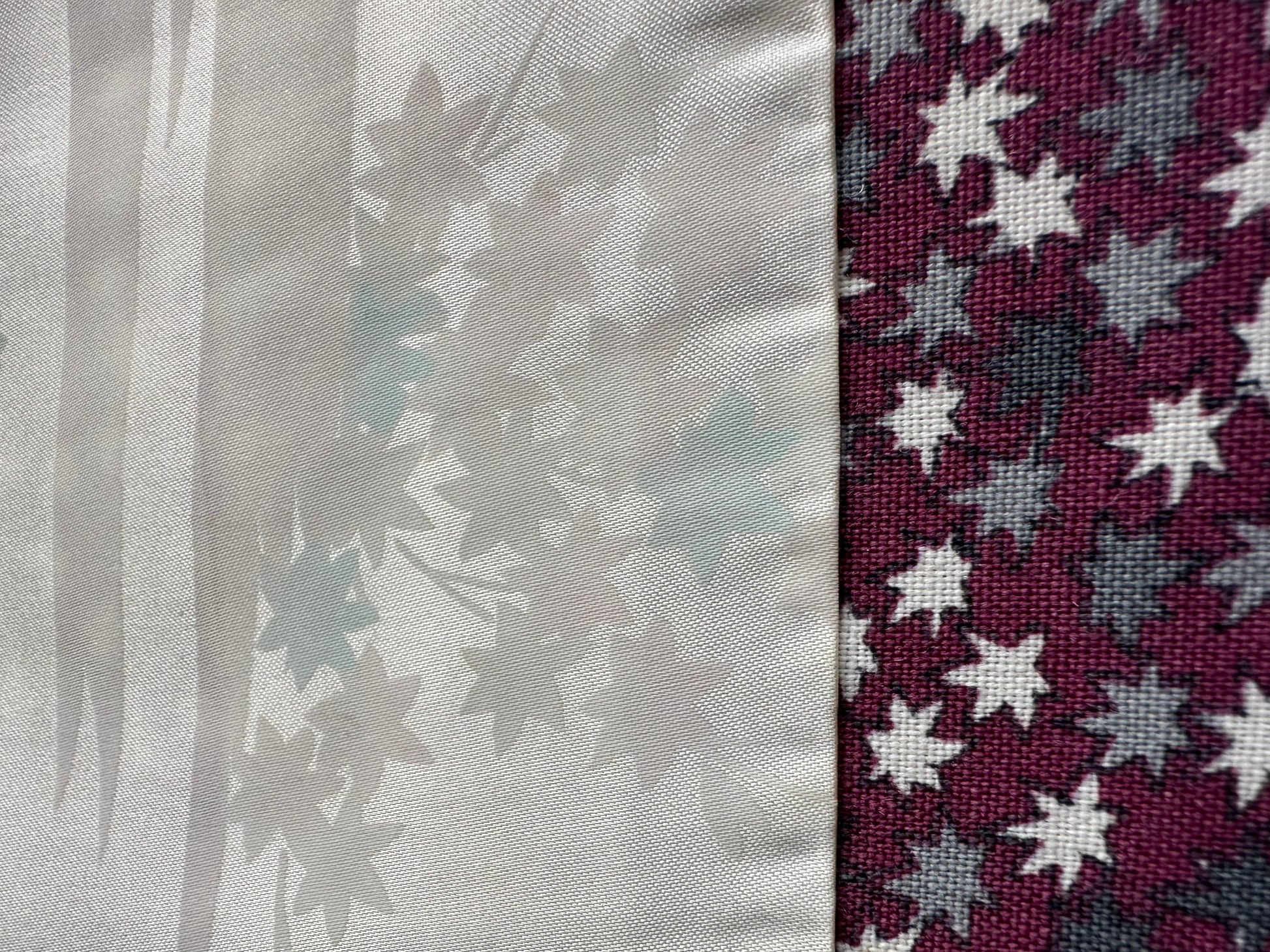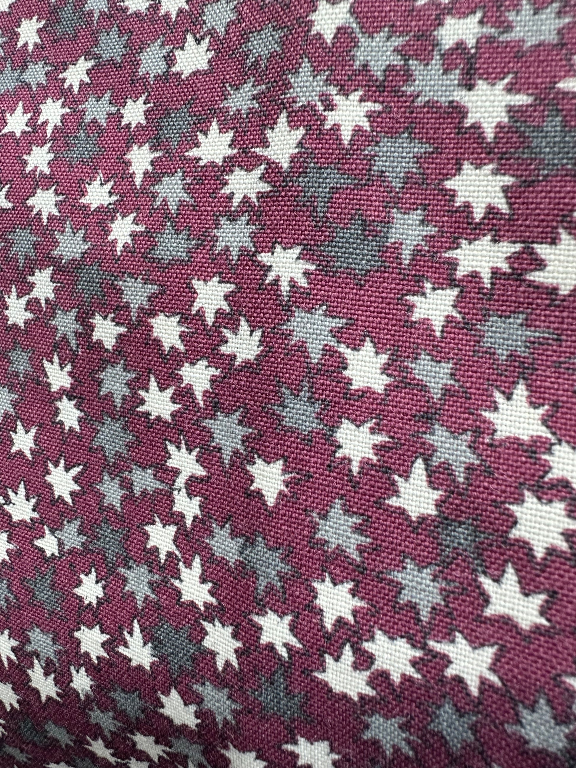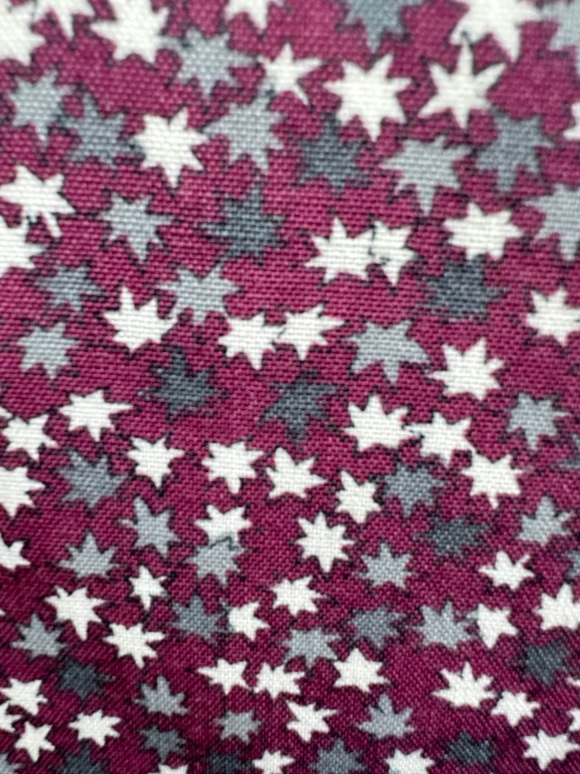 Description: This stunning Suoh color cotton haori showcases a rich reddish-purple base, adorned with delicate small momiji leaves in soft shades of grey and white. The intricate leaf patterns add a touch of elegance and a natural motif that beautifully complements the deep color of the haori.
