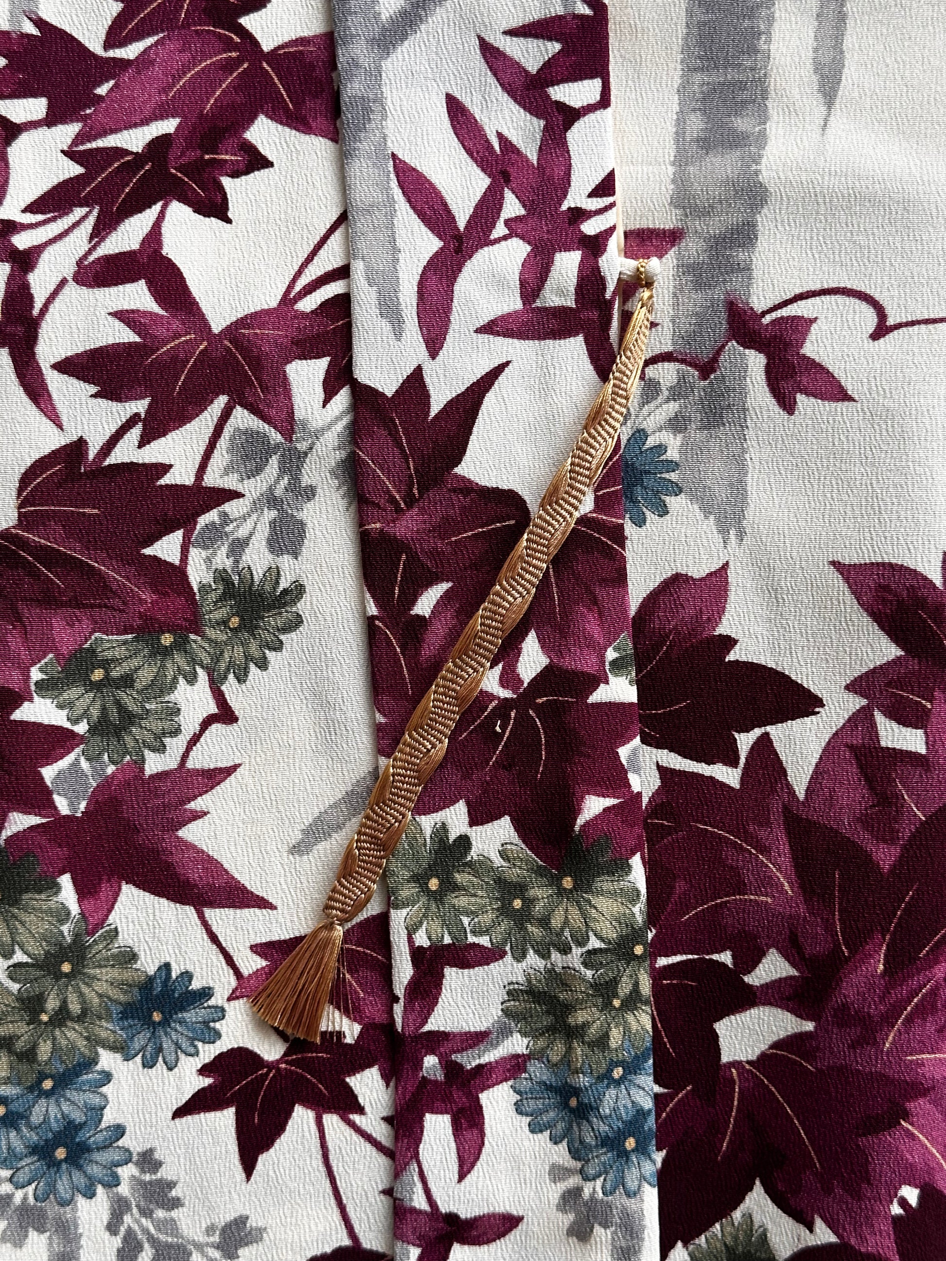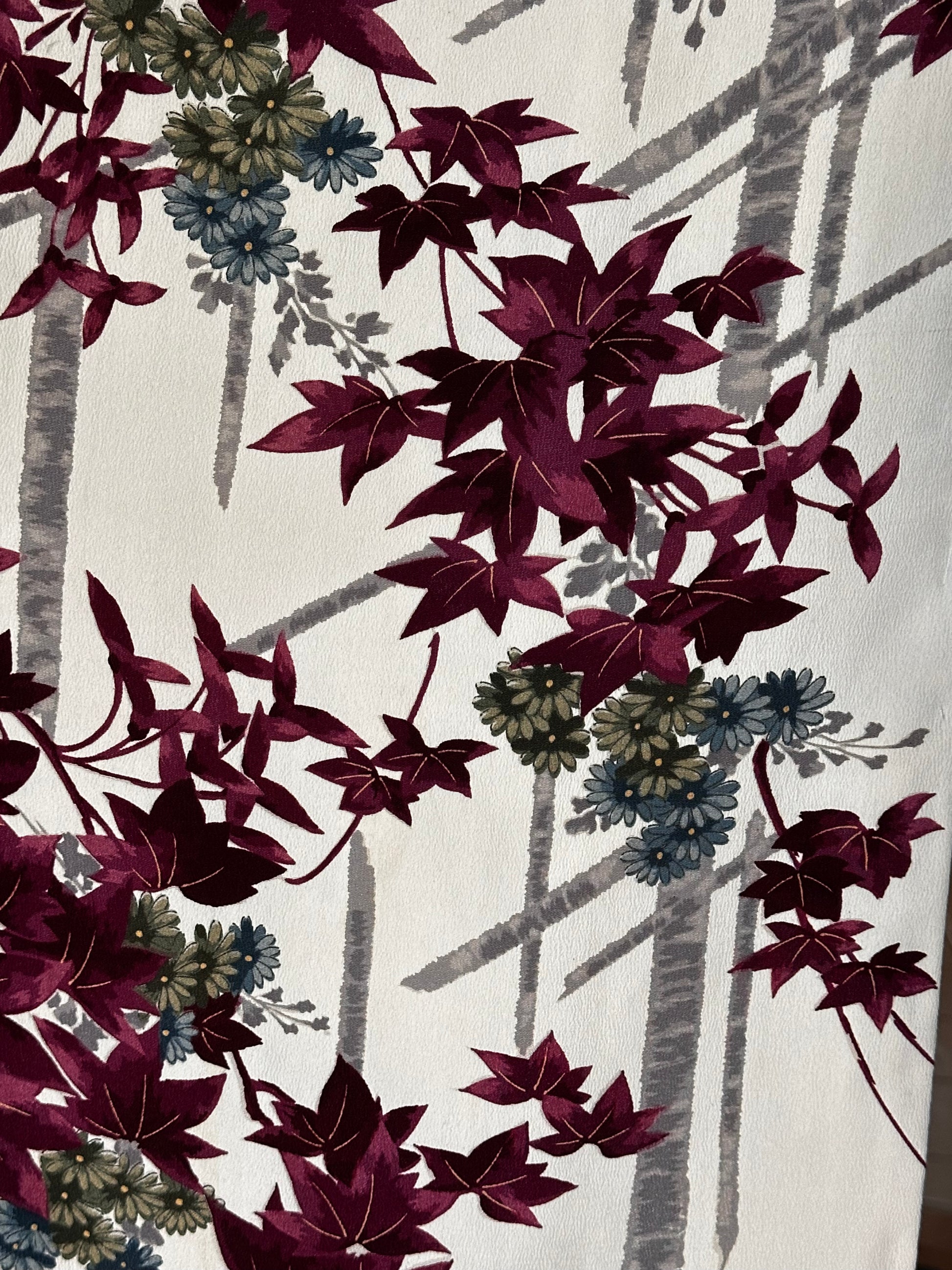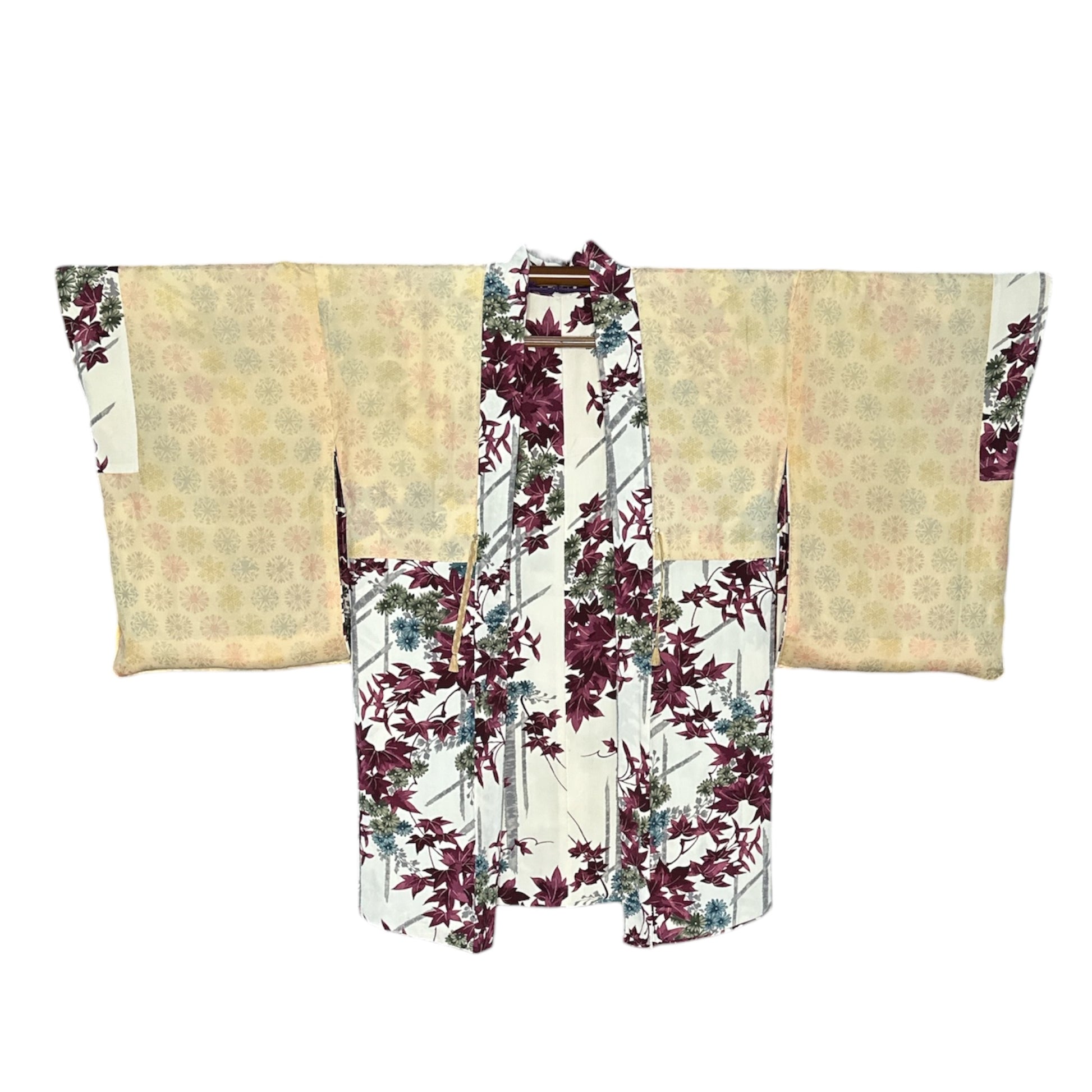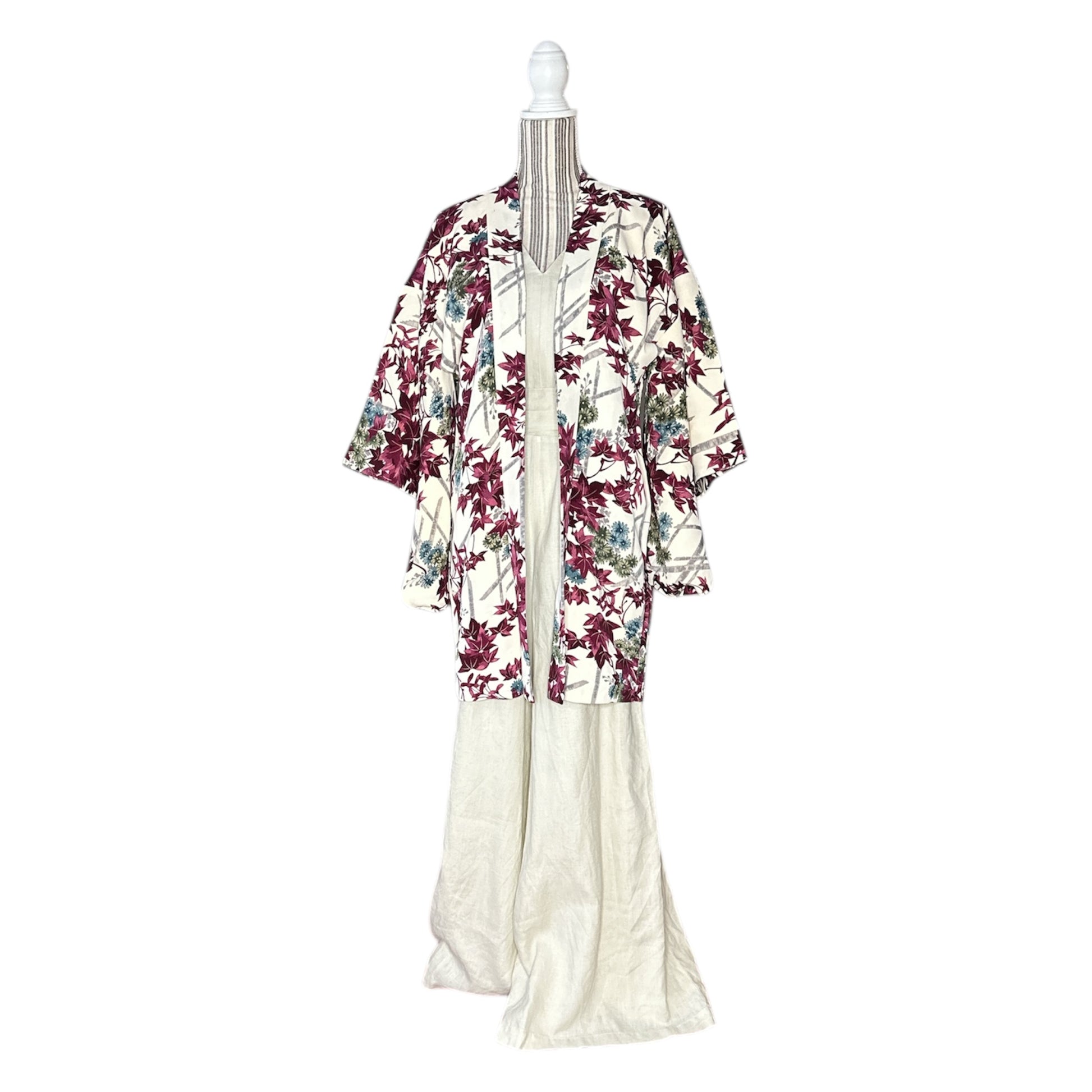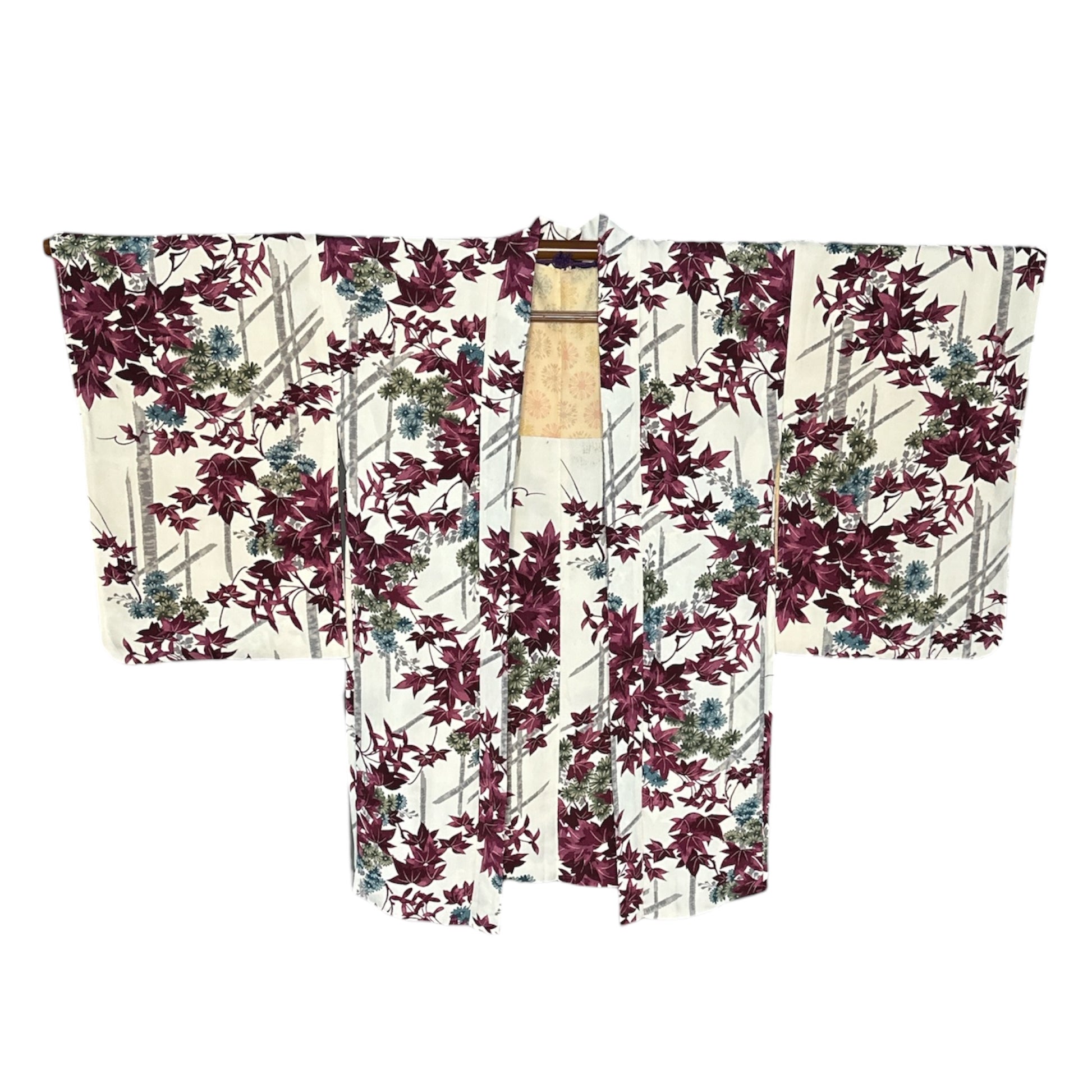 Description: This women’s vintage haori features a soft white-cream base that provides a luminous canvas for its striking floral design. Deep burgundy maple leaves (momiji) create a rich, dramatic contrast, while hand-painted chrysanthemums in vibrant shades of green and blue bring energy and movement to the composition.