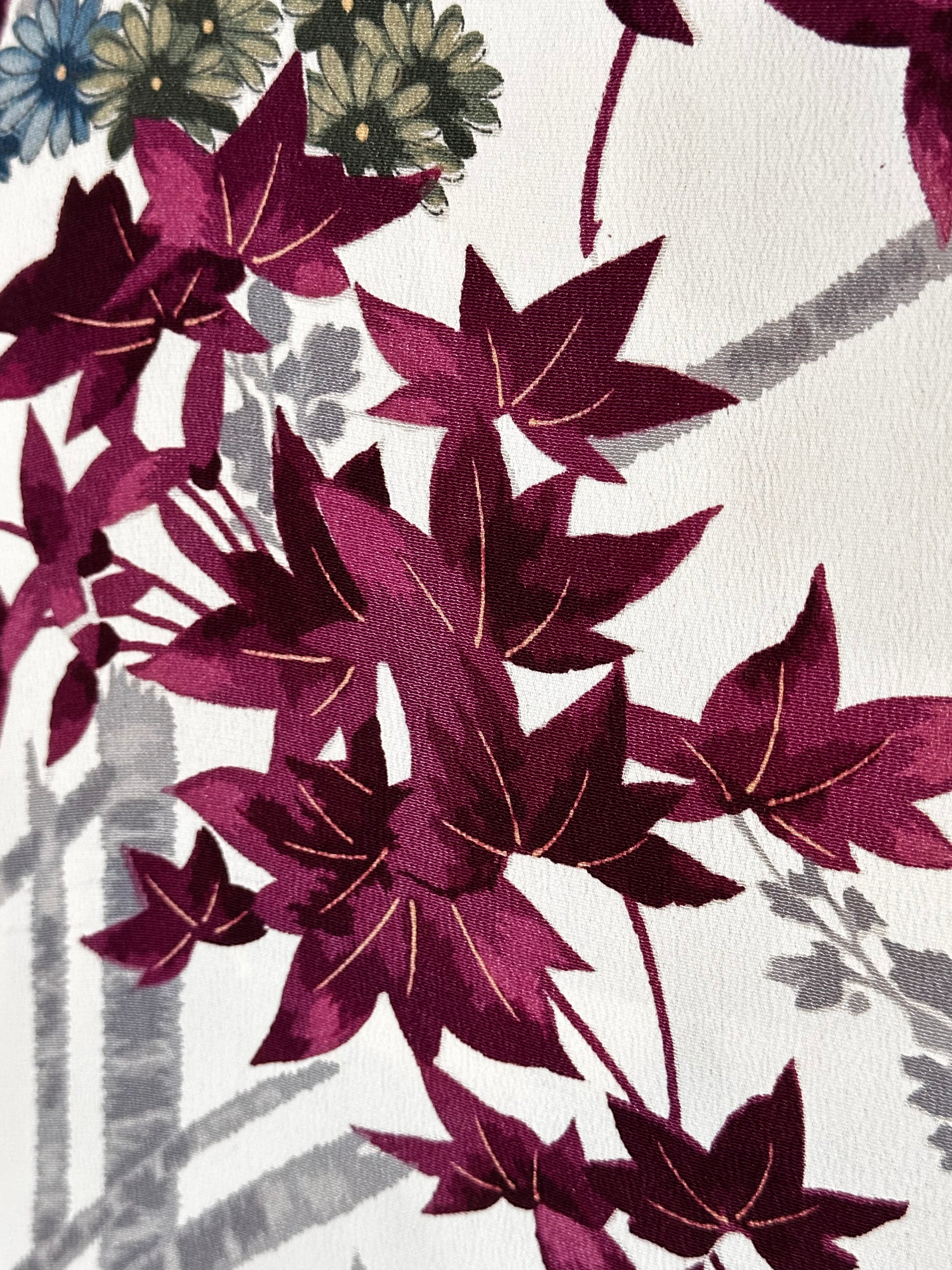 The combination of autumn maple leaves and chrysanthemums—flowers long associated with longevity and refinement—gives this haori a dynamic yet balanced presence.