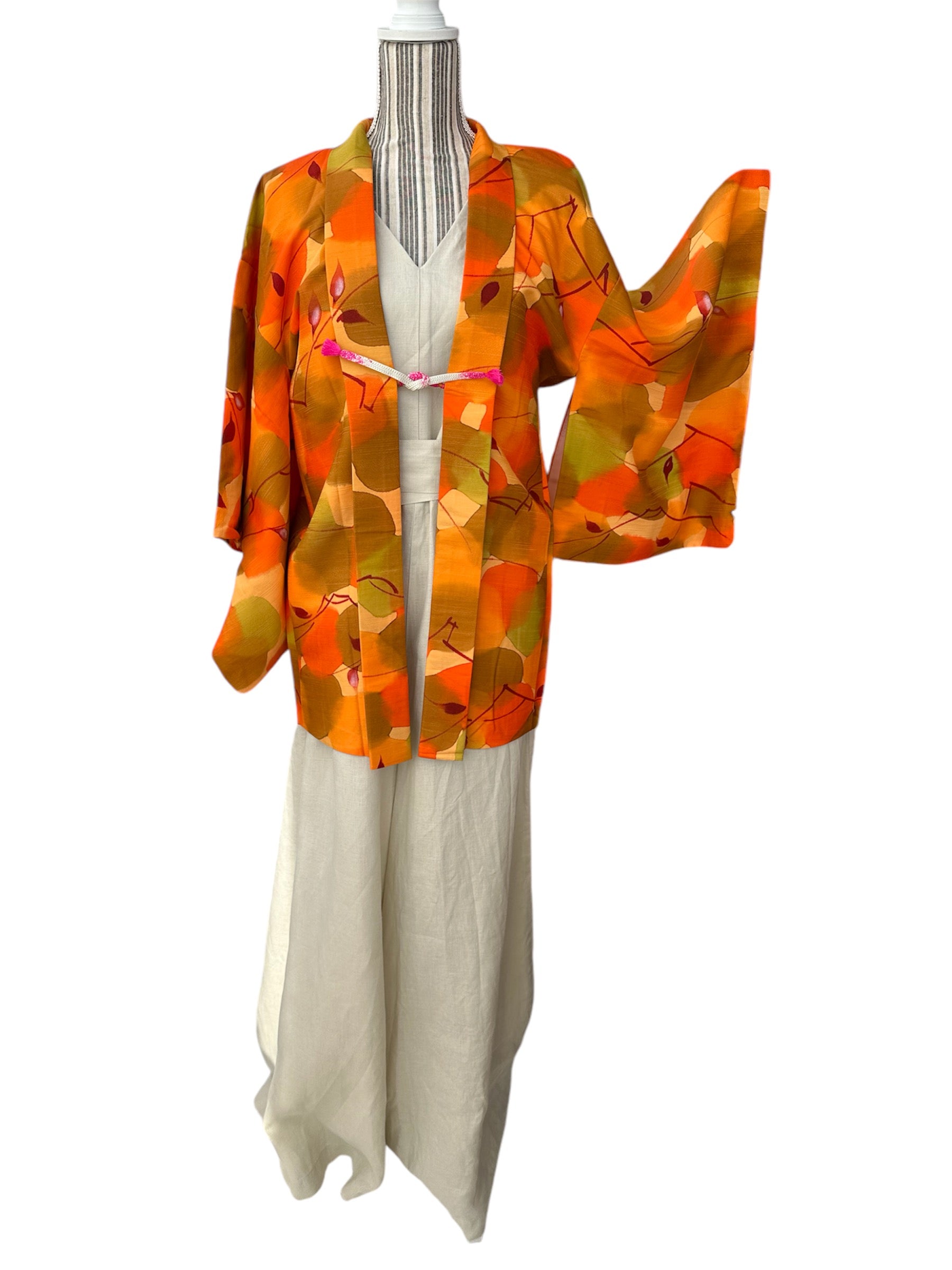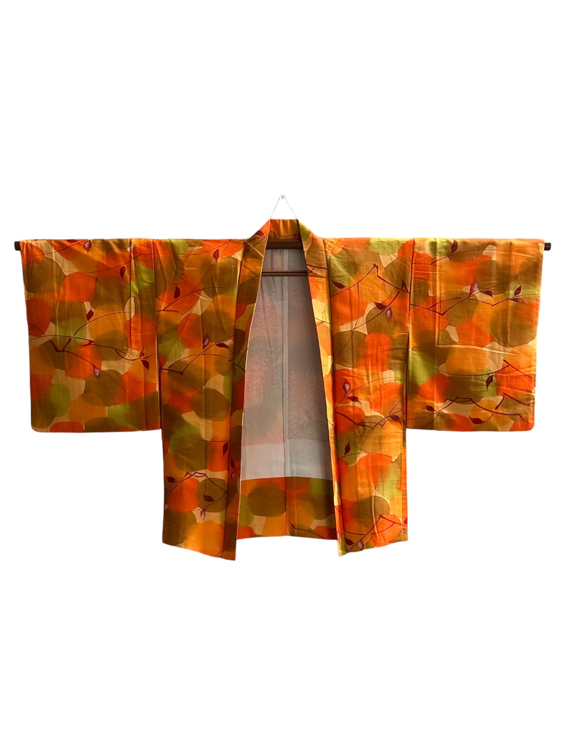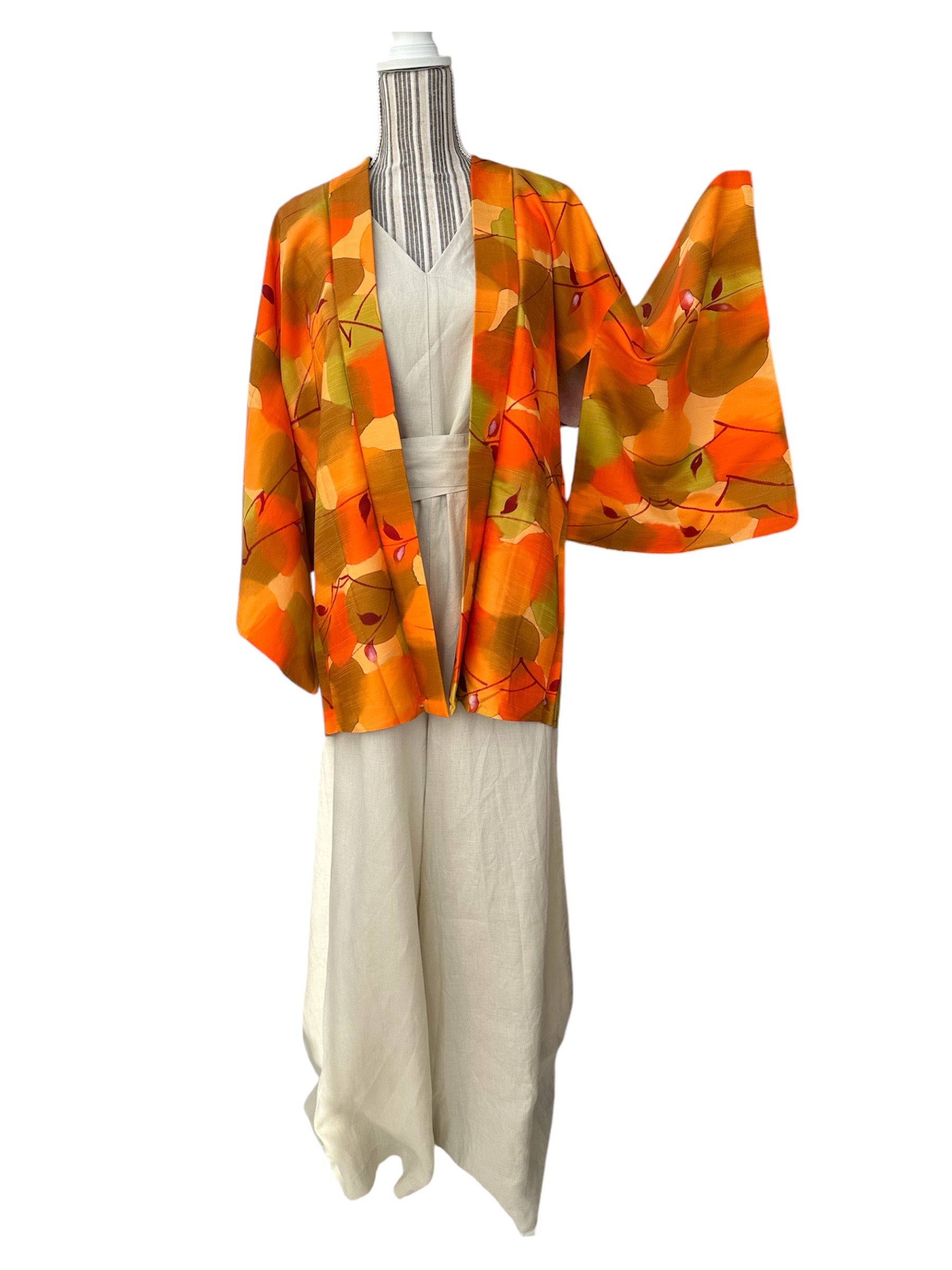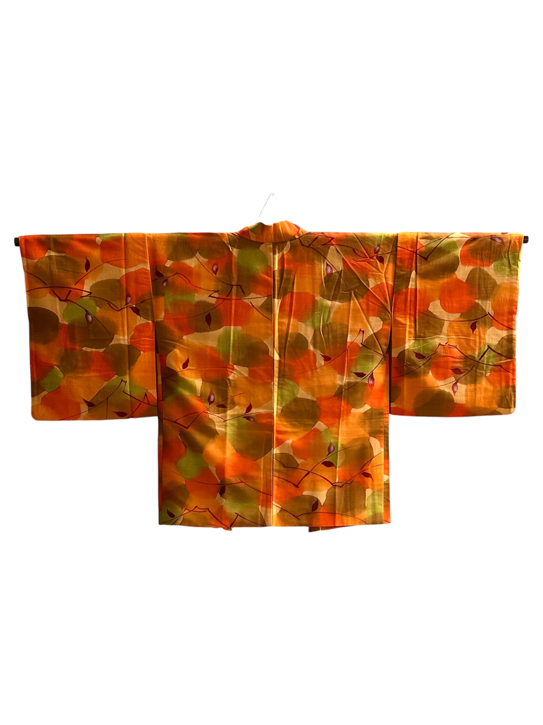 Description: This vibrant haori is a true celebration of color, featuring an array of vivid orange hues intertwined with rich autumn shades of green and red. The design mimics a watercolor painting, with leaves gracefully cascading across the fabric, creating a stunning visual tapestry that embodies the essence of the fall season.