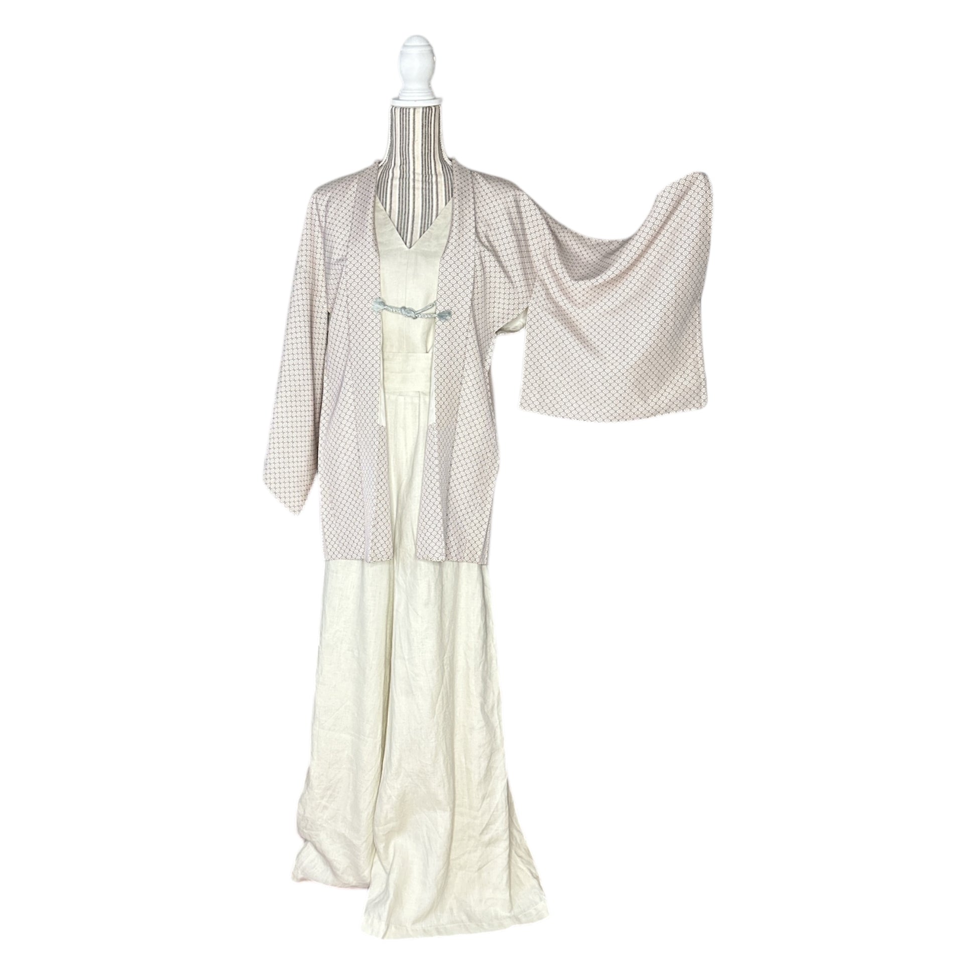 Fabric: Light silk with Edo komon design, combining a soft sheen with intricate geometric detail.