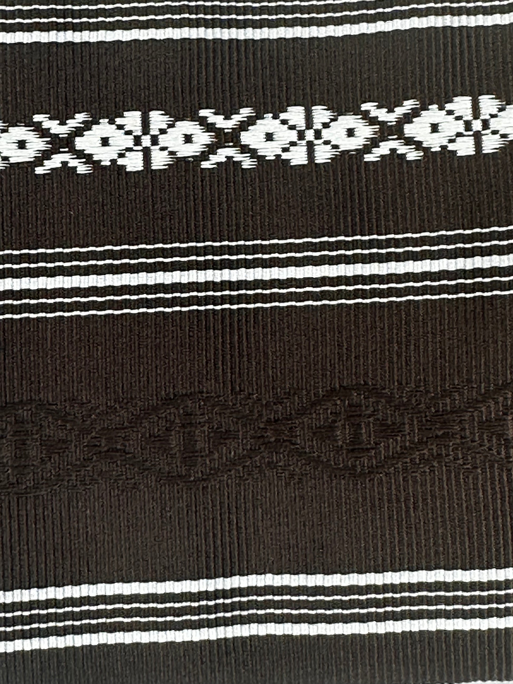 Description: This distinguished men’s kakuhaba obi features a deep, rich brown base accented with refined white woven motifs. The alternating geometric and line patterns create a timeless sense of balance between tradition and simplicity, while the subtle sheen of the silk adds an understated touch of sophistication.