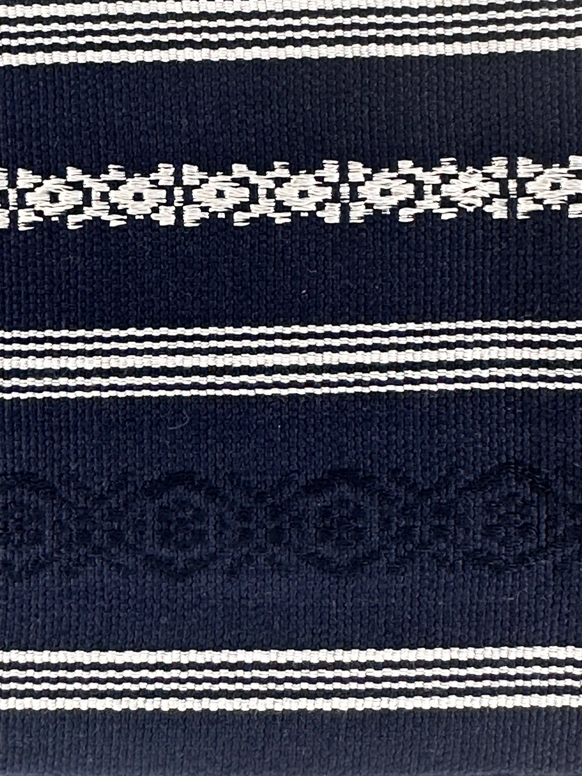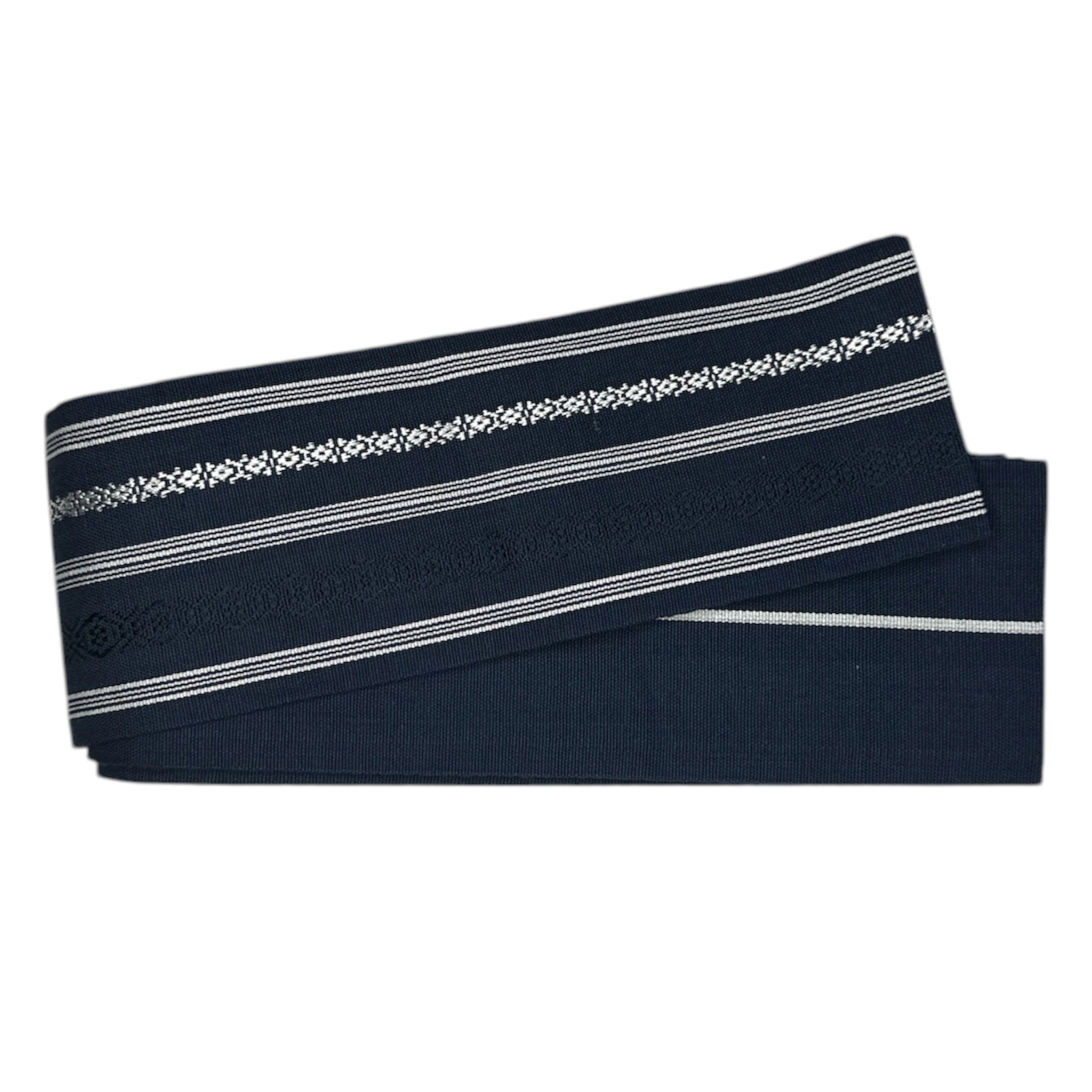Description: This elegant men’s kakuhaba obi features a classic navy blue base accented with fine white horizontal stripes and delicate woven motifs. The refined contrast between the deep indigo tone and crisp white detailing creates a dignified, modern appeal while preserving a sense of traditional Japanese style.