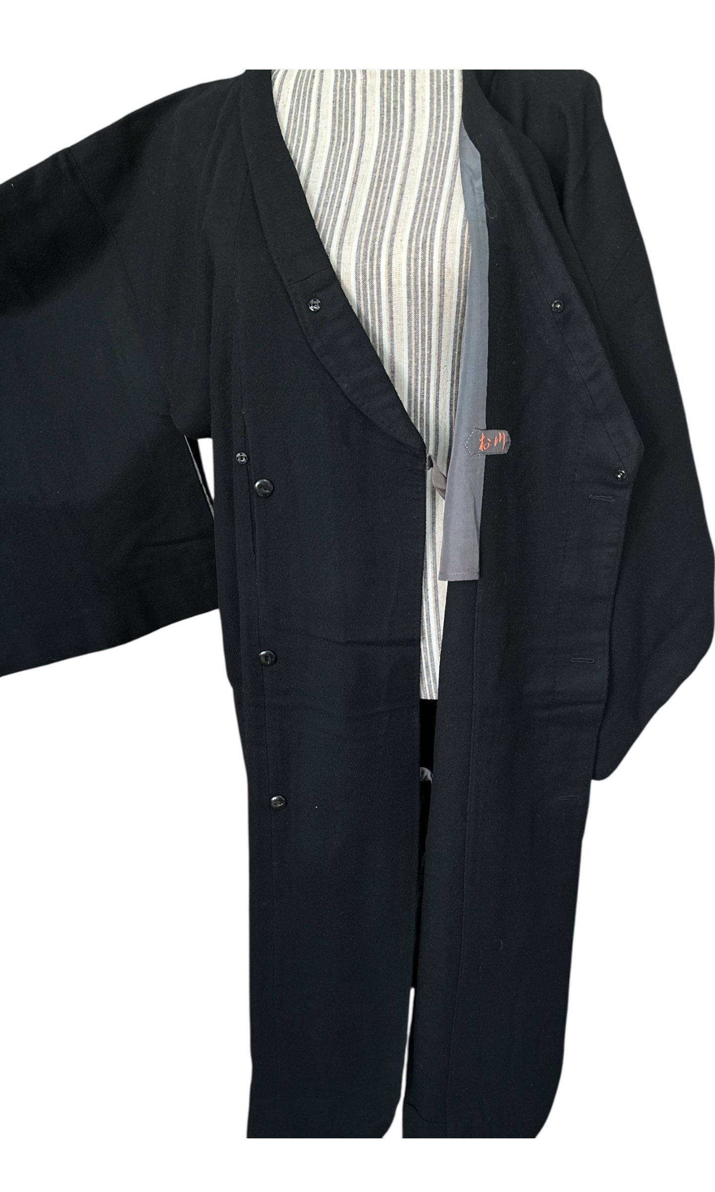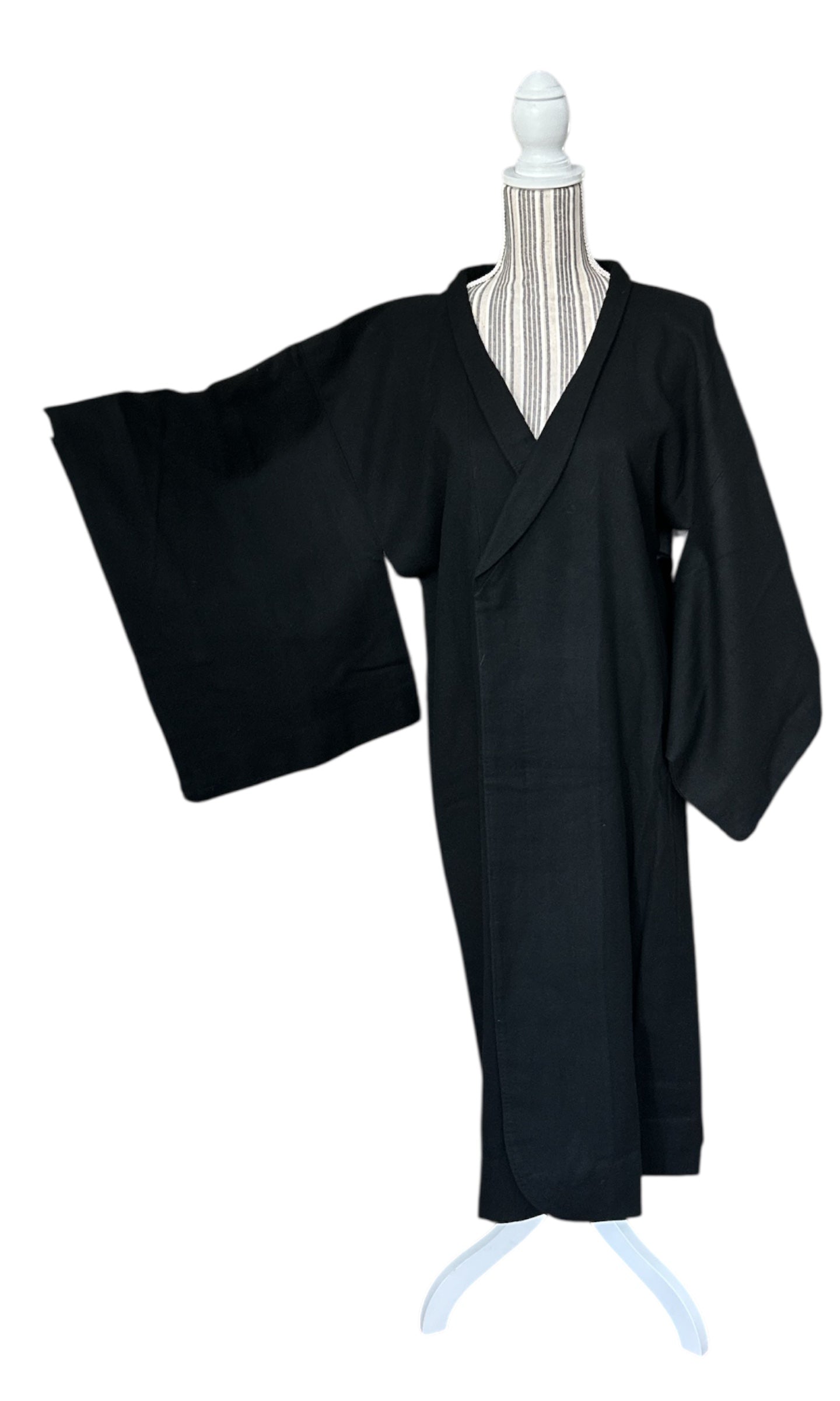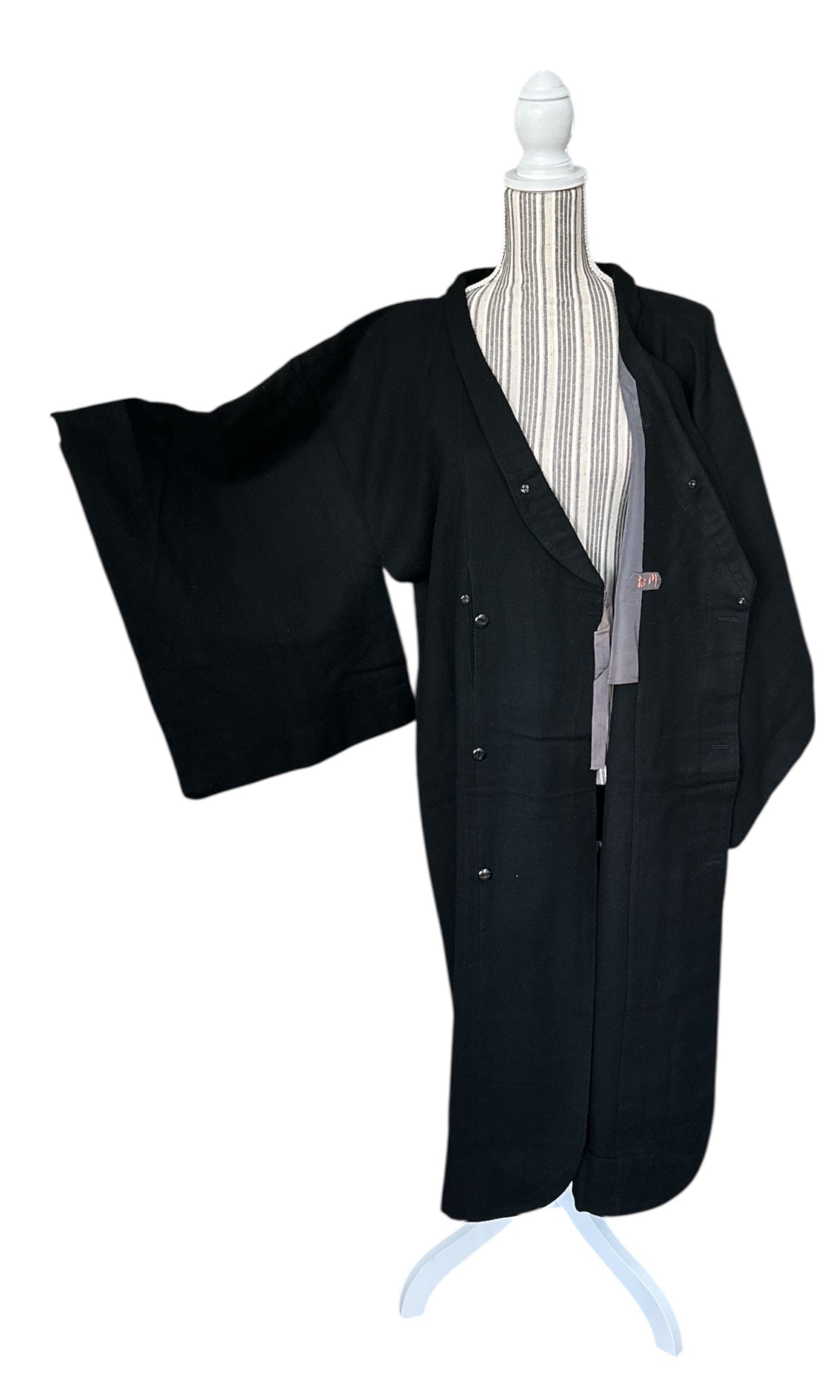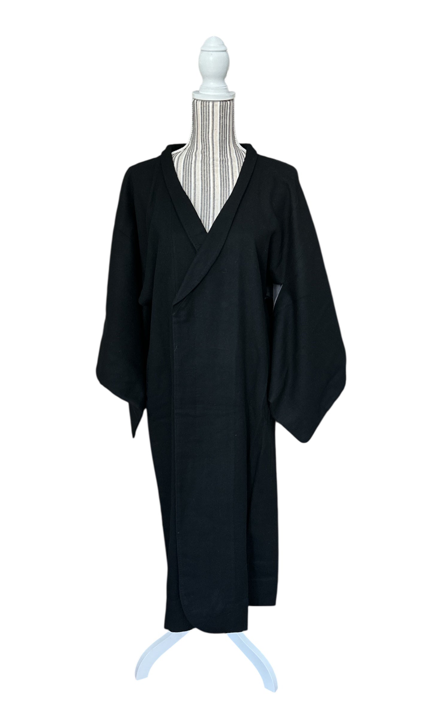 Description: This beautiful vintage Japanese haori coat is a timeless and versatile piece that blends traditional craftsmanship with modern style. Made from a warm wool blend, it drapes gracefully and offers both structure and softness. The coat features a classic, deep black exterior for timeless simplicity, making it easy to style with everything from casual denim to tailored looks.
