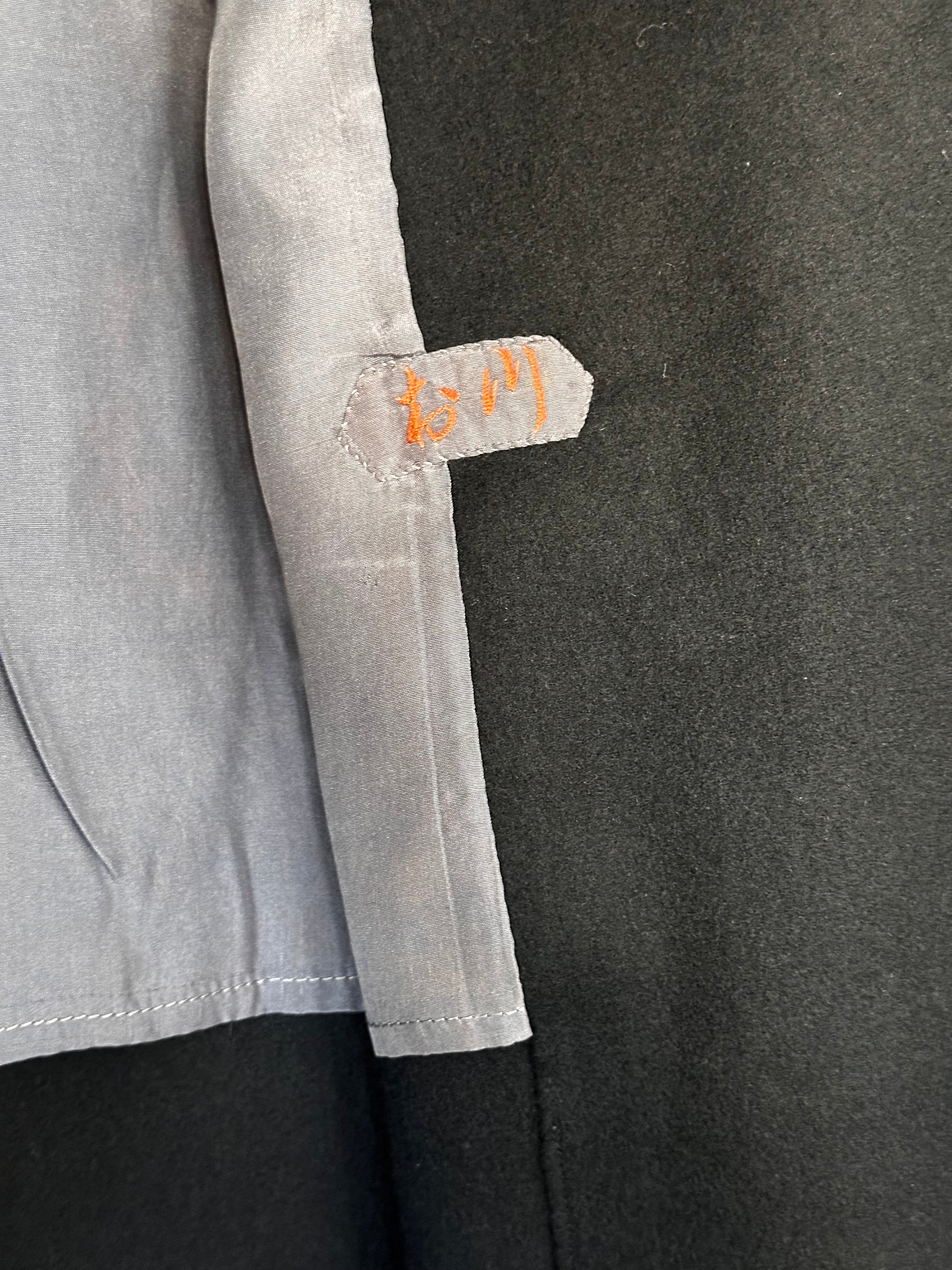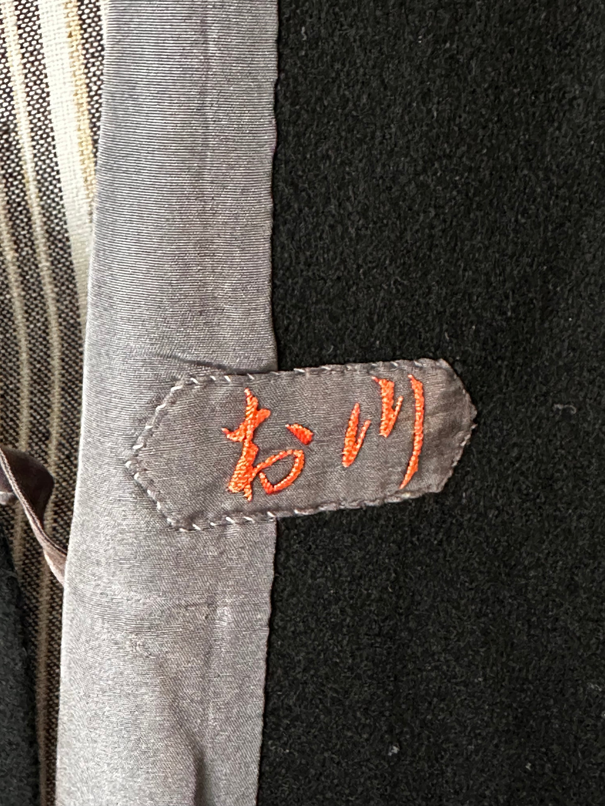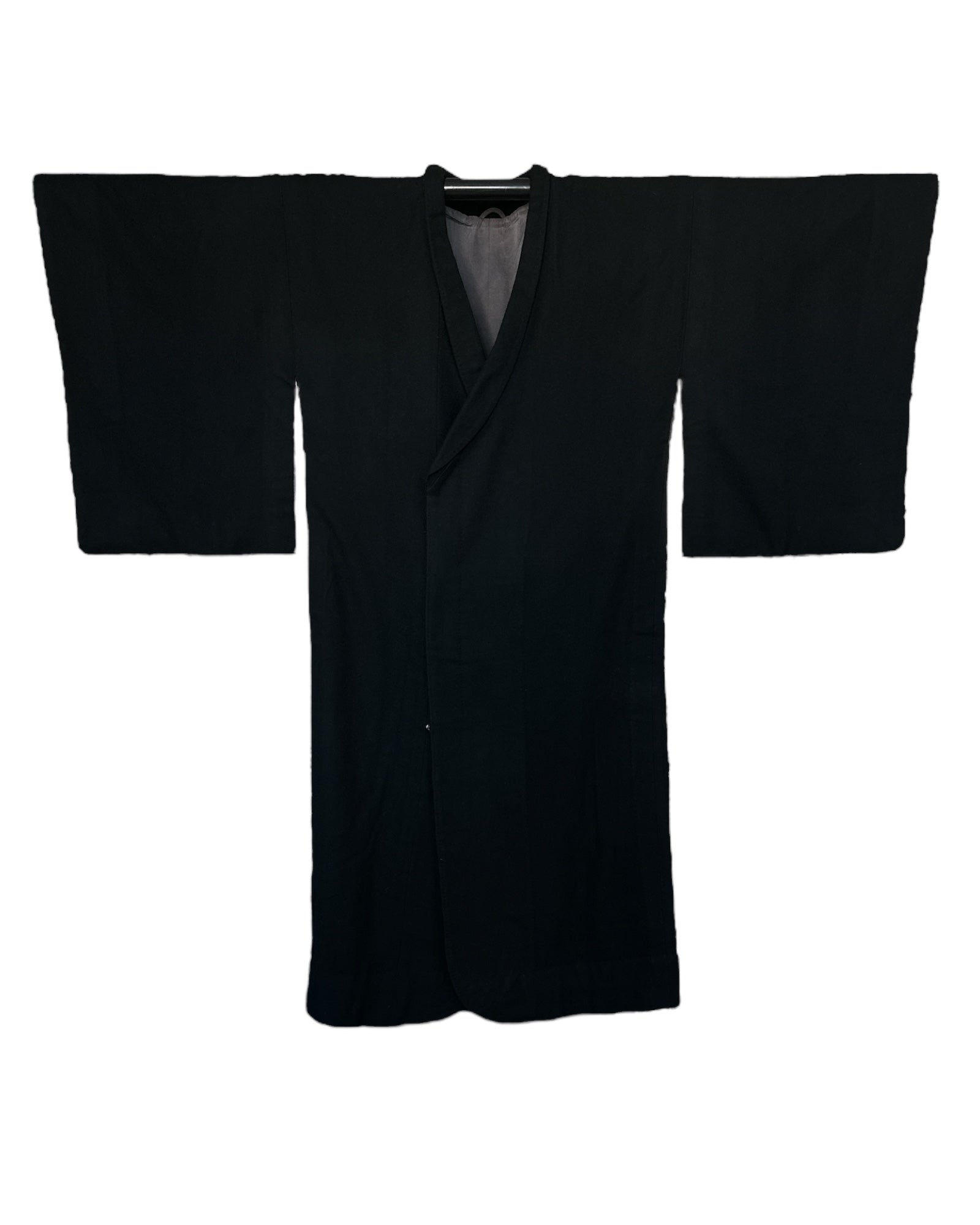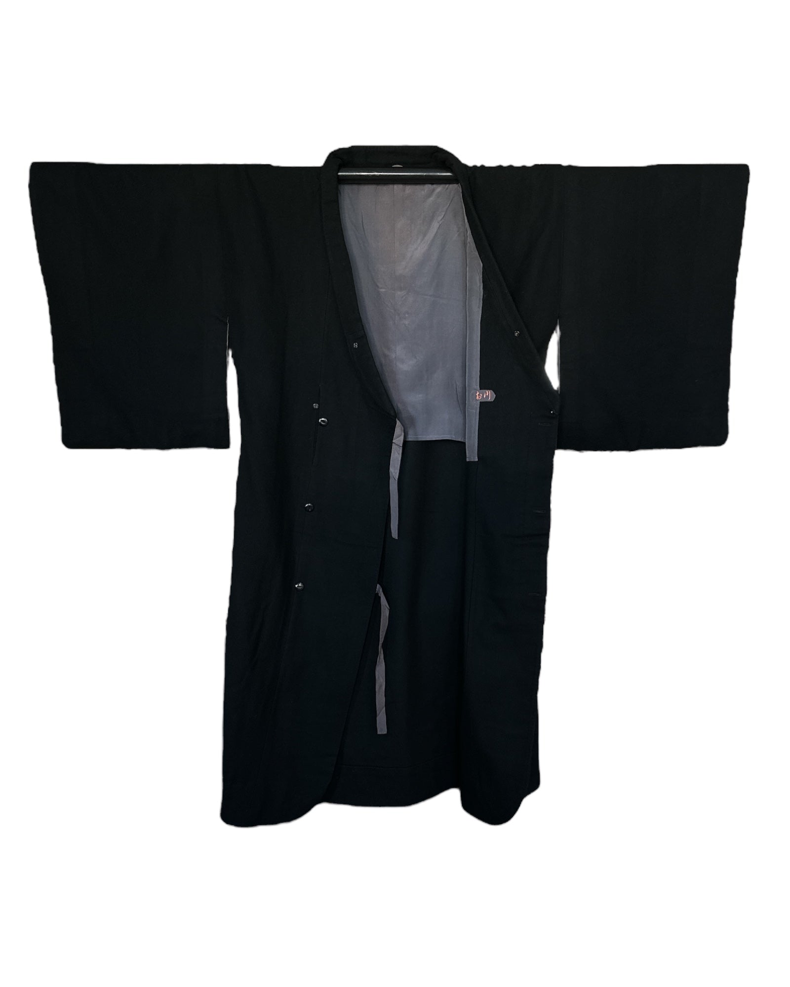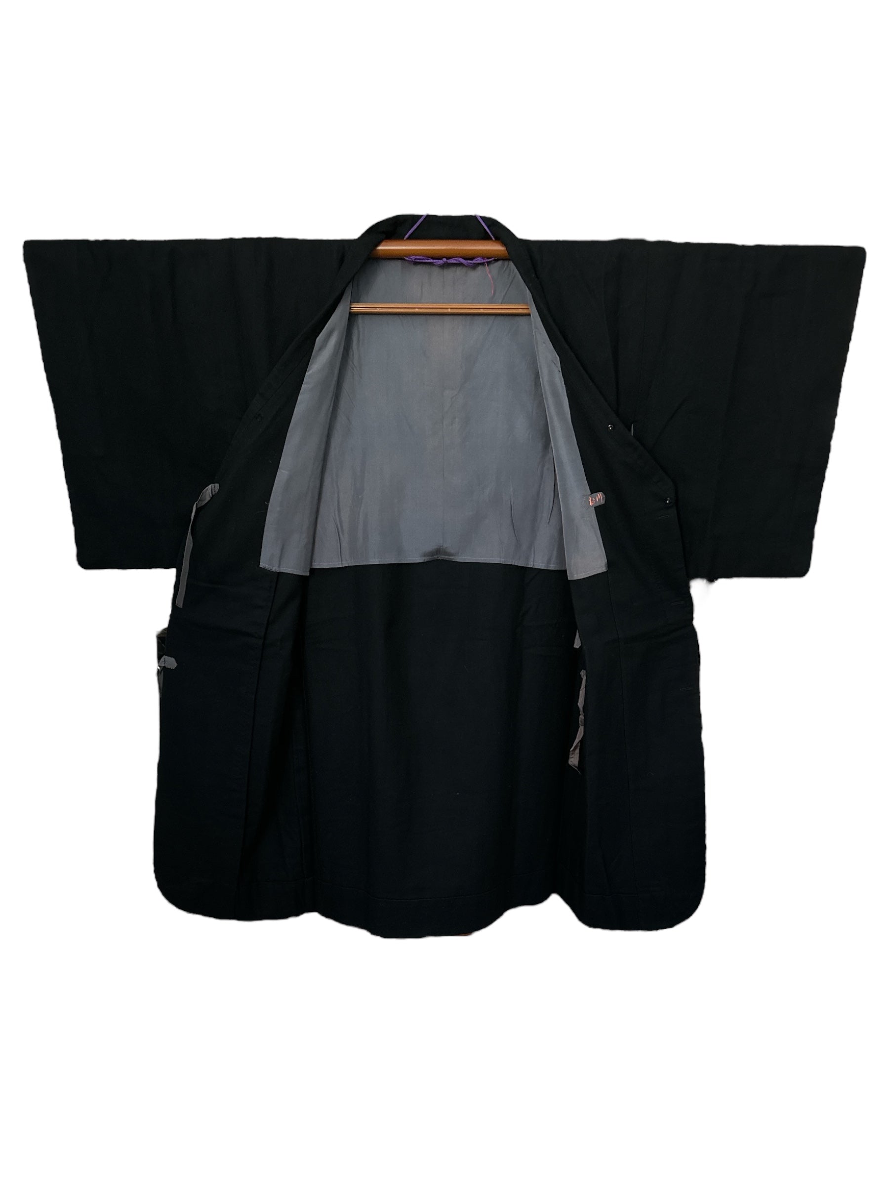 Description: This beautiful vintage Japanese haori coat is a timeless and versatile piece that blends traditional craftsmanship with modern style. Made from a warm wool blend, it drapes gracefully and offers both structure and softness. The coat features a classic, deep black exterior for timeless simplicity, making it easy to style with everything from casual denim to tailored looks.