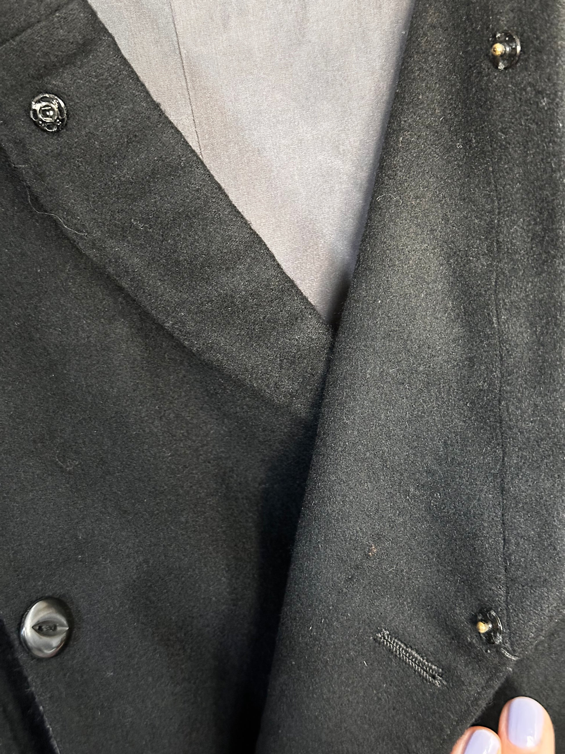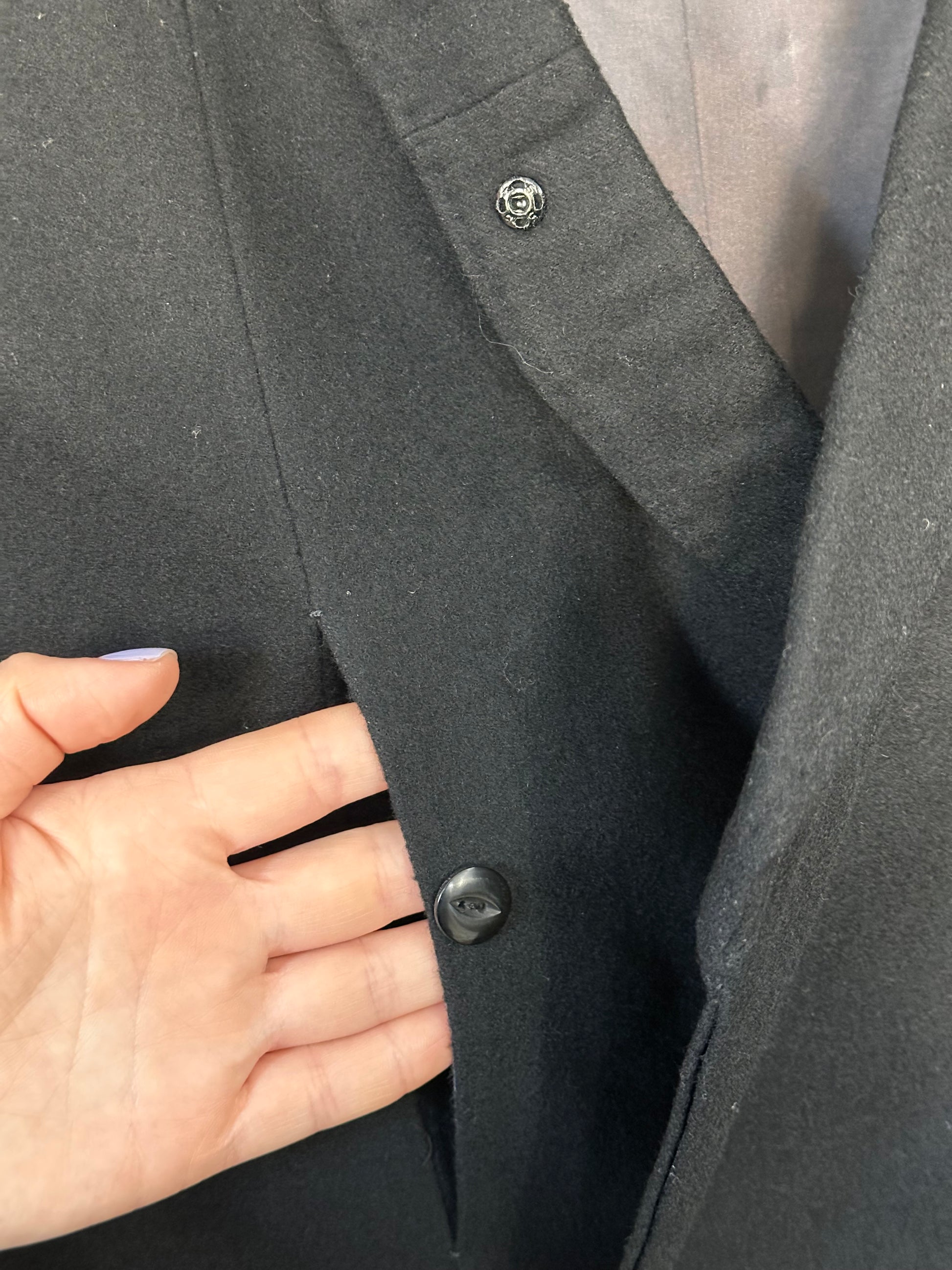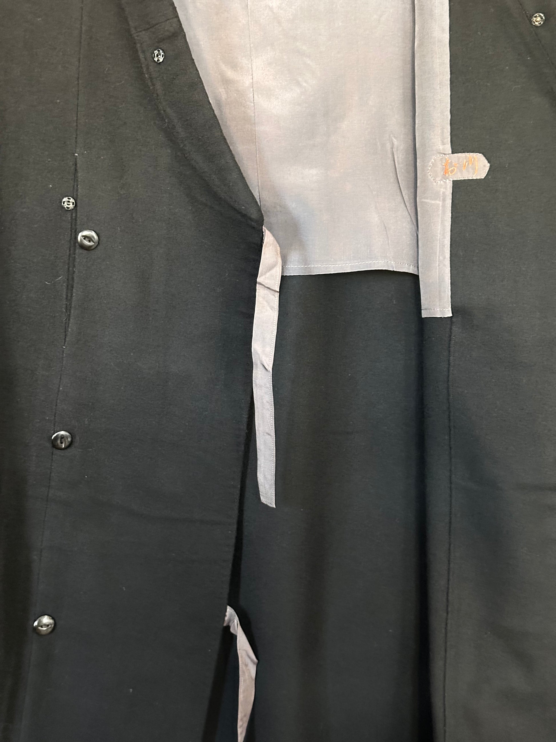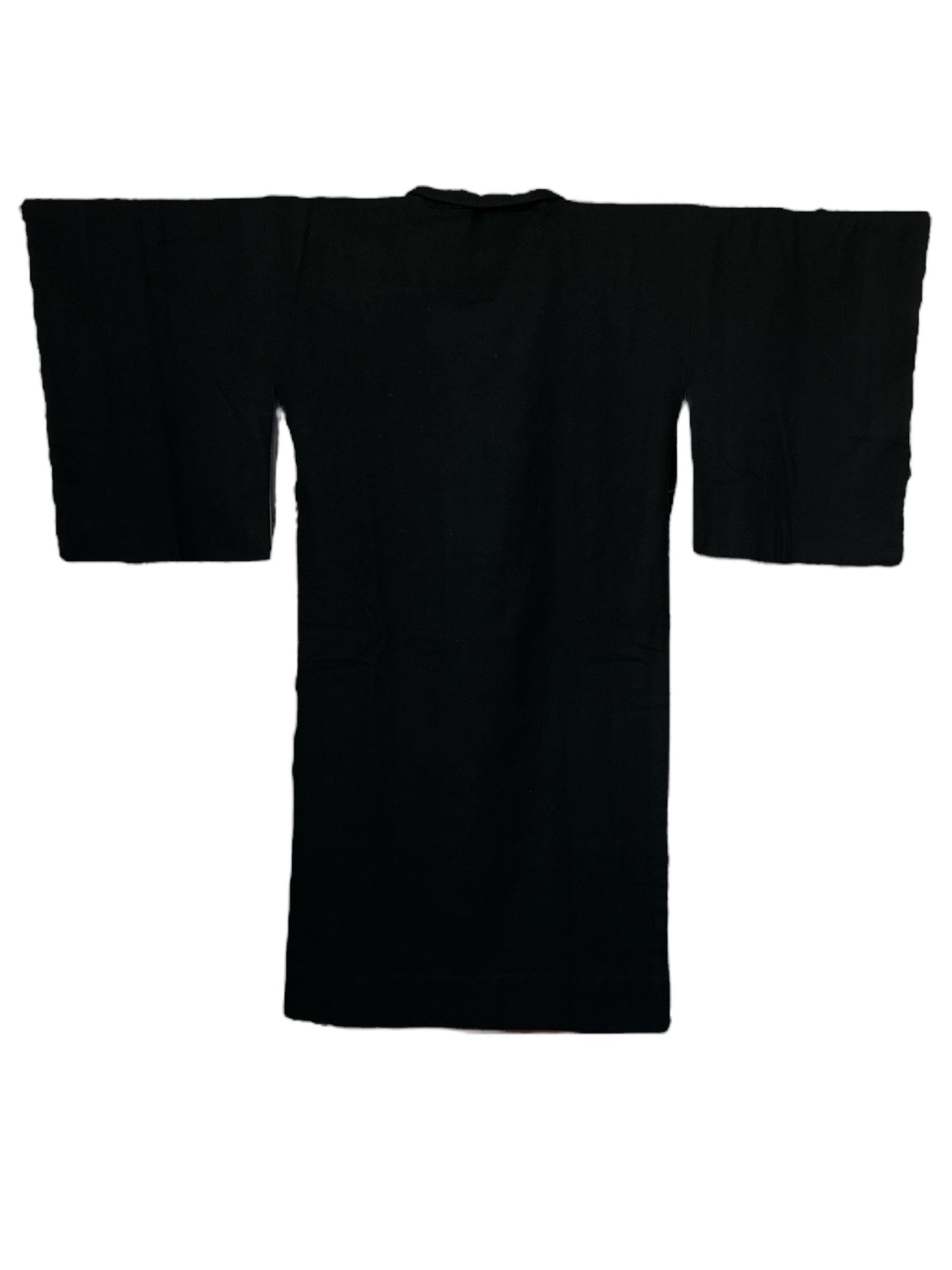 Description: This beautiful vintage Japanese haori coat is a timeless and versatile piece that blends traditional craftsmanship with modern style. Made from a warm wool blend, it drapes gracefully and offers both structure and softness. The coat features a classic, deep black exterior for timeless simplicity, making it easy to style with everything from casual denim to tailored looks.