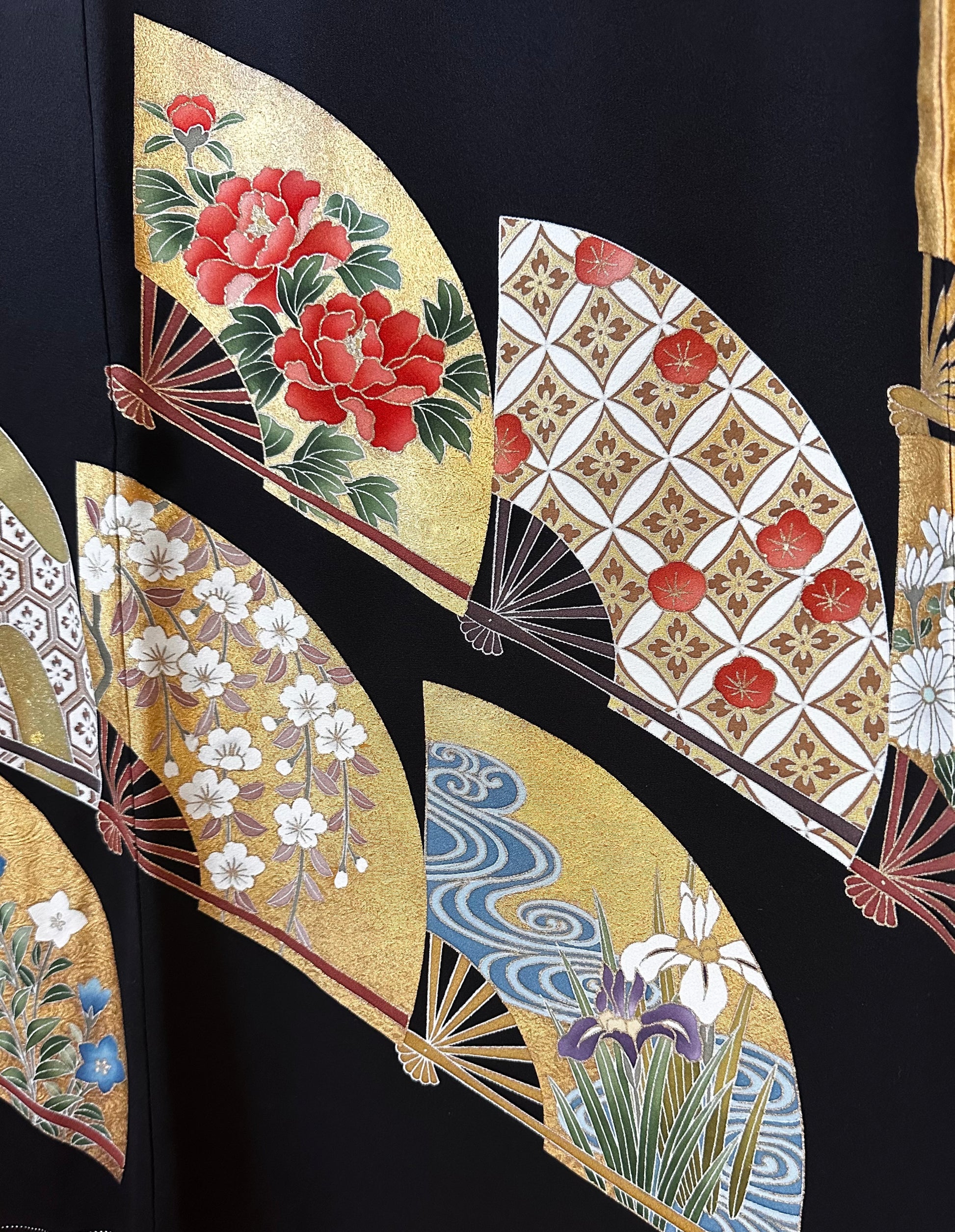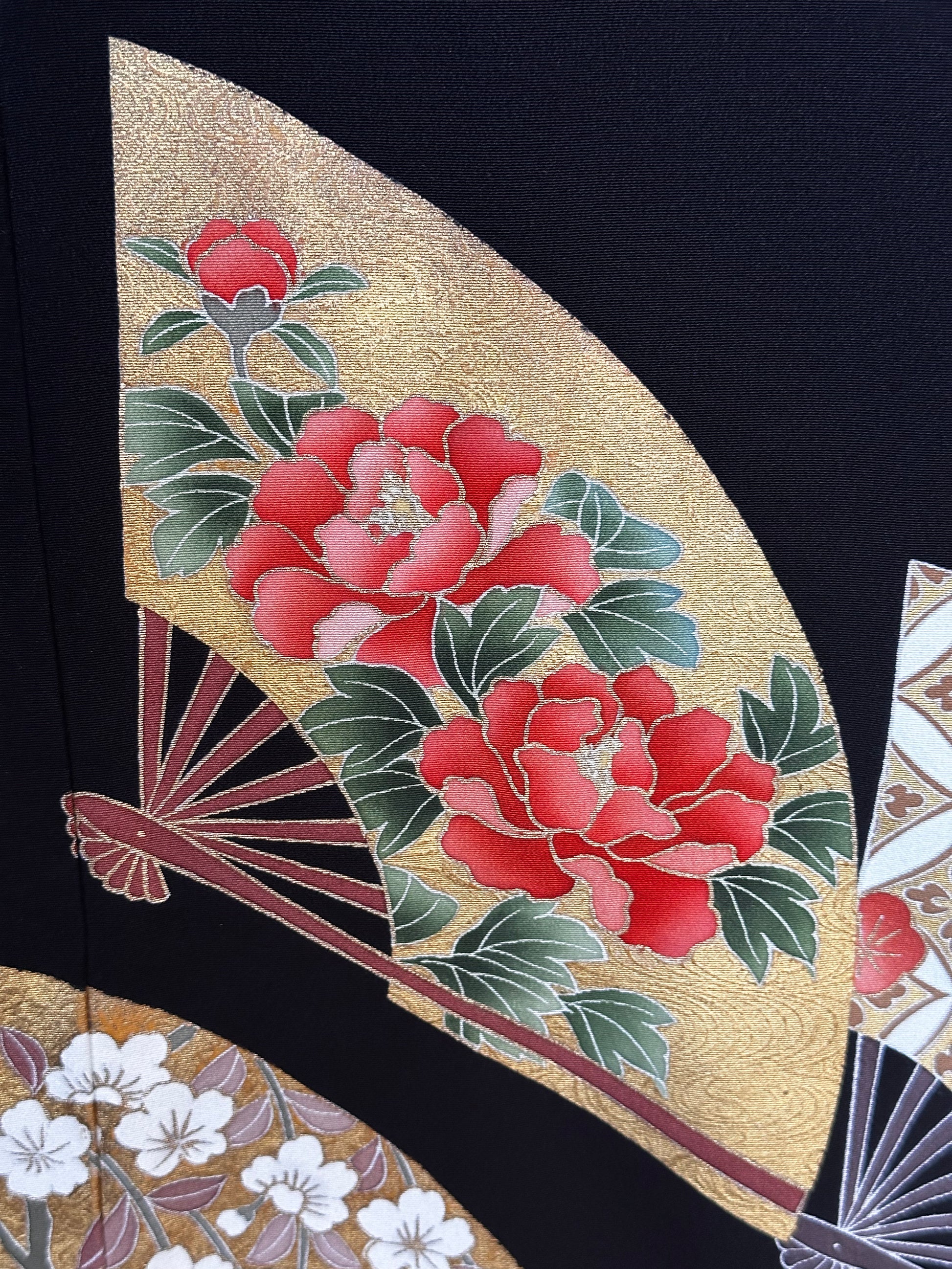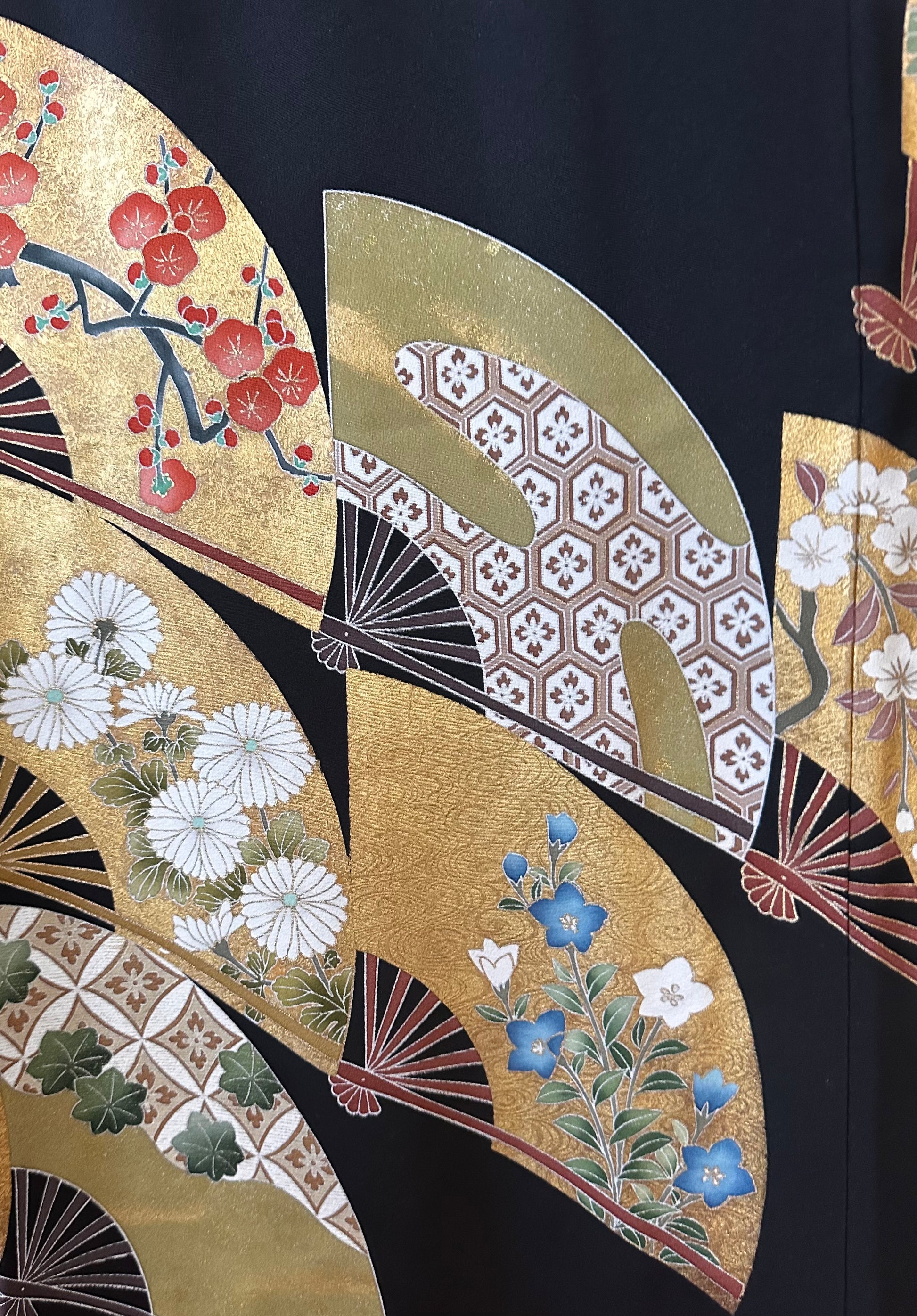 Fabric: Made of rich silk, the kimono features hand-dyed yuzen artwork highlighted by touches of gold metallic thread embroidery and delicate gold accents throughout. The fans appear almost weightless against the deep black background, each one like a miniature painting of floral splendor.