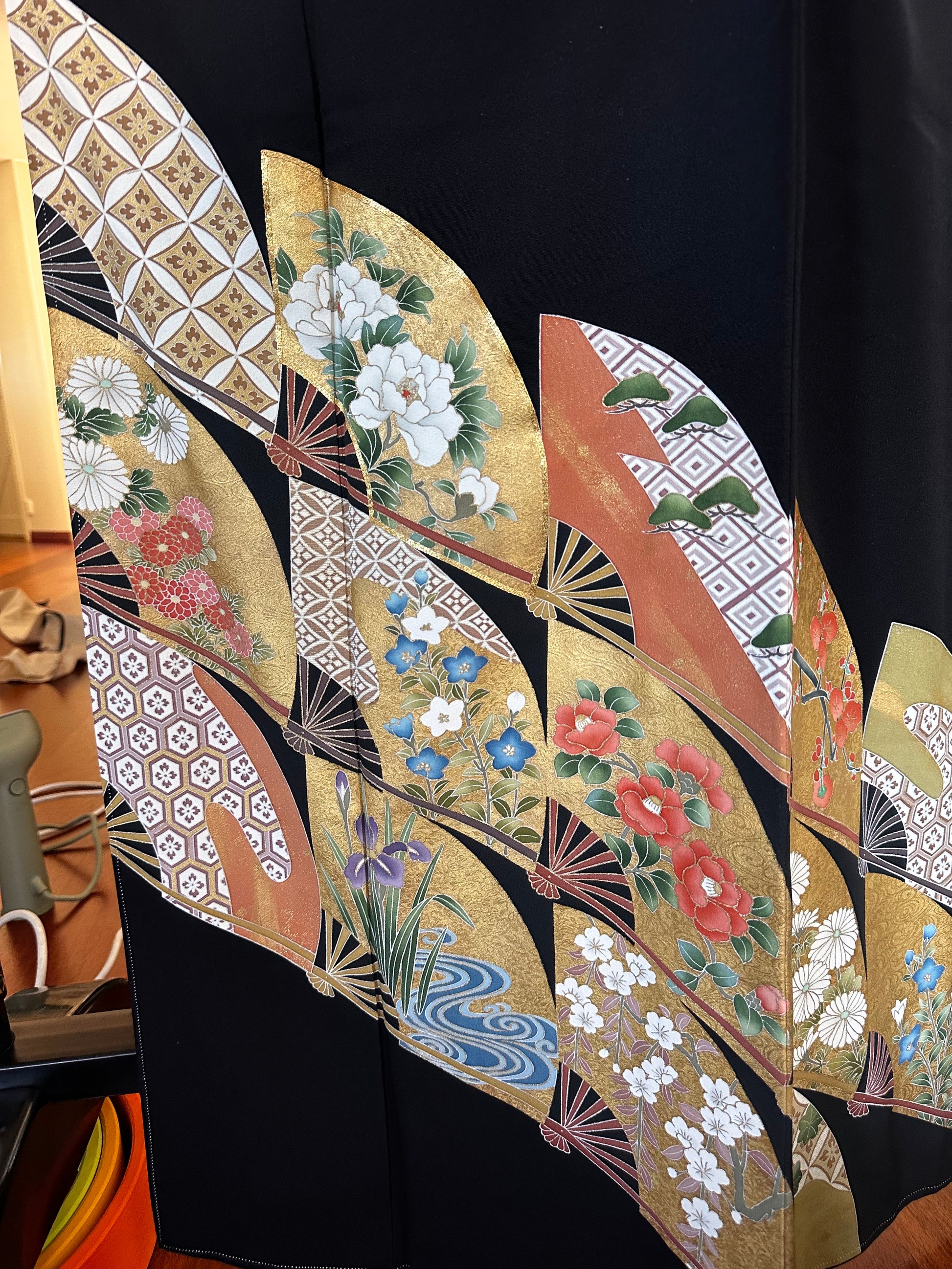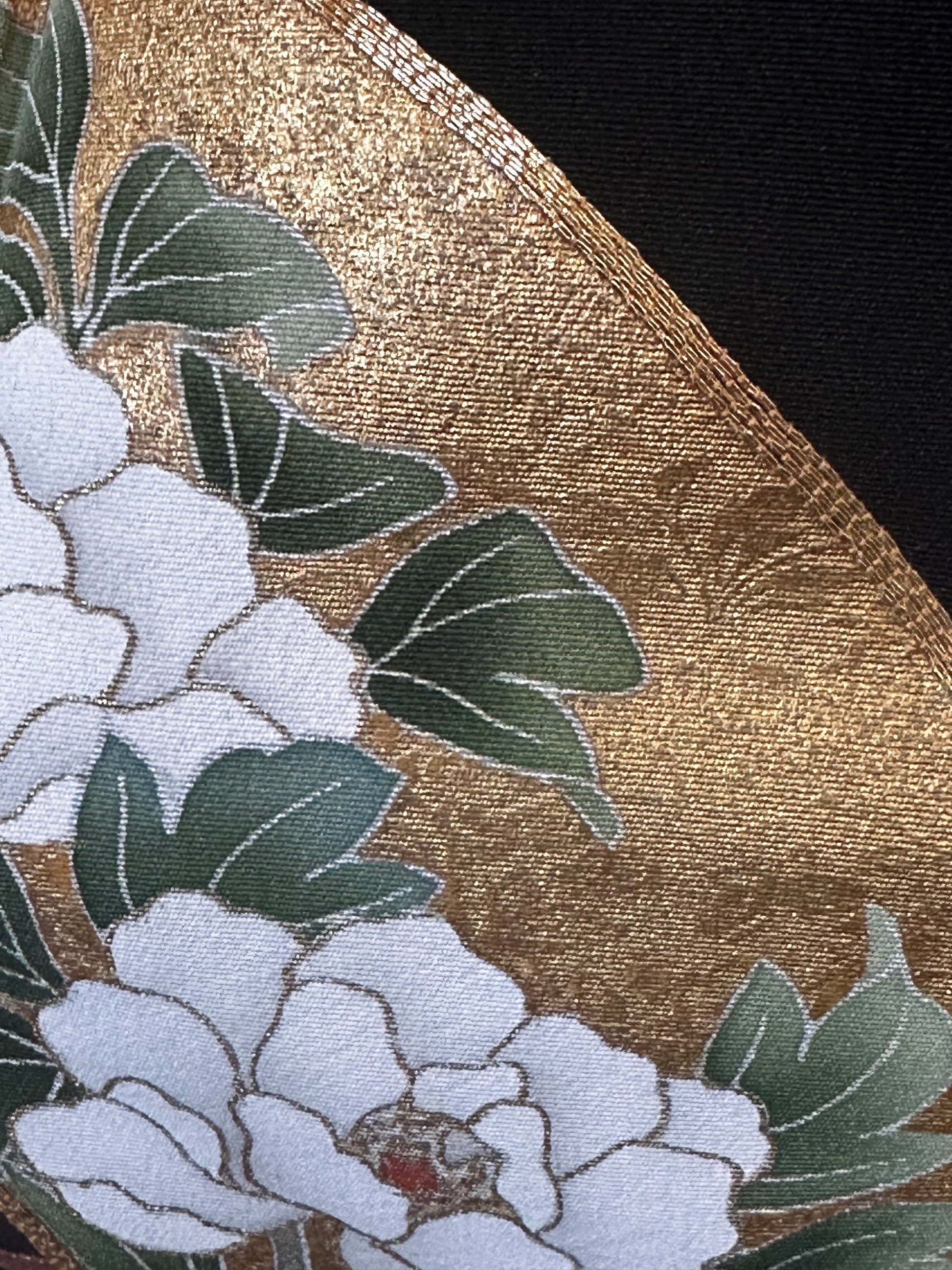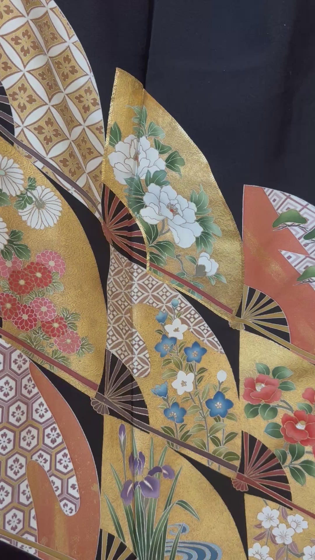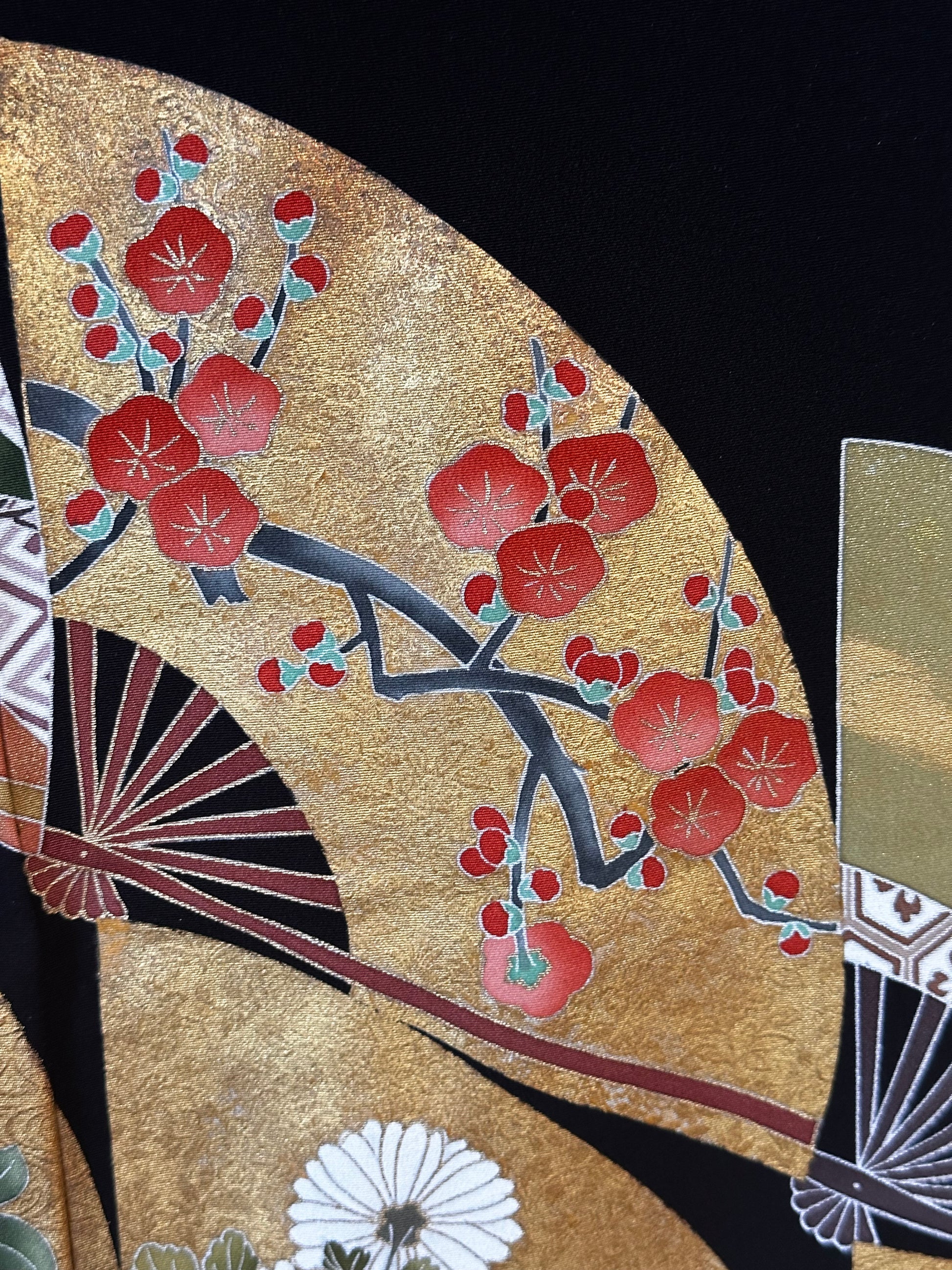Fabric: Made of rich silk, the kimono features hand-dyed yuzen artwork highlighted by touches of gold metallic thread embroidery and delicate gold accents throughout. The fans appear almost weightless against the deep black background, each one like a miniature painting of floral splendor.