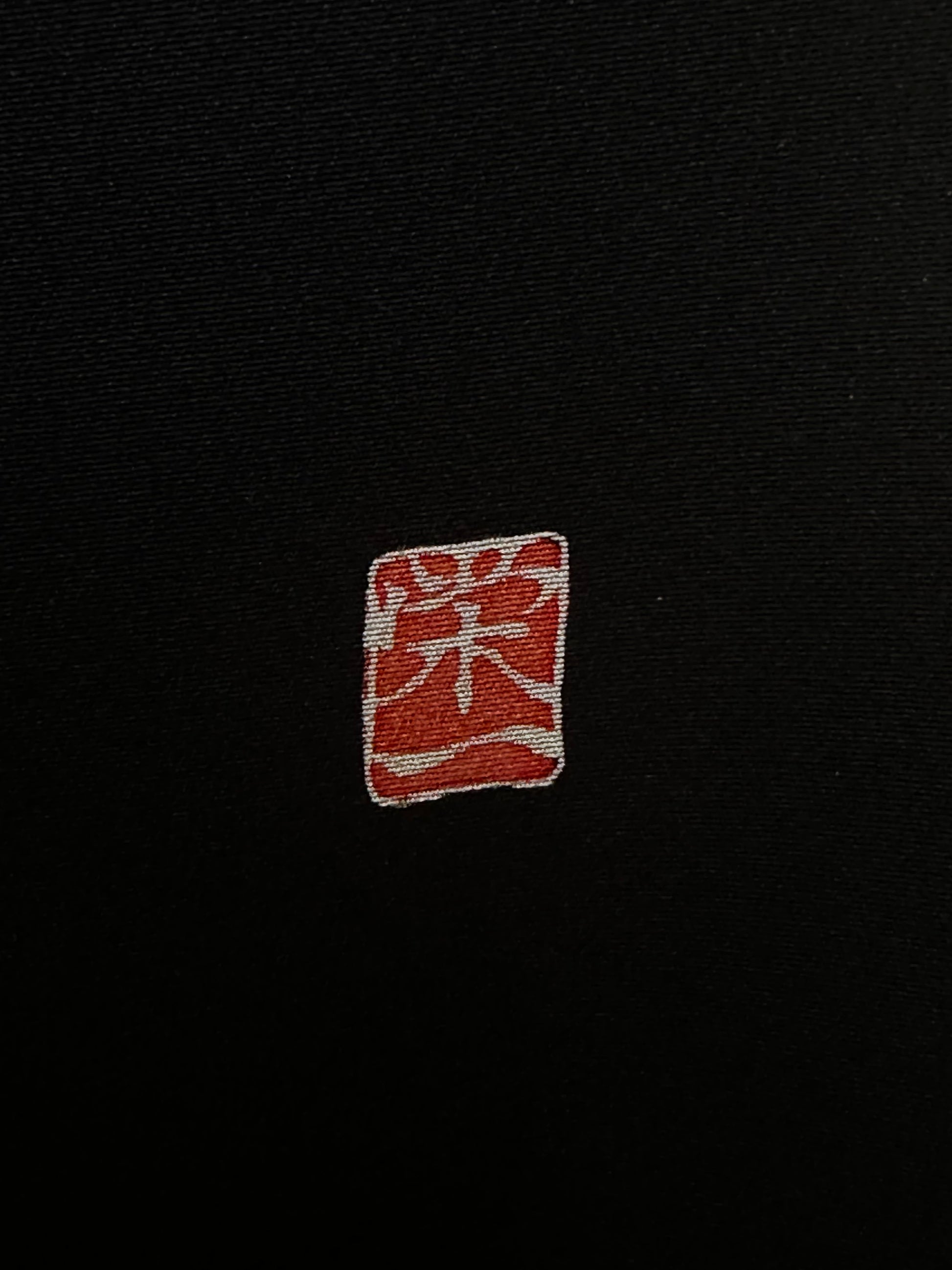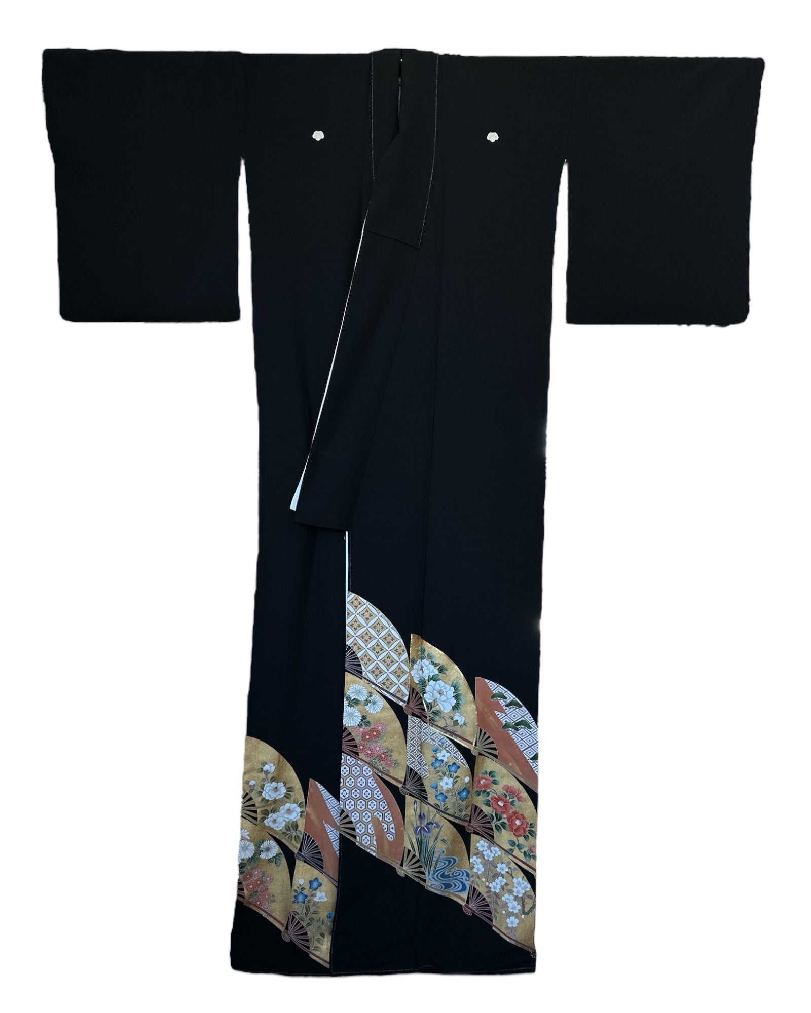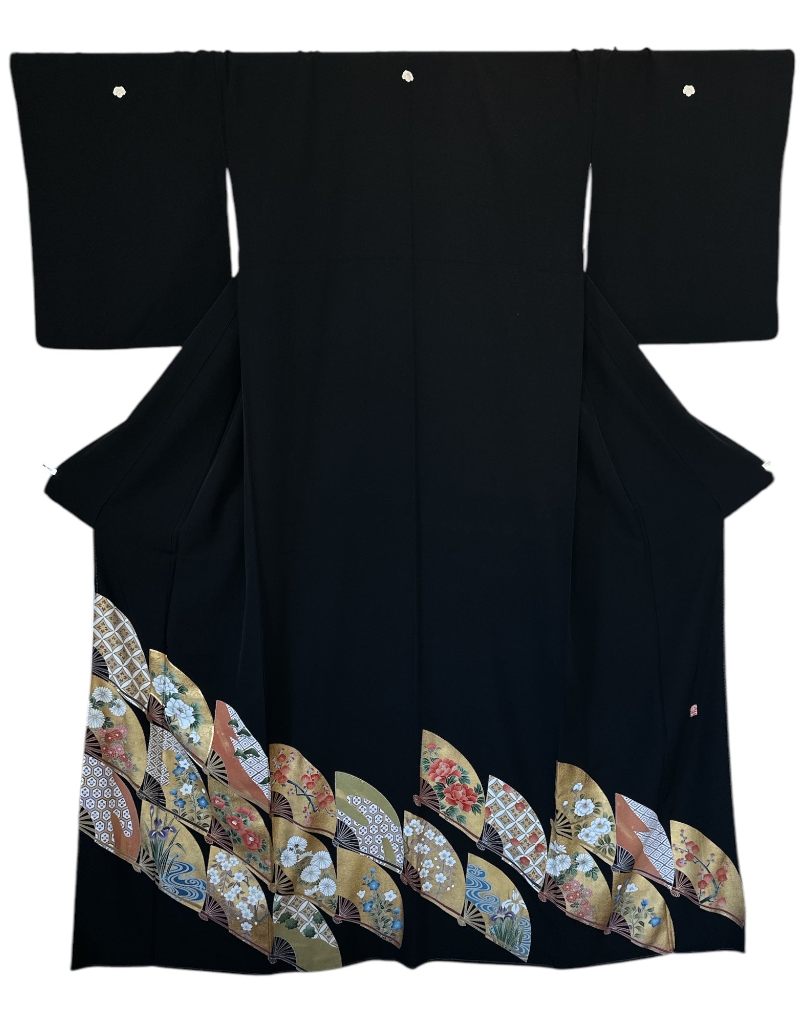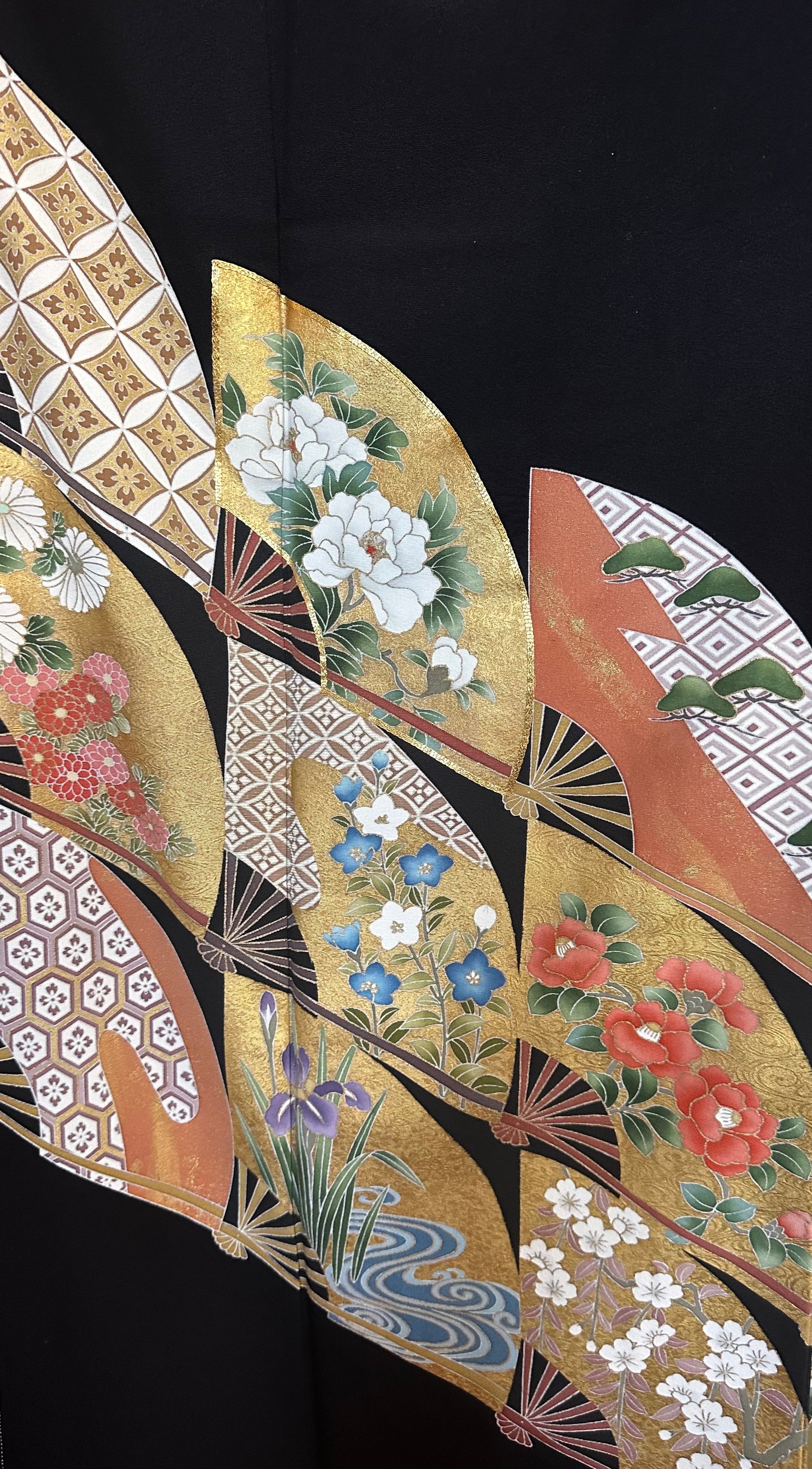 Description: A true celebration of nature’s full cycle, this kurotomesode kimono is a breathtaking display of seasonal beauty and artistic craftsmanship. The lower half of the kimono is adorned with a graceful scattering of open folding fans (sensu), each delicately painted with a distinct flower representing a season: iris for early summer, ume (plum)for winter’s end, sakura (cherry blossom) for spring, peony for late spring, chrysanthemum for autumn, and matsu (pine) for enduring strength and the New Year. The fans are rendered using the yuzen technique, with painterly precision and a masterful blend of color, creating a harmonious and luxurious composition.