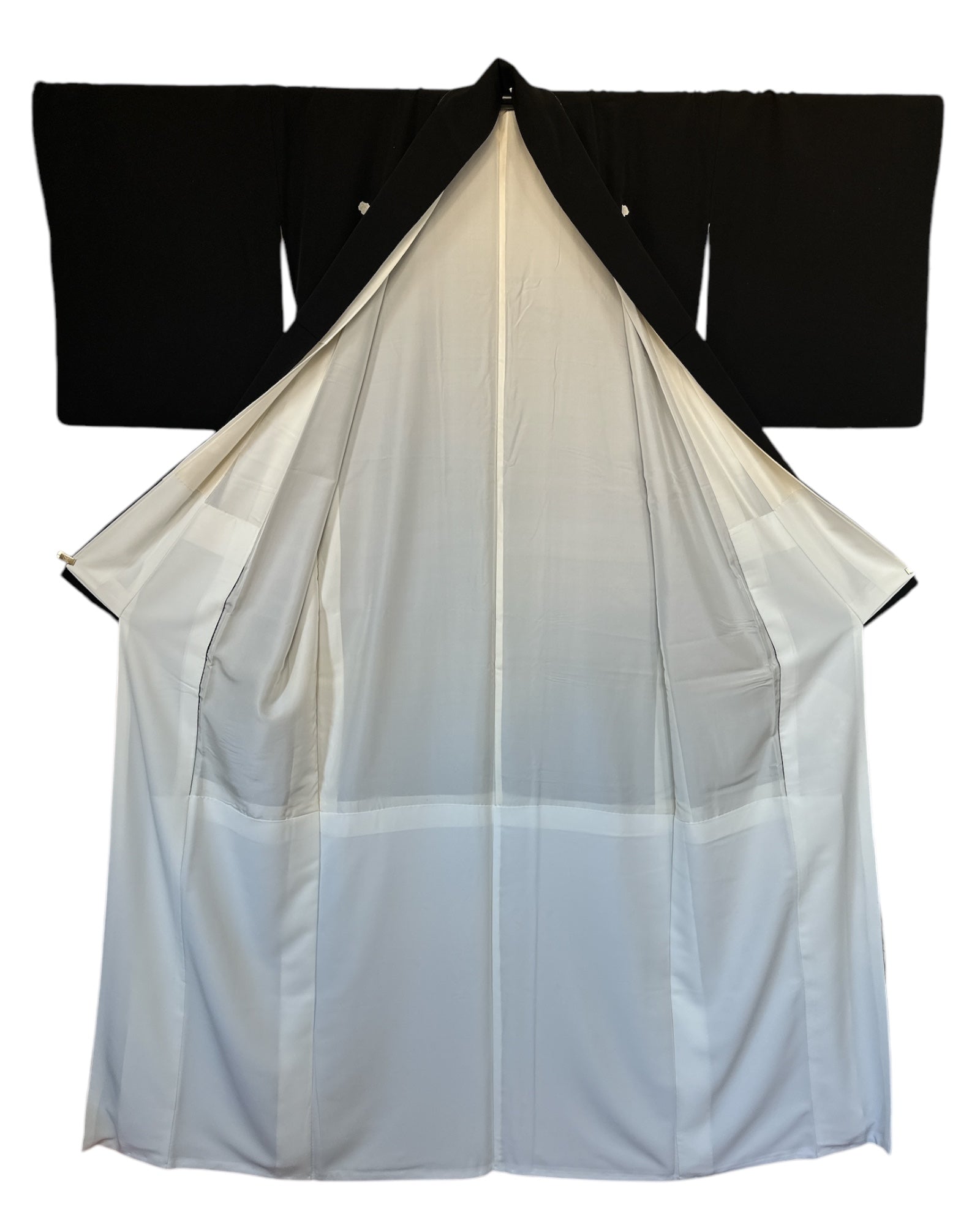 Style: A formal kurotomesode, traditionally worn by married women for the most prestigious occasions. This piece bears five white ivy kamon (family crests), signifying its high rank and formality. The elegant arrangement and symbolic motifs make this an ideal garment for weddings, ceremonies, or collection display.