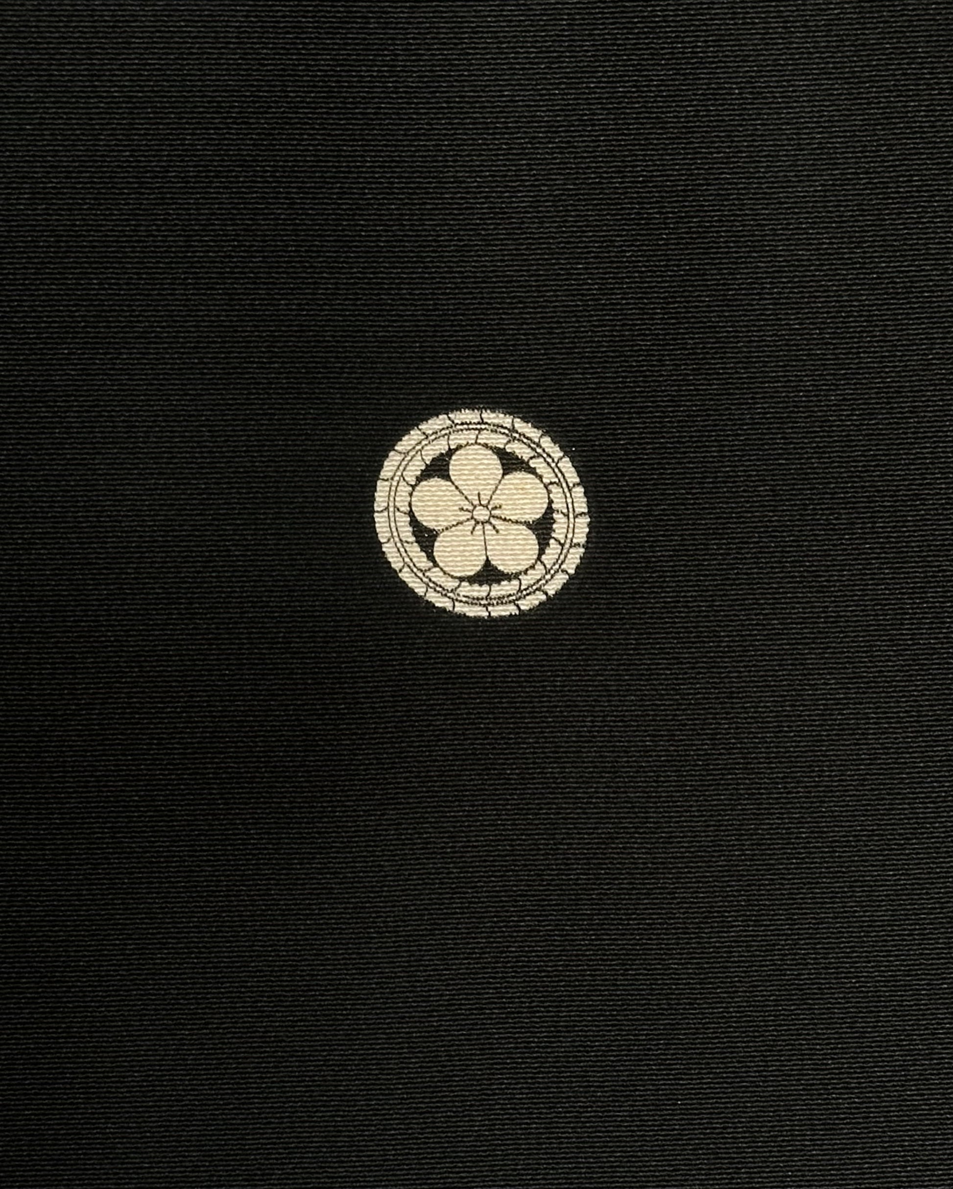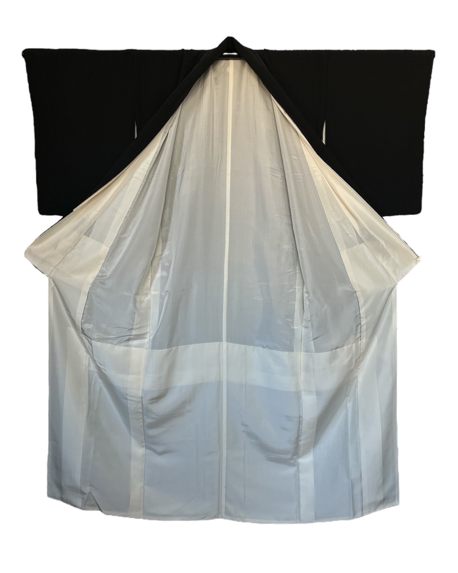 Style: This formal kurotomesode features a deep black upper field, traditionally worn by married women for formal occasions. It is adorned with five white ume (plum) family crests (kamon), a mark of high prestige and impeccable formality. The placement and contrast of the crests against the black silk enhance the garment’s elegance.