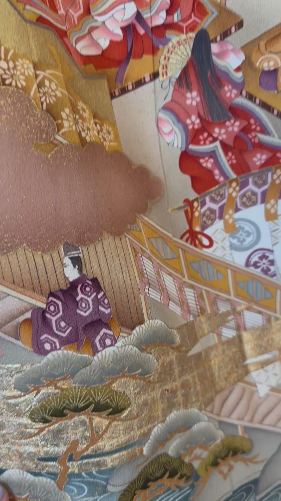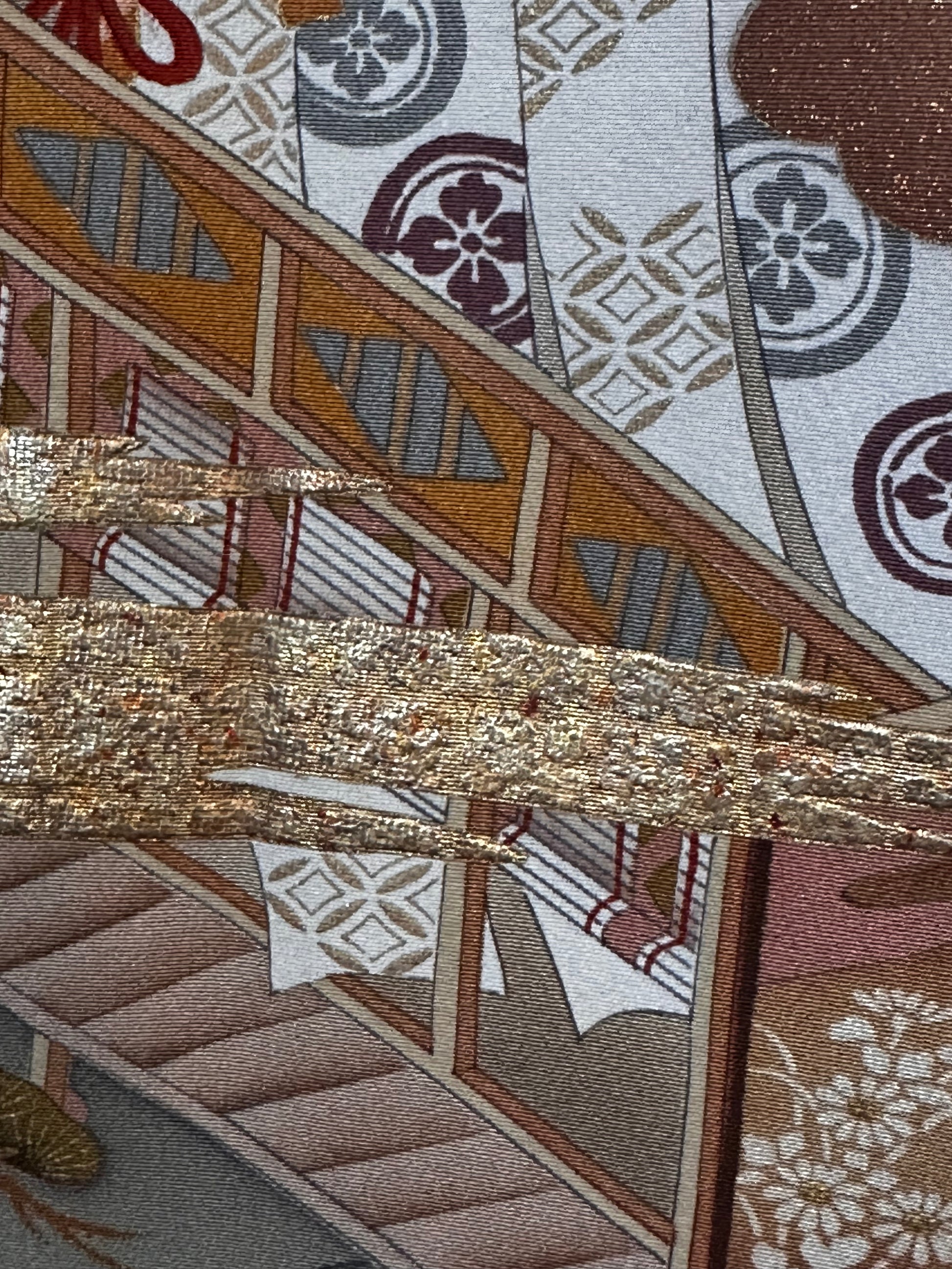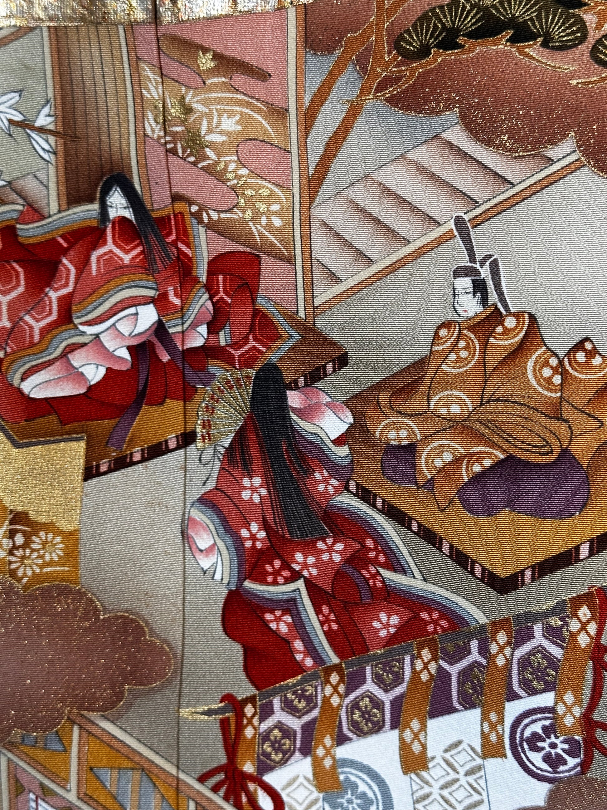 Fabric: Made from fine silk, this kimono showcases the celebrated yuzen dyeing technique, known for its painterly effect and detailed, hand-applied designs. The artistry is rich in color, depth, and texture, making the lower portion appear like a living painting that wraps around the body.