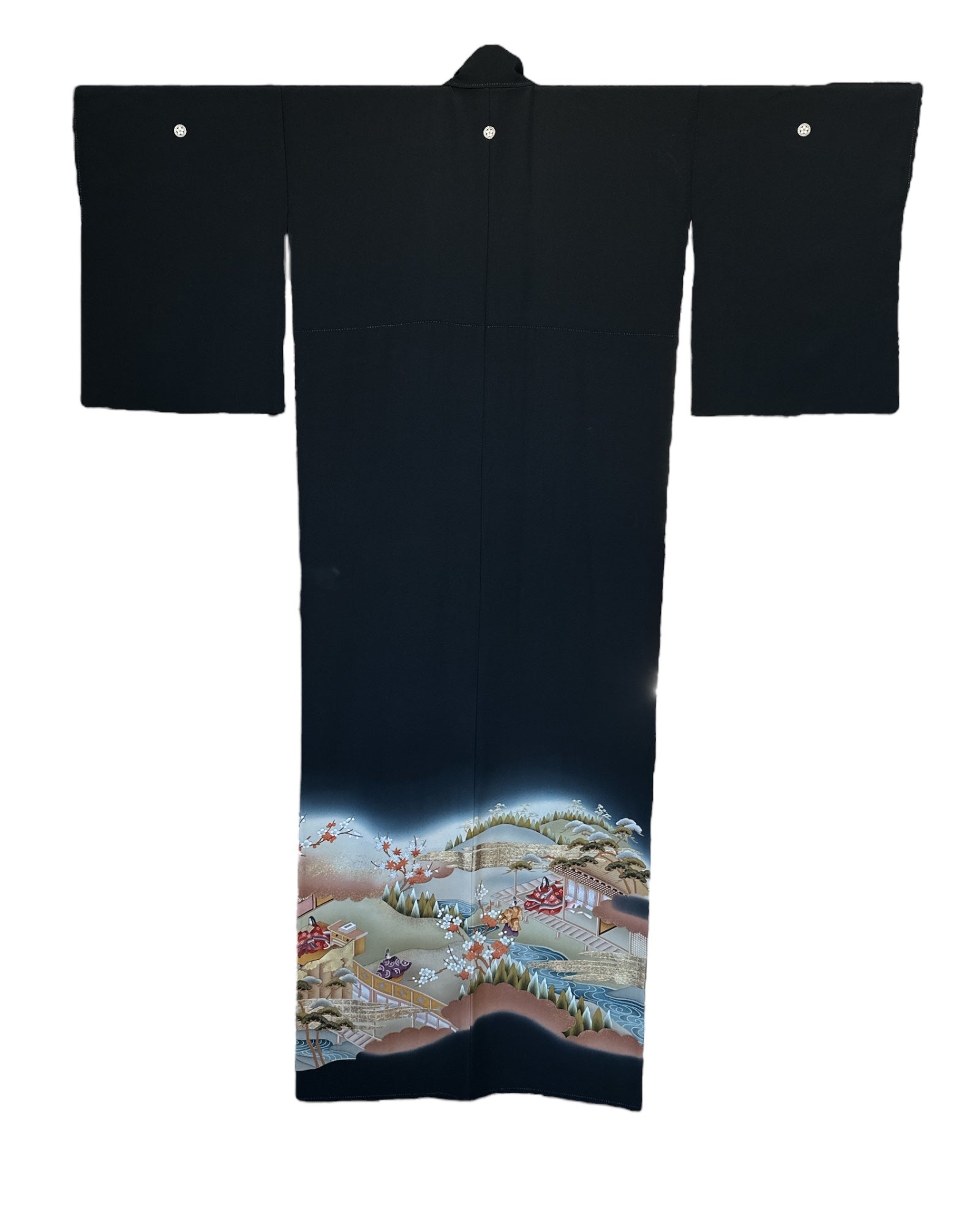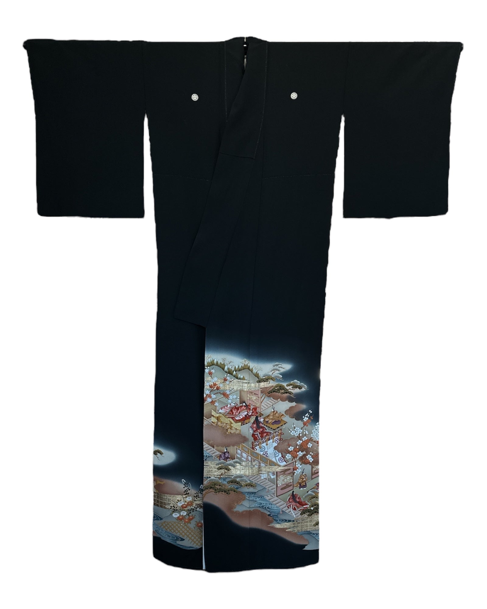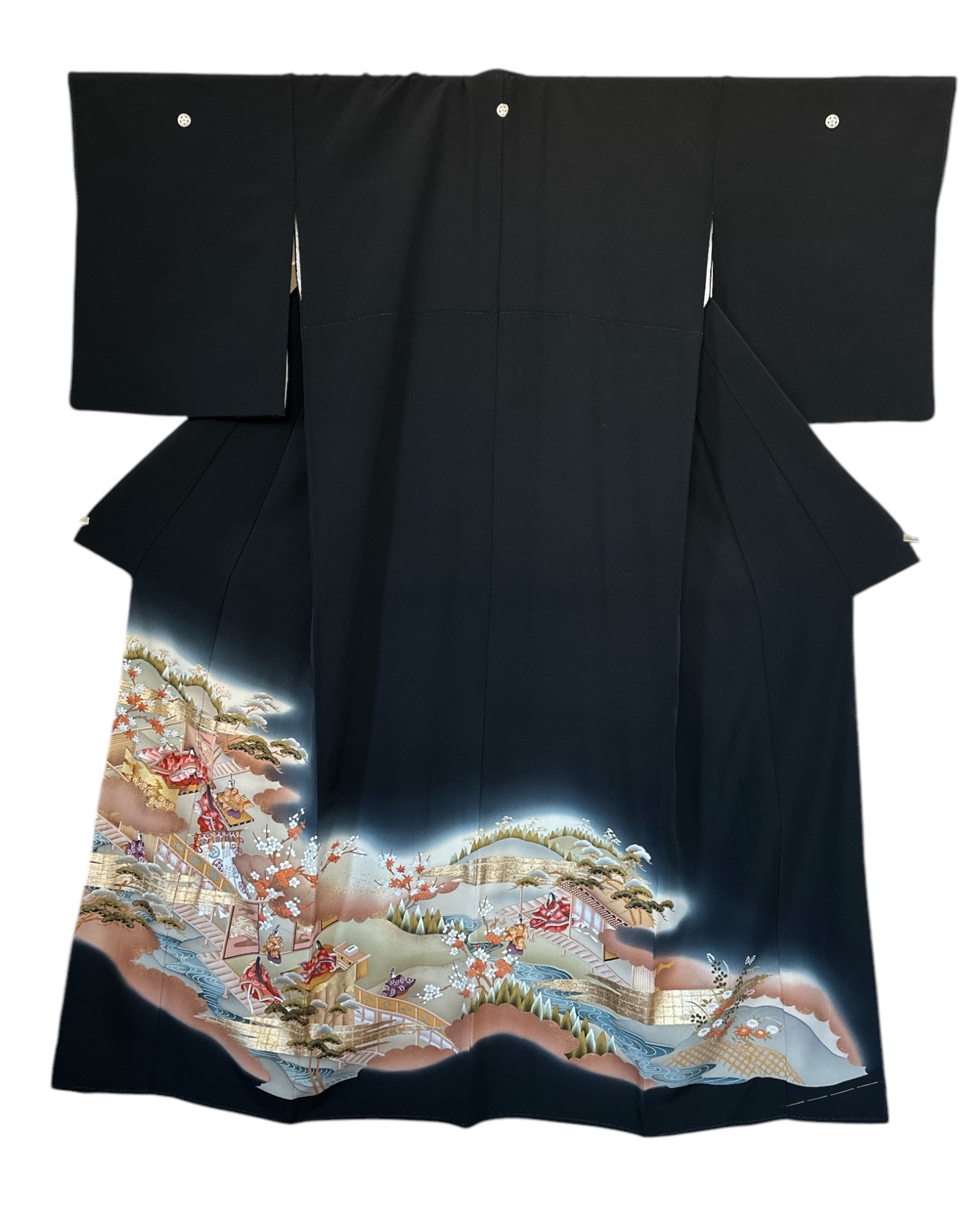Description: This refined kurotomesode kimono captures a stunning and intricate vision of courtly life in historical Japan, masterfully painted along the entire lower half. The scene features elegant noblewomen and dignified gentlemen dressed in traditional attire, gathered in and around a classic shogunate-style residence with open tatami rooms and wooden verandas. Surrounding them flows a serene river, with flourishing seasonal landscapes including towering matsu (pine trees), vibrant momiji (maple leaves), and the soft bloom of ume (plum blossoms). A majestic mountain backdrop and blooming gardens lend the entire composition a sense of poetic serenity and timeless grace.