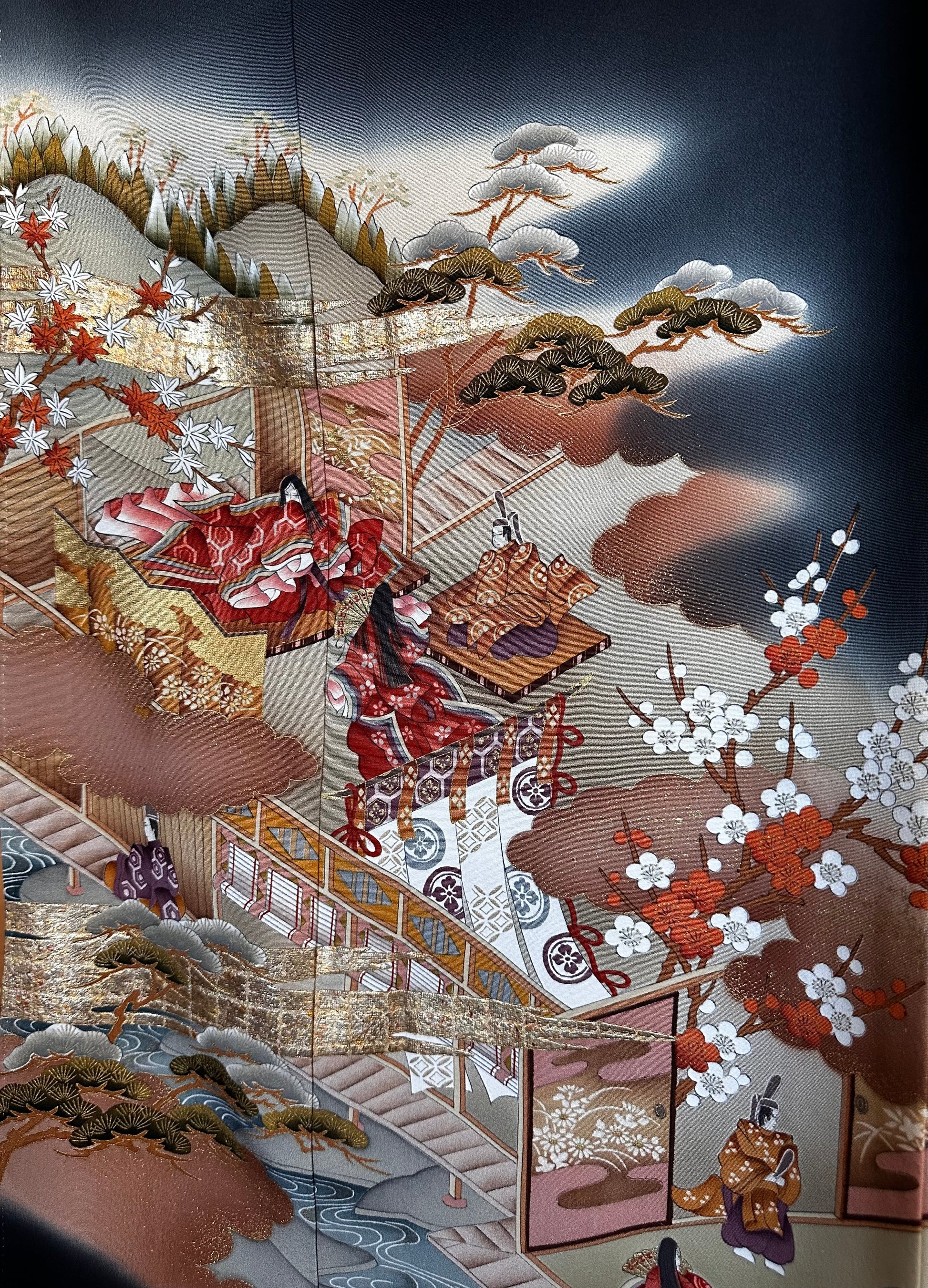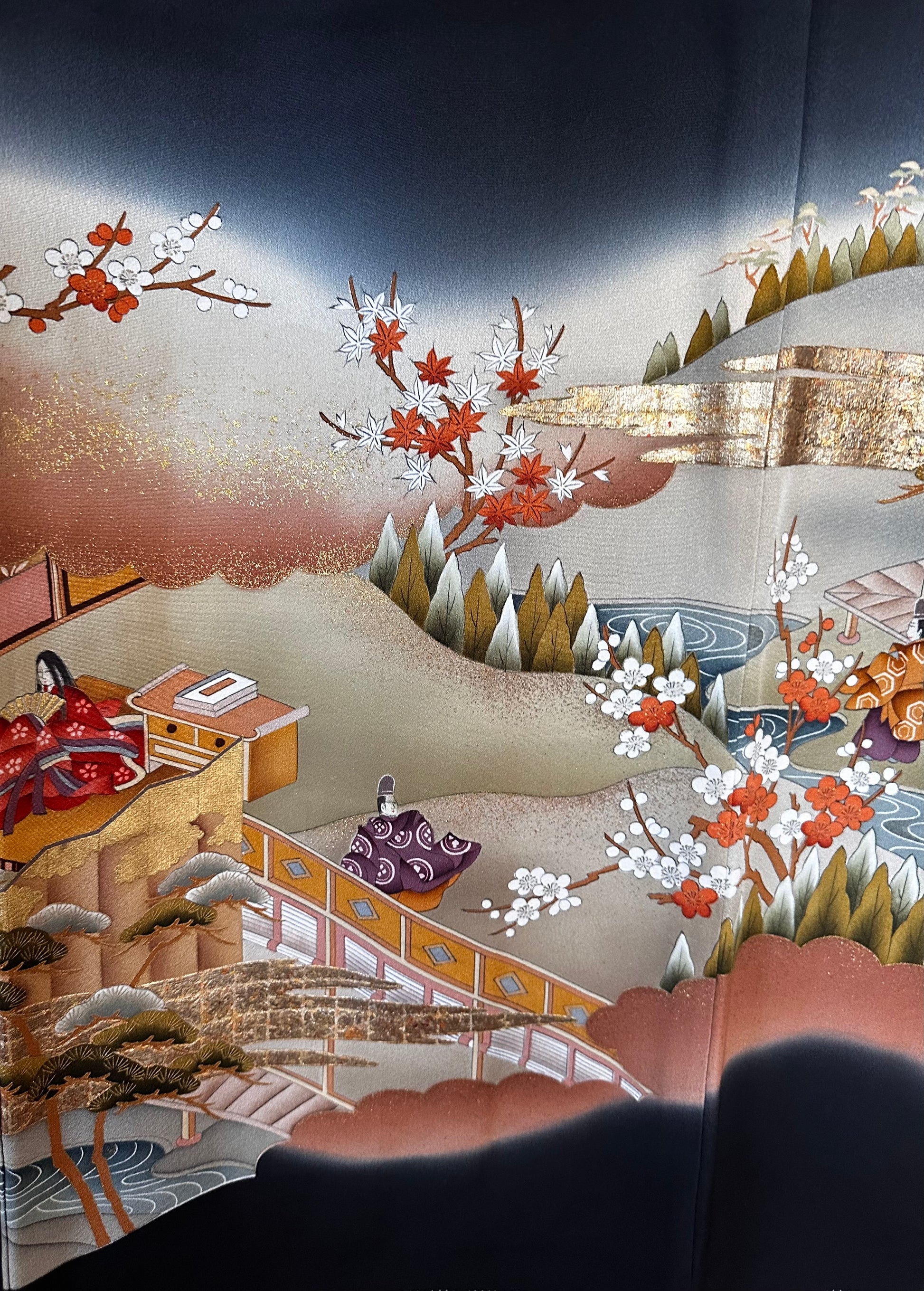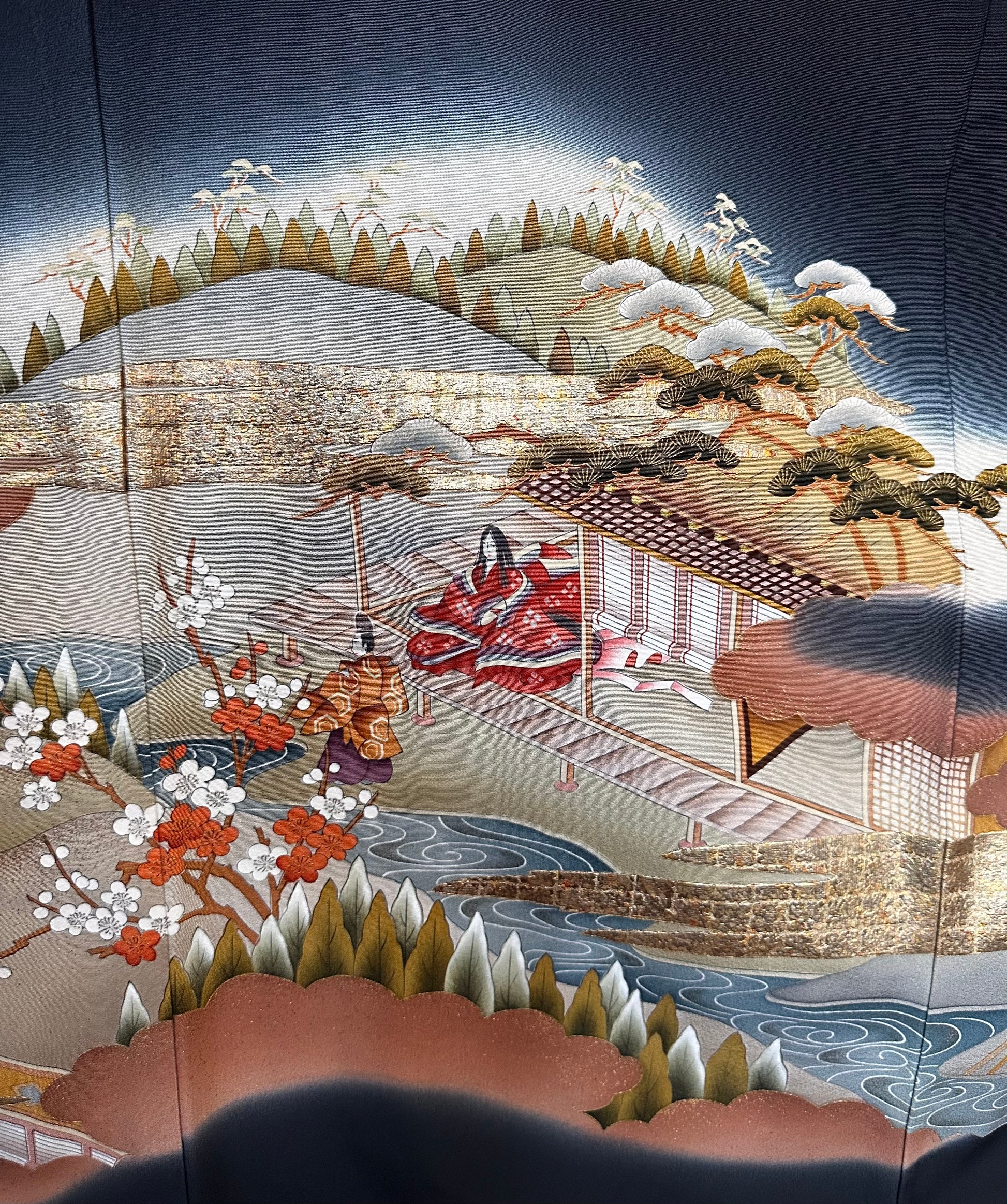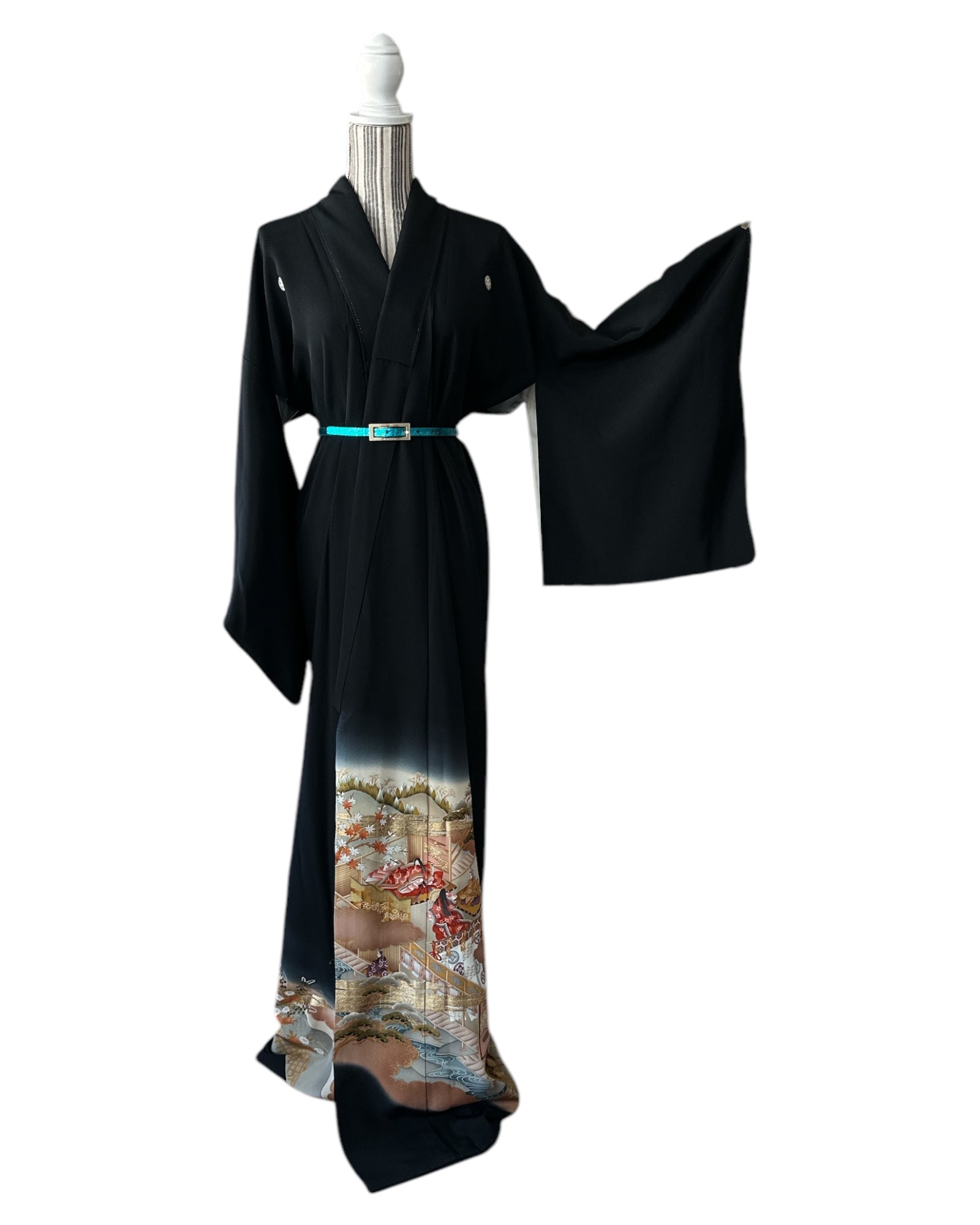 Description: This refined kurotomesode kimono captures a stunning and intricate vision of courtly life in historical Japan, masterfully painted along the entire lower half. The scene features elegant noblewomen and dignified gentlemen dressed in traditional attire, gathered in and around a classic shogunate-style residence with open tatami rooms and wooden verandas. Surrounding them flows a serene river, with flourishing seasonal landscapes including towering matsu (pine trees), vibrant momiji (maple leaves), and the soft bloom of ume (plum blossoms). A majestic mountain backdrop and blooming gardens lend the entire composition a sense of poetic serenity and timeless grace.
