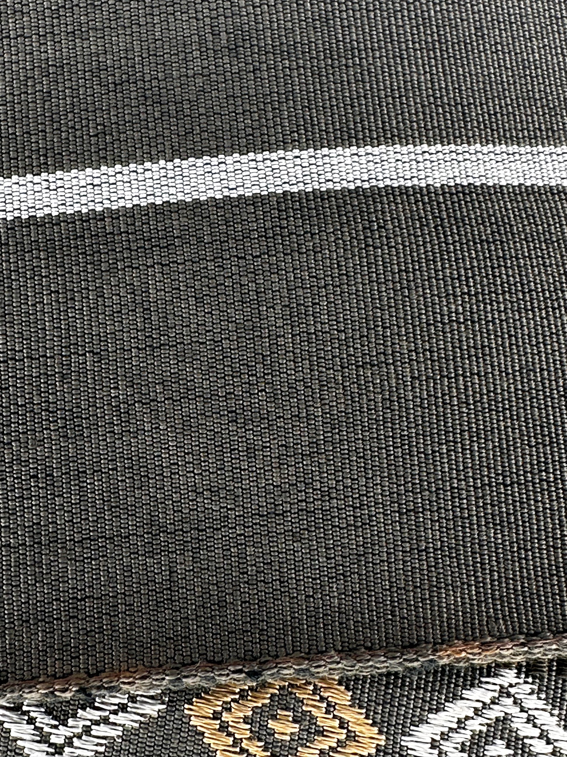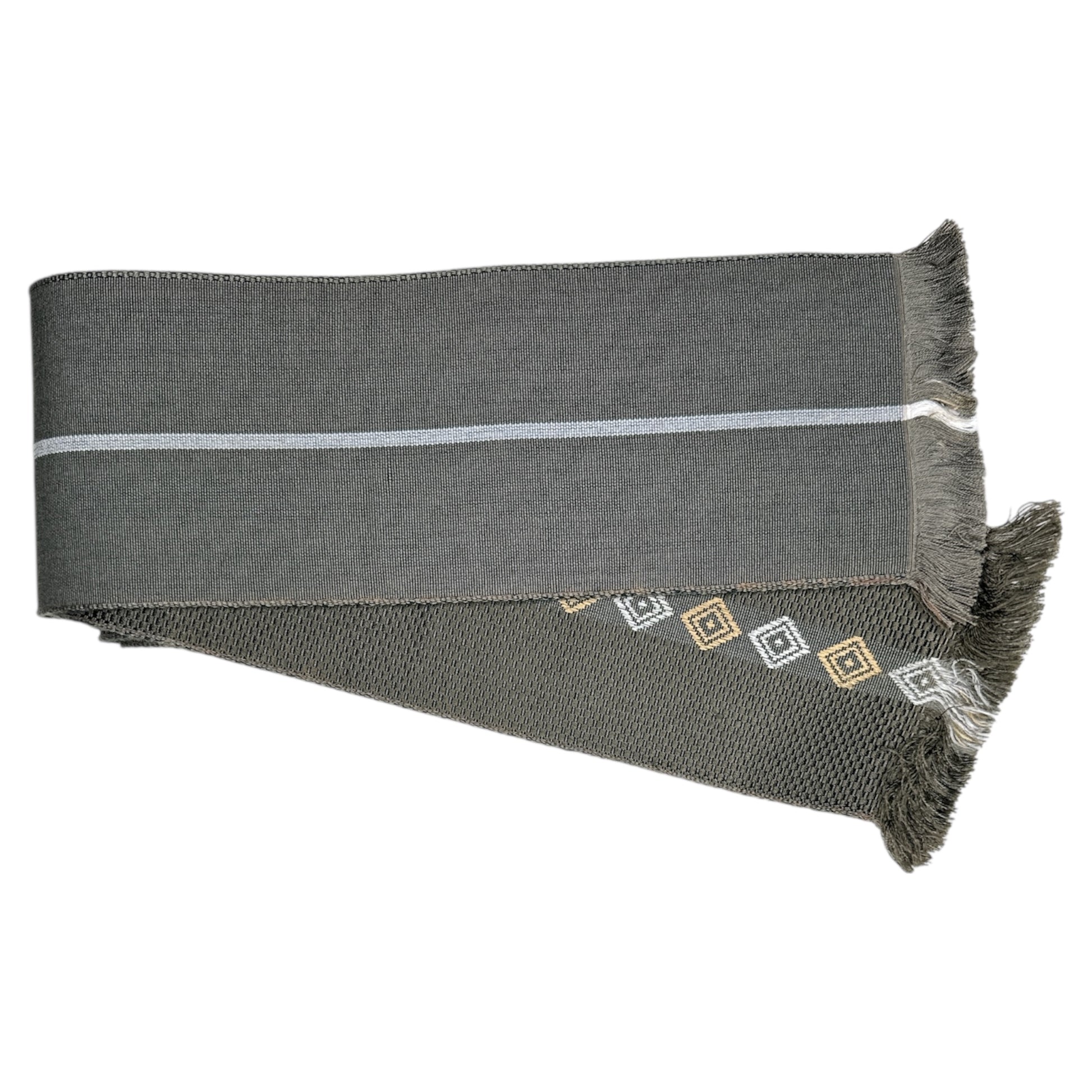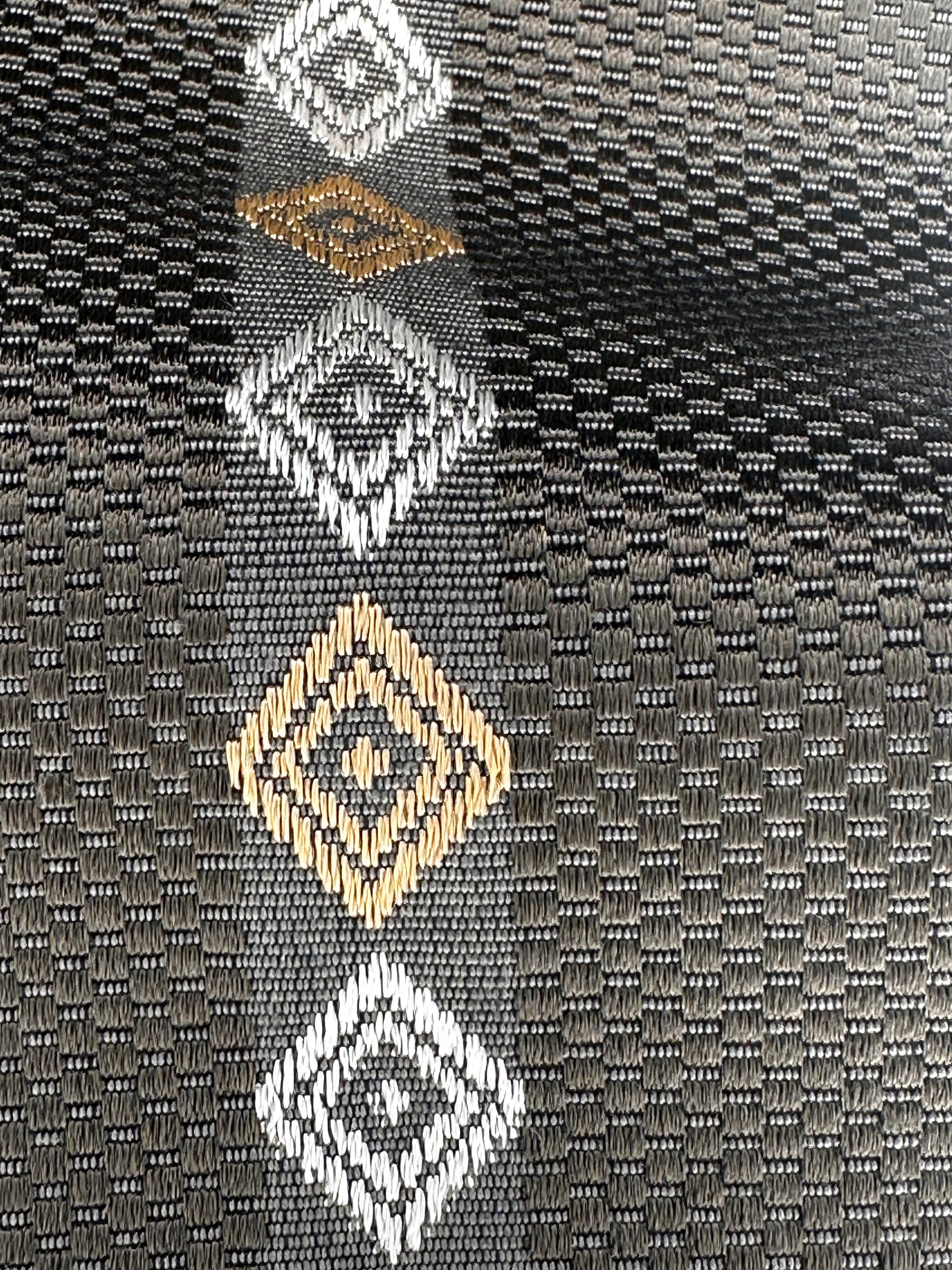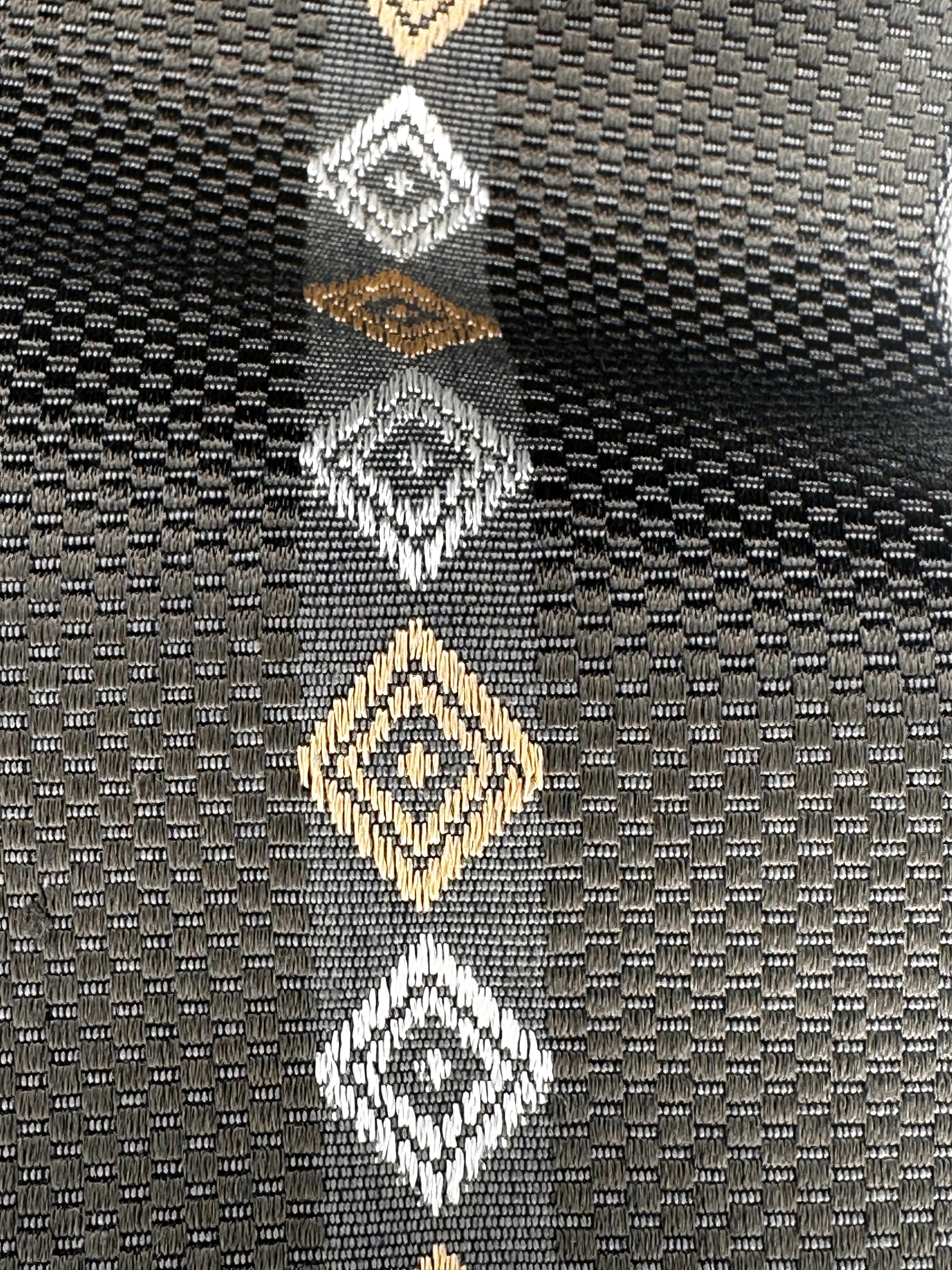 Description: This elegant men’s reversible Kaku obi is crafted from high-quality woven fabric, offering a soft, comfortable texture while maintaining a structured drape. One side features a striking series of diamond motifs running horizontally along the length of the obi, alternating between white/silver and gold/yellowish tones set against a rich dark olive background, creating a refined and sophisticated visual effect. The reverse side offers a more understated look, with a delicate single white line running the length of the obi, allowing for versatile styling options. Both ends are finished with neat fringes, adding a subtle traditional touch. Perfect for pairing with kimono, yukata, or hakama, this obi is suitable for formal occasions, ceremonies, and traditional wear.