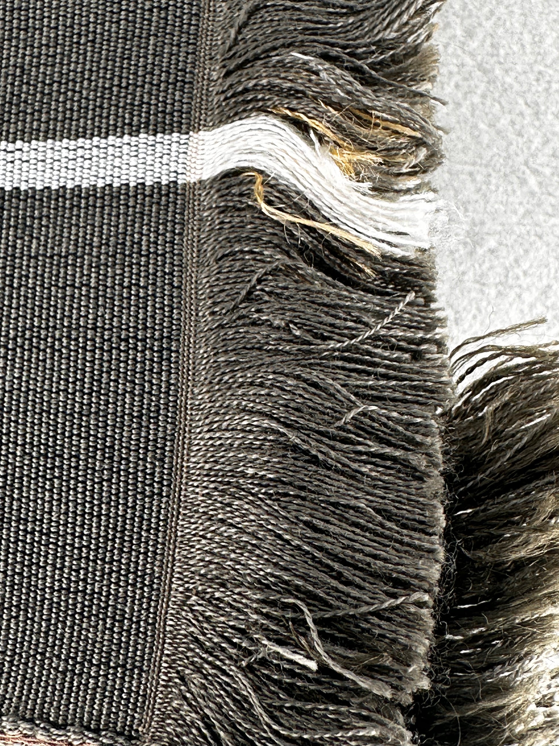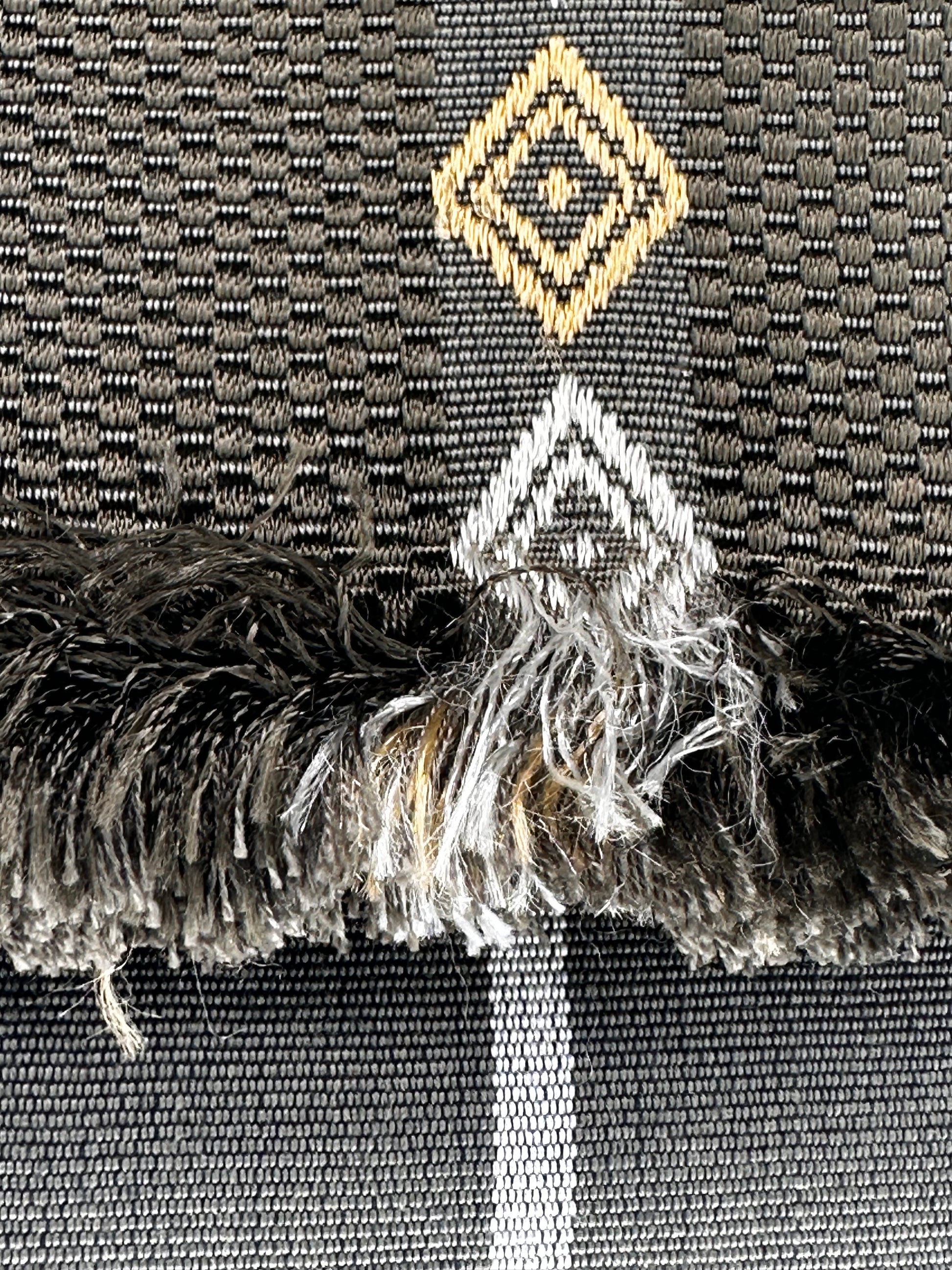 Style: Reversible Kaku obi in dark olive, featuring bold diamond motifs on one side and a minimalist white line on the reverse, offering two distinct styling options in a single piece. Fringed ends add a classic, traditional detail.