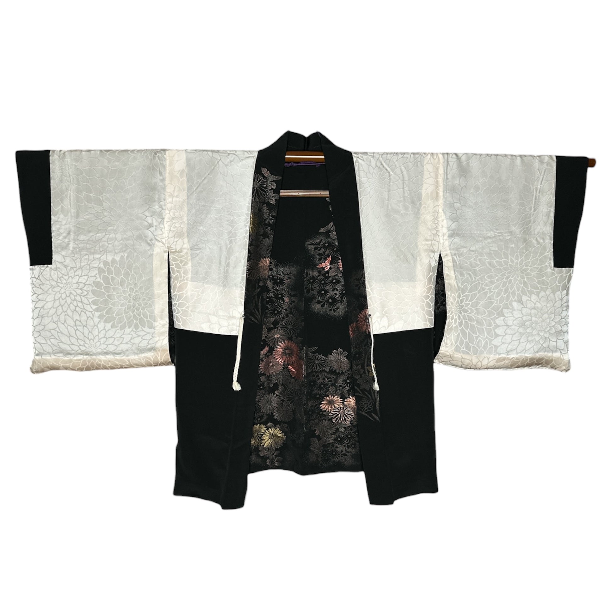 The interior is lined with butter-colored rinzu silk, adorned with subtle chrysanthemum motifs, providing a refined and harmonious contrast. The haori is finished with traditional haori himo (decorative haori ties), preserving its authentic form.