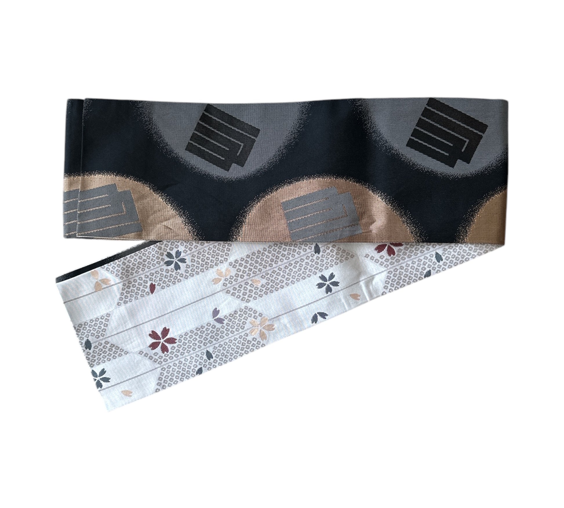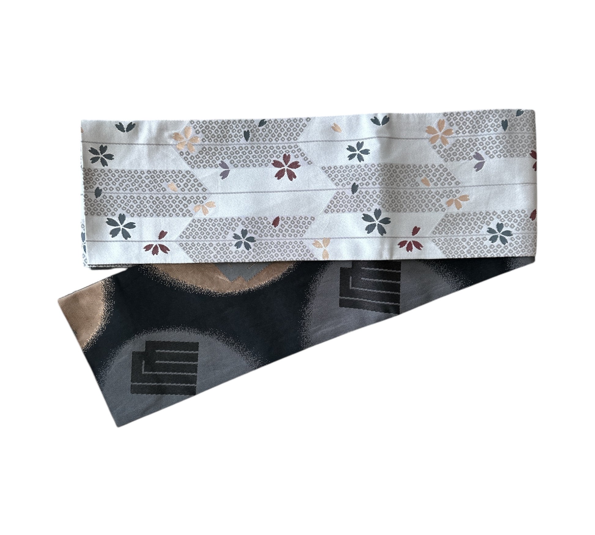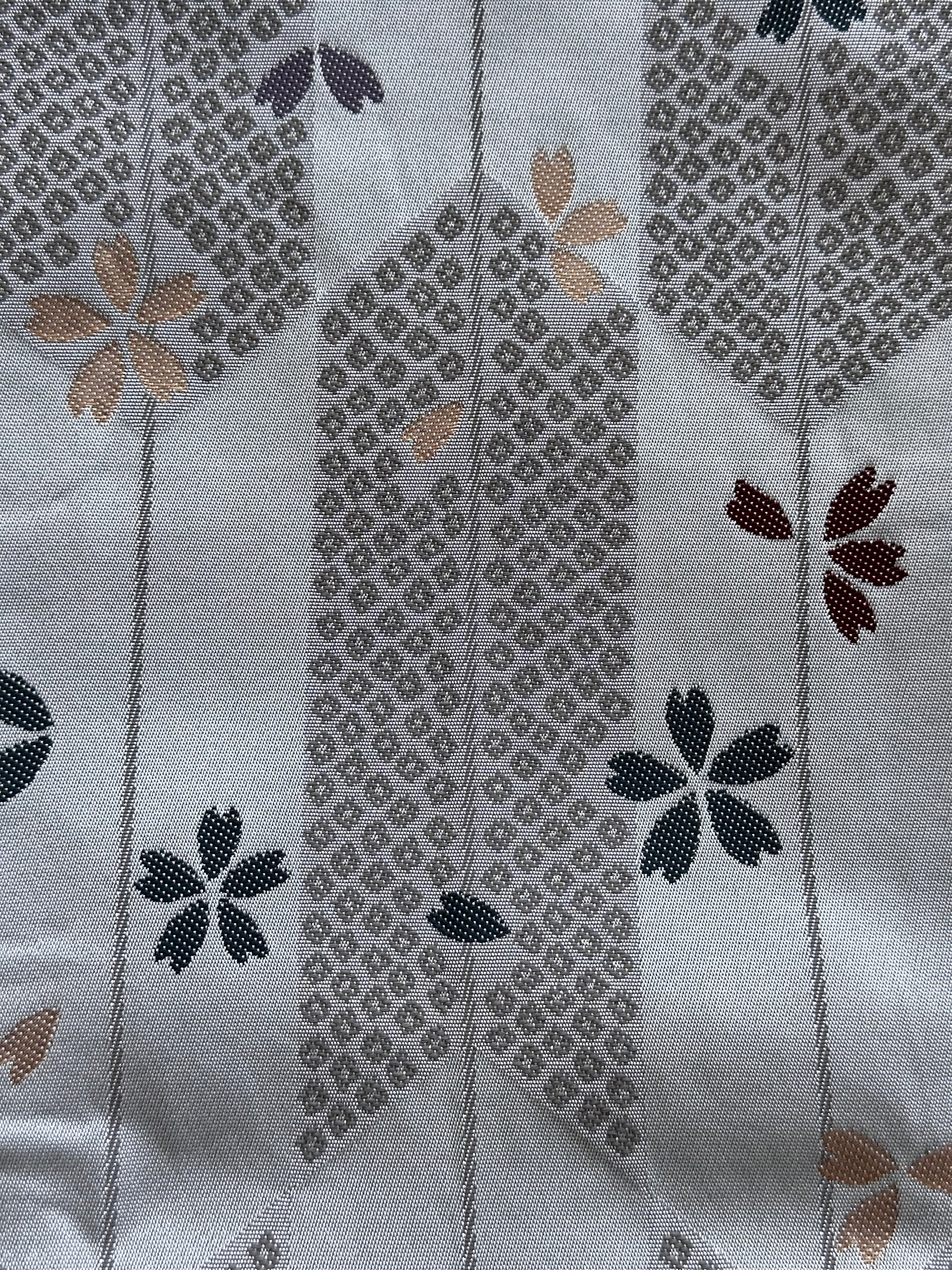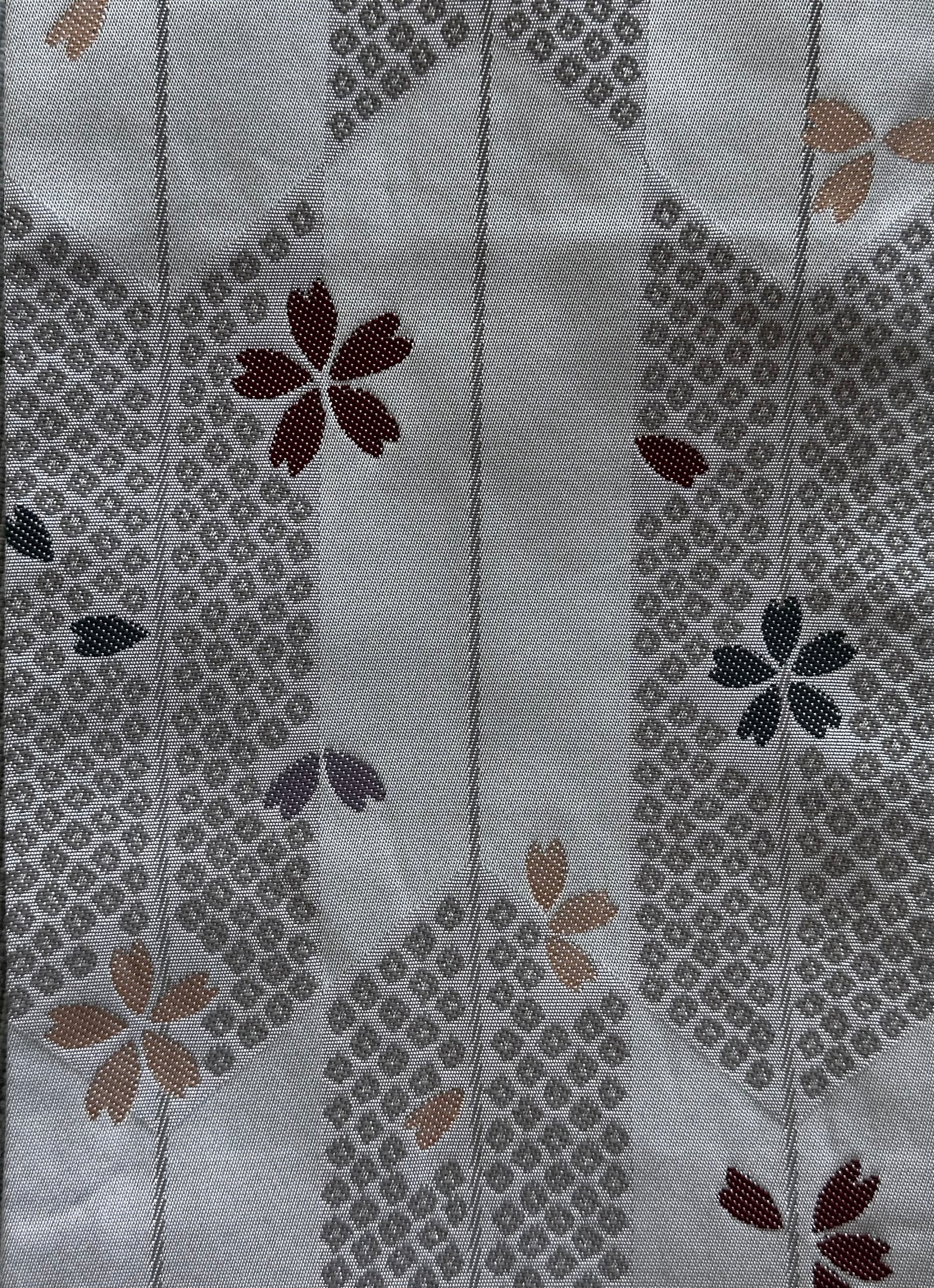 Description: This striking hanhaba obi blends modern design with rich tradition. The reverse side offers a seasonal contrast, featuring delicate sakura blossoms over yagasuri (arrow-feather) motifs, symbolising renewal and strength. Interwoven is the Genjiko pattern, a nod to Heian-era culture, represented by five subtle, fan-like shapes.